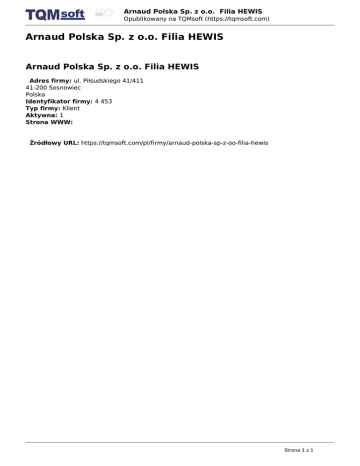 Arnaud Polska Sp. z o.o. Filia HEWIS Opublikowany na TQMsoft (https://tqmsoft.com) Arnaud Polska Sp. z o.o. Filia HEWIS Arnaud Polska Sp. z o.o. Filia HEWIS Adres firmy: ul. Piłsudskiego 41/411 41-200 Sosnowiec Polska Identyfikator firmy: 4 453 Typ firmy: Klient Aktywna: 1 Strona WWW: Źródłowy URL: https://tqmsoft.com/pl/firmy/arnaud-polska-sp-z-oo-filia-hewis Strona 1 z 1