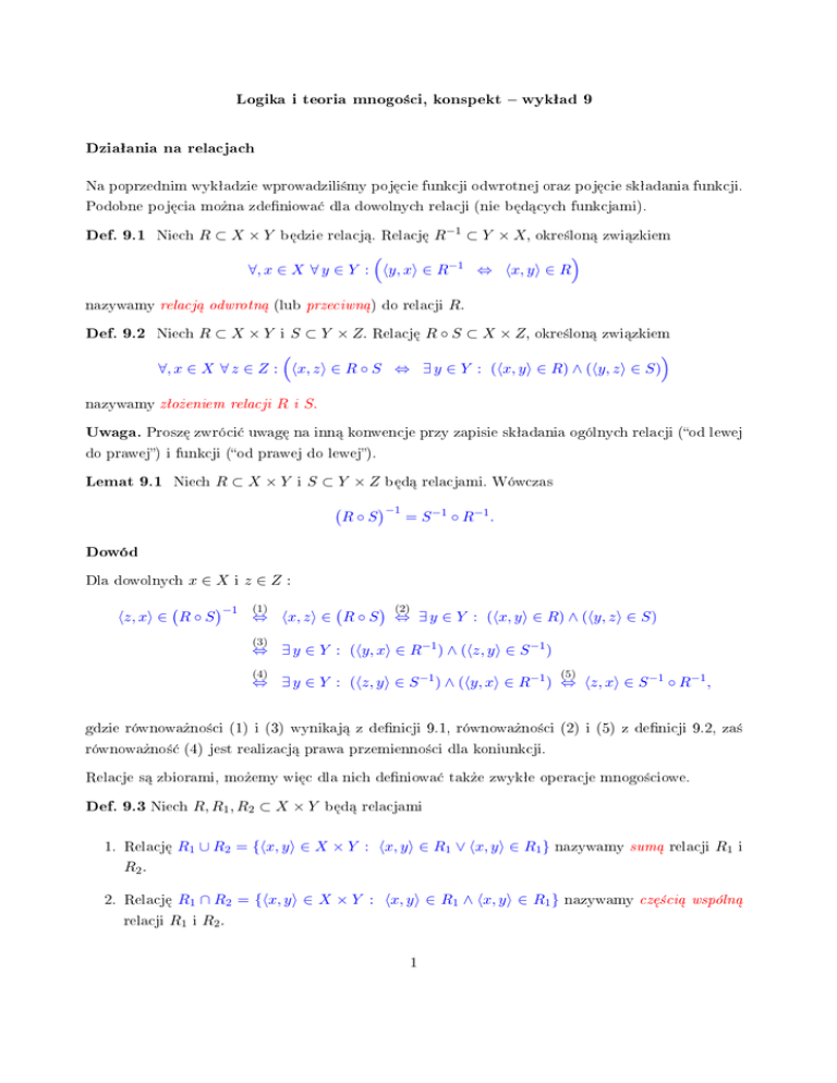 Logika i teoria mnogo±ci, konspekt wykªad 9 Dziaªania na relacjach