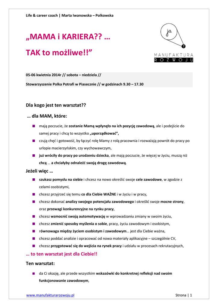 Life & career coach | Marta Iwanowska – Polkowska „MAMA i KARIERA?? … TAK to możliwe!!” 05-06 kwietnia 2014r // sobota – niedziela // Stowarzyszenie Polka Potrafi w Piasecznie // w godzinach 9.30 – 17.30 Dla kogo jest ten warsztat?? … dla MAM, które: ■ mają poczucie, że zostanie Mamą wpłynęło na ich pozycję zawodową, ale i podejście do samej pracy i chcą to wszystko „uporządkować”, ■ czują chęć i gotowość, by łączyć rolę Mamy z rolą pracownia i rozważają powrót do pracy po urlopie macierzyńskim, czy wychowawczym, ■ już wróciły do pracy po urodzeniu dziecka, ale mają poczucie, że więcej w życiu, muszą niż chcą … a chciałyby odnaleźć swoją drogę zawodową. Jeżeli więc … ■ szukasz pomysłu na siebie i chcesz na nowo określić swoje cele zawodowe, w zgodzie z celami osobistymi, ■ chcesz przyjrzeć się temu co dla Ciebie WAŻNE i w życiu i w pracy, ■ chcesz dokonać analizy swojego potencjału zawodowego i określić swoje mocne strony, oraz przewagi konkurencyjne na rynku pracy, ■ chcesz wzmocnić swoją automotywację w wprowadzaniu zmiany w swoim życiu, ■ chcesz zmienić sposoby myślenia o sobie, pracy, życiu zawodowym i osobistym, ■ równowaga między życiem osobistym i zawodowym… jest dla Ciebie ważna, ■ chcesz poddać analizie i opracować od nowa materiały aplikacyjne – szczególnie CV, ■ chcesz przygotować się do wejścia na rynek pracy i udziału w procesach rekrutacyjnych, … to ten warsztat jest dla Ciebie!! Ten warsztat: ■ da Ci okazję, ale przede wszystkim wskazówki do konkretnej refleksji nad swoim funkcjonowanie zawodowym, www.manufakturarozwoju.pl Strona | 1 Life & career coach | Marta Iwanowska – Polkowska ■ pozwoli zadać sobie ważne, a czasem trudne pytania, o siebie, swoje cele i swoją przyszłość zawodową, ■ zachęci, by „uporządkować” swoją karierę zawodową uwzględniając najważniejszą rolę, rolę Mamy, ■ zabierze Ciebie w „podróż” w kierunku kariery. Kariery rozumianej jako sposób urzeczywistniania Twoich talentów, cech, umiejętności i celów… po prostu Ciebie!!. I przez te dwa dni będziesz mogła myśleć tylko o sobie, swoich celach, oczekiwaniach i marzeniach. Informacje organizacyjne: ■ 16 godzin z przerwami na kawę i lunch, ■ w godzinach 9.30 – 17.30 // sobota i niedziela, ■ miejsce: Stowarzyszenia Polka Potrafi.pl, ul. Młynarska 19 lokal 103, Piaseczno. ■ Uwaga, warto na zajęcia przynieść swoje aktualne CV. Nawet jeżeli w Twojej opinii jest niedoskonałe, warsztat da okazję, by je uporządkować i udoskonalić. Ważne!!: Liczba miejsc ograniczona! Warsztat będzie prowadzony w kameralnej grupie do 8 osób, zapewniające indywidualne podejście do wszystkich Uczestniczek. Warsztat poprowadzi Marta Iwanowska – Polkowska, career & life coach, trener biznesu, konsultant HR. Z wykształcenia psycholog i doradca kariery. Od ponad 10 lat aktywnie wspiera osoby pracujące, szukające pracy, czy chcące zmienić pracę w znalezieniu swojej ścieżki kariery .. WŁASNEJ drogi, która będzie ich rozwijać i zawodowo i osobiście. Szczęśliwa mama dwóch kilkuletnich chłopców – swoich „osobistych trenerów” równowagi między życiem osobistym a zawodowym ☺. Żona jednego męża. Kobieta przedsiębiorcza, prowadząca własną firmę szkoleniowo – doradczą (www.navigogrupa.com). Więcej informacji na: ■ www.manufakturarozwoju.pl // tu w zakładce „O mnie” i „Opinie” znajdziesz więcej informacji o mnie, mojej pracy, a także opinie moich Klientów. www.manufakturarozwoju.pl Strona | 2 Life & career coach | Marta Iwanowska – Polkowska ■ oraz na Facebook’u https://www.facebook.com/ManufakturaRozwoju?hc_location=timeline ■ oraz na stronie International Coach Federation http://www.icf.org.pl/pl,c852,marta-iwanowskapolkowska.html oraz Izby Coachingu http://www.izbacoachingu.com/pl/members.html?memberid=200 Zapisy i pytania : [email protected] // tel. 0 607 639 560. Warsztat jest płatny. Koszt uczestniczenia w dwudniowych zajęciach, dla jednej osoby, to 490 pln (cena uwzględnia podatek VAT). W przypadku zgłoszenia do 30 marca – zniżka!! - koszt warsztatu wynosi 420 pln (z VAT) /czyli ok 15% taniej ☺ Cena uwzględnia: ■ indywidualne podejście do każdej Uczestniczki. Przed warsztatem skontaktuję się z każdą z Uczestniczek, by poznać jej oczekiwania i aktualną sytuację zawodową. Pozwoli to nam zbudować kontakt, a mi przygotować się lepiej do warsztatów. ■ analizę Twojego CV – zindywidualizowaną informację zwrotną po zajęciach. Po zajęciach pozostaniemy w kontakcie e-mailowy, tak by CV zostało dopracowane zgodnie z Twoimi celami i oczekiwaniami rynku pracy ■ udział w dwudniowych, inspirujących zajęciach, ■ materiały szkoleniowe, dla każdej Uczestniczki, ■ serwis kawowy. Zapisy: ■ Krok 1: wyślij maila, na adres: [email protected] . Bądź zadzwoń 0 607 639 560. ■ Krok 2: po zgłoszeniu otrzymasz formularz zgłoszeniowy, ■ Krok 3: podstawą potwierdzenia zgłoszenia jest wpłacenie zaliczki w wysokości 100 pln, ■ Krok 4: wystawiona zostanie Faktura VAT. www.manufakturarozwoju.pl Strona | 3