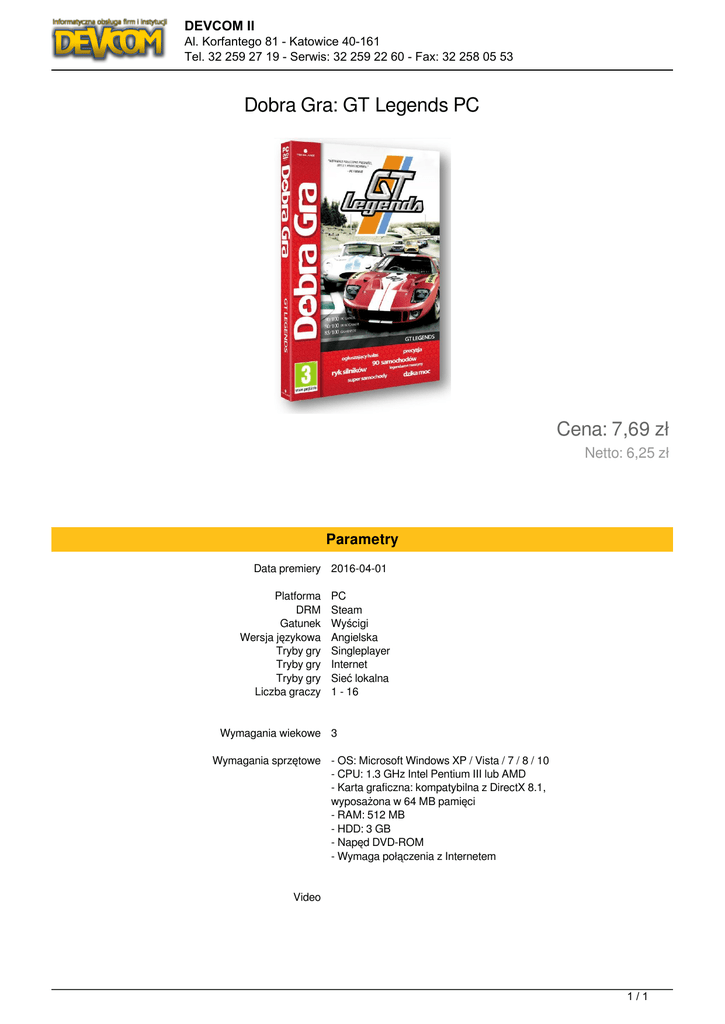 DEVCOM II Al. Korfantego 81 - Katowice 40-161 Tel. 32 259 27 19 - Serwis: 32 259 22 60 - Fax: 32 258 05 53 Dobra Gra: GT Legends PC Cena: 7,69 zł Netto: 6,25 zł Parametry Data premiery 2016-04-01 Platforma DRM Gatunek Wersja językowa Tryby gry Tryby gry Tryby gry Liczba graczy PC Steam Wyścigi Angielska Singleplayer Internet Sieć lokalna 1 - 16 Wymagania wiekowe 3 Wymagania sprzętowe - OS: Microsoft Windows XP / Vista / 7 / 8 / 10 - CPU: 1.3 GHz Intel Pentium III lub AMD - Karta graficzna: kompatybilna z DirectX 8.1, wyposażona w 64 MB pamięci - RAM: 512 MB - HDD: 3 GB - Napęd DVD-ROM - Wymaga połączenia z Internetem Video 1/1 Powered by TCPDF (www.tcpdf.org)