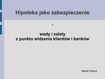 Hipoteka jako zabezpieczenie wady i zalety z punktu widzenia klientów i banków Marta Paluch Czym jest hipoteka? Hipoteka =/= kredyt hipoteczny Jest to zabezpieczenie wierzytelności wynikającej z danego stosunku prawnego przez obciążenie nieruchomości ograniczonym prawem rzeczowym. To prawo daje wierzycielowi (bankowi) prawo do dochodzenia zaspokojenia z nieruchomości bez względu na to, czyją stała się ona własnością, z pierwszeństwem przed wierzycielami osobistymi właściciela. (Na podstawie art. 65. Ustawy o księgach wieczystych i hipotece z dn. 6 lipca 1982 r.) Przedmiotem mogą być także: użytkowanie wieczyste, spółdzielcze własnościowe prawo do lokalu. Wymaga wpisu w księdze wieczystej, ze wskazaniem wierzyciela i właściciela nieruchomości. Związana z nieruchomością, nie właścicielem. Można nałożyć więcej niż jedną hipotekę na tę samą nieruchomość/jej ułamek. Pierwszeństwo przed innymi długami (z wyjątkiem: kosztów egzekucyjnych, alimentów, renty z tytułu odszkodowania za wywołanie choroby/kalectwa/śmierci). Charakter pieniężny, wyrażony w walucie, w której zaciągnięto zobowiązanie. Zalety dla banków Pewne zabezpieczenie długu Hipoteka podąża za nieruchomością Pierwszeństwo egzekucji spłaty Nie wymaga formy aktu notarialnego Wady dla banków Pierwszeństwo jest względne Możliwe komplikacje Zalety dla klienta Właściciel odpowiada za dług tylko nieruchomością Niższe koszty ustanowienia (PCC + KW) Sprzedaż nieruchomości = pozbycie się długu Możliwość manipulacji kolejnością (w określonych przypadkach) Dla nowego właściciela: możliwość zakupu po atrakcyjnej cenie Wady dla klienta Istnienie opcji hipoteki przymusowej Widmo utraty nieruchomości Możliwe komplikacje przy hipotekach w obcych walutach Możliwa trudność sprzedaży Dla nowego właściciela: potencjalnie niebezpieczny zakup Dziękuję za uwagę :)