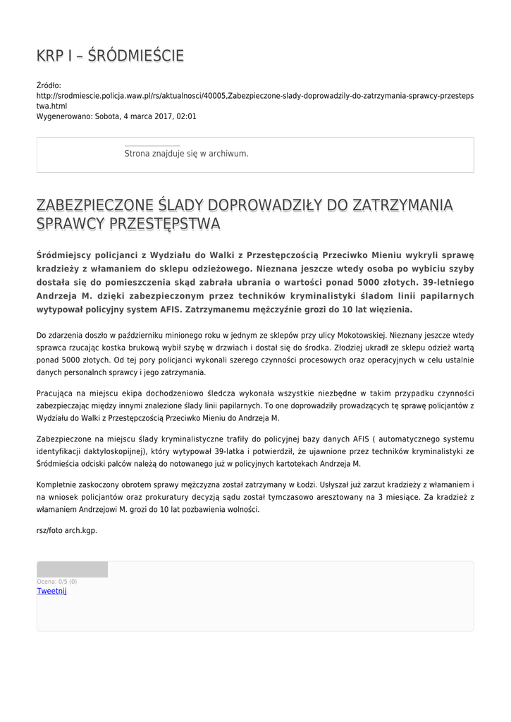 KRP I – ŚRÓDMIEŚCIE Źródło: http://srodmiescie.policja.waw.pl/rs/aktualnosci/40005,Zabezpieczone-slady-doprowadzily-do-zatrzymania-sprawcy-przesteps twa.html Wygenerowano: Sobota, 4 marca 2017, 02:01 Strona znajduje się w archiwum. ZABEZPIECZONE ŚLADY DOPROWADZIŁY DO ZATRZYMANIA SPRAWCY PRZESTĘPSTWA Śródmiejscy policjanci z Wydziału do Walki z Przestępczością Przeciwko Mieniu wykryli sprawę kradzieży z włamaniem do sklepu odzieżowego. Nieznana jeszcze wtedy osoba po wybiciu szyby dostała się do pomieszczenia skąd zabrała ubrania o wartości ponad 5000 złotych. 39-letniego Andrzeja M. dzięki zabezpieczonym przez techników kryminalistyki śladom linii papilarnych wytypował policyjny system AFIS. Zatrzymanemu mężczyźnie grozi do 10 lat więzienia. Do zdarzenia doszło w październiku minionego roku w jednym ze sklepów przy ulicy Mokotowskiej. Nieznany jeszcze wtedy sprawca rzucając kostka brukową wybił szybę w drzwiach i dostał się do środka. Złodziej ukradł ze sklepu odzież wartą ponad 5000 złotych. Od tej pory policjanci wykonali szerego czynności procesowych oraz operacyjnych w celu ustalnie danych personalnch sprawcy i jego zatrzymania. Pracująca na miejscu ekipa dochodzeniowo śledcza wykonała wszystkie niezbędne w takim przypadku czynności zabezpieczając między innymi znalezione ślady linii papilarnych. To one doprowadziły prowadzących tę sprawę policjantów z Wydziału do Walki z Przestępczością Przeciwko Mieniu do Andrzeja M. Zabezpieczone na miejscu ślady kryminalistyczne trafiły do policyjnej bazy danych AFIS ( automatycznego systemu identyfikacji daktyloskopijnej), który wytypował 39-latka i potwierdził, że ujawnione przez techników kryminalistyki ze Śródmieścia odciski palców należą do notowanego już w policyjnych kartotekach Andrzeja M. Kompletnie zaskoczony obrotem sprawy mężczyzna został zatrzymany w Łodzi. Usłyszał już zarzut kradzieży z włamaniem i na wniosek policjantów oraz prokuratury decyzją sądu został tymczasowo aresztowany na 3 miesiące. Za kradzież z włamaniem Andrzejowi M. grozi do 10 lat pozbawienia wolności. rsz/foto arch.kgp. Ocena: 0/5 (0) Tweetnij