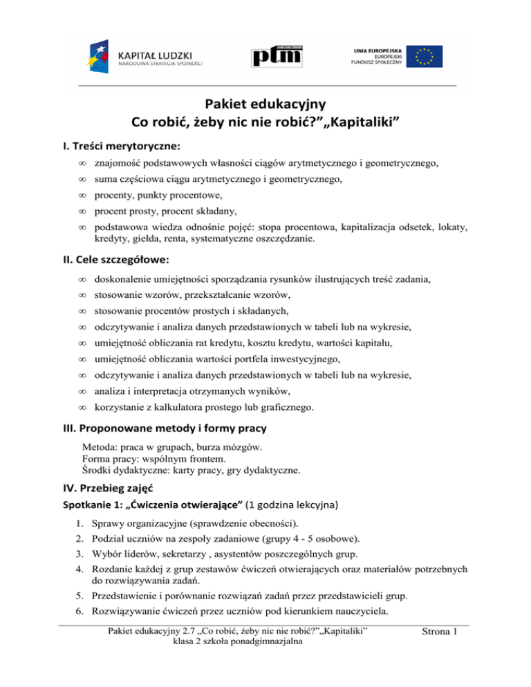Pakiet edukacyjny Co robić, żeby nic nie robić?”„Kapitaliki” I. Treści merytoryczne: • znajomość podstawowych własności ciągów arytmetycznego i geometrycznego, • suma częściowa ciągu arytmetycznego i geometrycznego, • procenty, punkty procentowe, • procent prosty, procent składany, • podstawowa wiedza odnośnie pojęć: stopa procentowa, kapitalizacja odsetek, lokaty, kredyty, giełda, renta, systematyczne oszczędzanie. II. Cele szczegółowe: • doskonalenie umiejętności sporządzania rysunków ilustrujących treść zadania, • stosowanie wzorów, przekształcanie wzorów, • stosowanie procentów prostych i składanych, • odczytywanie i analiza danych przedstawionych w tabeli lub na wykresie, • umiejętność obliczania rat kredytu, kosztu kredytu, wartości kapitału, • umiejętność obliczania wartości portfela inwestycyjnego, • odczytywanie i analiza danych przedstawionych w tabeli lub na wykresie, • analiza i interpretacja otrzymanych wyników, • korzystanie z kalkulatora prostego lub graficznego. III. Proponowane metody i formy pracy Metoda: praca w grupach, burza mózgów. Forma pracy: wspólnym frontem. Środki dydaktyczne: karty pracy, gry dydaktyczne. IV. Przebieg zajęć Spotkanie 1: „Ćwiczenia otwierające” (1 godzina lekcyjna) 1. Sprawy organizacyjne (sprawdzenie obecności). 2. Podział uczniów na zespoły zadaniowe (grupy 4 - 5 osobowe). 3. Wybór liderów, sekretarzy , asystentów poszczególnych grup. 4. Rozdanie każdej z grup zestawów ćwiczeń otwierających oraz materiałów potrzebnych do rozwiązywania zadań. 5. Przedstawienie i porównanie rozwiązań zadań przez przedstawicieli grup. 6. Rozwiązywanie ćwiczeń przez uczniów pod kierunkiem nauczyciela. Pakiet edukacyjny 2.7 „Co robić, żeby nic nie robić?”„Kapitaliki” klasa 2 szkoła ponadgimnazjalna Strona 1 7. Przedstawienie i porównanie rozwiązań zadań przez przedstawicieli grup. 8. Zebranie kart z rozwiązaniami. Bibliografia do ćwiczeń otwierających [1] Kachniewski M., Majewski B., Wasilewski P., Rynek Kapitałowy i Giełda Papierów Wartościowych, FERK, Warszawa 2008, www.kapital.edu.pl [2] www.ferk.pl - Zbiór Zadań "Giełda w Matematyce" [3] traugutt.net/lo/pliki/mat_fin.ppt – Zadanie maturalne Spotkanie 2: „Rozwiążmy razem” (2 godziny lekcyjne) 1. Uczniowie siadają we wcześniej ustalonych zespołach zadaniowych. 2. Nauczyciel rozdaje jeden egzemplarz zestawu zadań „Rozwiążmy razem”. 3. Uczniowie dokonują podziału, która grupa będzie rozwiązywała dane zadanie. Zestaw zadań uczniowie powinni pociąć i rozdzielić zadania do odpowiednich grup. 4. Każda grupa rozwiązuje zadania samodzielnie. Po rozwiązaniu zadania uczniowie redagują odpowiedź na karcie odpowiedzi. 5. Jeżeli dana grupa zakończy pracę, to jej członkowie powinni przyłączyć się i pomóc w rozwiązywaniu innym grupom. 6. Nauczyciel zbiera karty odpowiedzi. 7. Zakończenie zajęć. Bibliografia do zestawu zadań rozwiążmy razem [1] Kachniewski M., Majewski B., Wasilewski P., Rynek Kapitałowy i Giełda Papierów Wartościowych, FERK, Warszawa 2008, www.kapital.edu.pl [2] Kłaczkow K., Kurczab M., Świda E., Matematyka dla licealistów Zbiór zadań do II klasy, Oficyna Edukacyjna - Krzysztof Pazdro, Warszawa 2000 [3] www.ferk.pl - Zbiór Zadań "Giełda w Matematyce". [4] http://www.wkuwanko.tekstomania.pl/20081212113552.zip [5] http://traugutt.net/lo/pliki/mat_fin.ppt Spotkanie 3: „Ćwiczenia podsumowujące” (1 godzina lekcyjna) 1. Nauczyciel rozdaje poprawione i wypunktowane karty pracy zespołom zadaniowym. 2. Liderzy poszczególnych grup prezentują rozwiązania zadania. 3. Nauczyciel ocenia pracę grup (pozytywne wzmocnienie). 4. Podsumowanie zajęć. Pakiet edukacyjny 2.7 „Co robić, żeby nic nie robić?”„Kapitaliki” klasa 2 szkoła ponadgimnazjalna Strona 2
