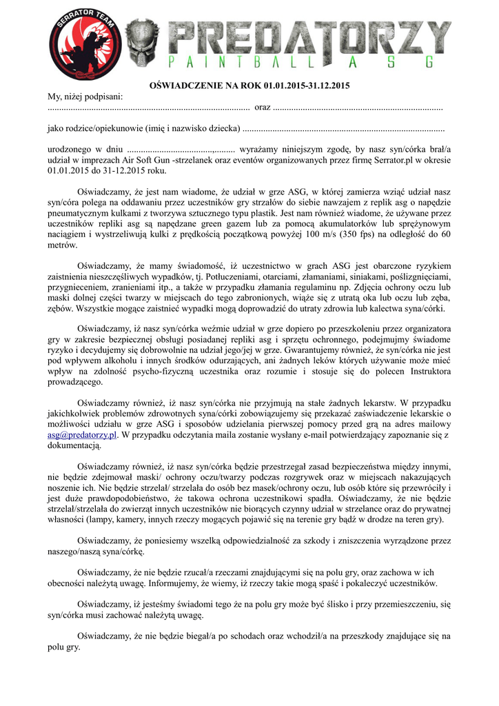 OŚWIADCZENIE NA ROK 01.01.2015-31.12.2015 My, niżej podpisani: ........................................................................................ oraz .......................................................................... jako rodzice/opiekunowie (imię i nazwisko dziecka) ........................................................................................ urodzonego w dniu .....................................,......... wyrażamy niniejszym zgodę, by nasz syn/córka brał/a udział w imprezach Air Soft Gun -strzelanek oraz eventów organizowanych przez firmę Serrator.pl w okresie 01.01.2015 do 31-12.2015 roku. Oświadczamy, że jest nam wiadome, że udział w grze ASG, w której zamierza wziąć udział nasz syn/córa polega na oddawaniu przez uczestników gry strzałów do siebie nawzajem z replik asg o napędzie pneumatycznym kulkami z tworzywa sztucznego typu plastik. Jest nam również wiadome, że używane przez uczestników repliki asg są napędzane green gazem lub za pomocą akumulatorków lub sprężynowym naciągiem i wystrzeliwują kulki z prędkością początkową powyżej 100 m/s (350 fps) na odległość do 60 metrów. Oświadczamy, że mamy świadomość, iż uczestnictwo w grach ASG jest obarczone ryzykiem zaistnienia nieszczęśliwych wypadków, tj. Potłuczeniami, otarciami, złamaniami, siniakami, poślizgnięciami, przygnieceniem, zranieniami itp., a także w przypadku złamania regulaminu np. Zdjęcia ochrony oczu lub maski dolnej części twarzy w miejscach do tego zabronionych, wiąże się z utratą oka lub oczu lub zęba, zębów. Wszystkie mogące zaistnieć wypadki mogą doprowadzić do utraty zdrowia lub kalectwa syna/córki. Oświadczamy, iż nasz syn/córka weźmie udział w grze dopiero po przeszkoleniu przez organizatora gry w zakresie bezpiecznej obsługi posiadanej repliki asg i sprzętu ochronnego, podejmujmy świadome ryzyko i decydujemy się dobrowolnie na udział jego/jej w grze. Gwarantujemy również, że syn/córka nie jest pod wpływem alkoholu i innych środków odurzających, ani żadnych leków których używanie może mieć wpływ na zdolność psycho-fizyczną uczestnika oraz rozumie i stosuje się do polecen Instruktora prowadzącego. Oświadczamy również, iż nasz syn/córka nie przyjmują na stałe żadnych lekarstw. W przypadku jakichkolwiek problemów zdrowotnych syna/córki zobowiązujemy się przekazać zaświadczenie lekarskie o możliwości udziału w grze ASG i sposobów udzielania pierwszej pomocy przed grą na adres mailowy [email protected]. W przypadku odczytania maila zostanie wysłany e-mail potwierdzający zapoznanie się z dokumentacją. Oświadczamy również, iż nasz syn/córka będzie przestrzegał zasad bezpieczeństwa między innymi, nie będzie zdejmował maski/ ochrony oczu/twarzy podczas rozgrywek oraz w miejscach nakazujących noszenie ich. Nie będzie strzelał/ strzelała do osób bez masek/ochrony oczu, lub osób które się przewróciły i jest duże prawdopodobieństwo, że takowa ochrona uczestnikowi spadła. Oświadczamy, że nie będzie strzelał/strzelała do zwierząt innych uczestników nie biorących czynny udział w strzelance oraz do prywatnej własności (lampy, kamery, innych rzeczy mogących pojawić się na terenie gry bądź w drodze na teren gry). Oświadczamy, że poniesiemy wszelką odpowiedzialność za szkody i zniszczenia wyrządzone przez naszego/naszą syna/córkę. Oświadczamy, że nie będzie rzucał/a rzeczami znajdującymi się na polu gry, oraz zachowa w ich obecności należytą uwagę. Informujemy, że wiemy, iż rzeczy takie mogą spaść i pokaleczyć uczestników. Oświadczamy, iż jesteśmy świadomi tego że na polu gry może być ślisko i przy przemieszczeniu, się syn/córka musi zachować należytą uwagę. Oświadczamy, że nie będzie biegał/a po schodach oraz wchodził/a na przeszkody znajdujące się na polu gry. Oświadczamy, iż jesteśmy świadomi, że na polu gry, mogą występować wystające ze ściany śruby i inne niebezpieczne przedmioty mogące przy nieuważnym poruszaniu zranić uczestnika. Oświadczamy, że syn/ córka nie będzie manipulował przy powierzonym jemu/ jej sprzęcie. Oświadczamy ponadto, że powierzony synowi/córce sprzęt do gry będzie wykorzystywany w sposób zgodny z jego przeznaczeniem a w przypadku jego zniszczenia po użyciu w sposób niezgodny z jego przeznaczeniem lub świadomego, umyślnego uszkodzenia sprzętu odpowiemy materialnie za powstałe szkody oraz za naprawę powierzonego sprzętu (wymiana zepsutych części nowymi w przypadku nieopłacalności przeprowadzenia naprawy pokrycie zakupu nowego tej samej klasy i marki). Oświadczamy również, że syn/córka przed rozpoczęciem gry weźmie udział w szkoleniu z obsługi repliki i całego osprzętu, a odczytane jemu/jej zasady bezpiecznej obsługi oraz Regulaminu Pola Gry usłyszał/a i zrozumiał/a oraz zaakceptował/a i dopiero po tym fakcie weźmie udział w imprezie asg. Oświadczamy, iż w przypadku zobaczenia przez syna/córkę jakiegoś niebezpieczeństwa, zagrożenia zdrowia lub życia, lub uszkodzenia wyposażenia na polu gry, uczestnik przerwie grę (Krzycząc STOP STOP STOP i od razu poinformuje o tym fakcie Instruktora prowadzącego). Oświadczamy, iż nasz syn/córka posiada ubezpieczenie od NNW na czas tej imprezy asg. W związku z art. 23 ust. 1 pkt.1 i ust. 2 z dn. 29.08.1997 r. O ochronie danych osobowych (DzU nr 133, poz. 883) oświadczamy, że wyrażam zgodę na przetwarzanie przez SERRATOR.PL obecnie i w przyszłości w celach związanych z działalnością rekreacyjnych (Paintball / ASG), w systemach informatycznych i w innych zbiorach danych, naszych danych osobowych. Administratorem danych osobowych jest firma Serrator.pl, 04-476 Warszawa ul. Arsenalska 22/2 tel. 606-262-347, [email protected] Podpisując powyższe oświadczenie wyrażamy zgodę na otrzymywanie informacji drogą elektroniczną bądź telefoniczną (zgodnie z Usta