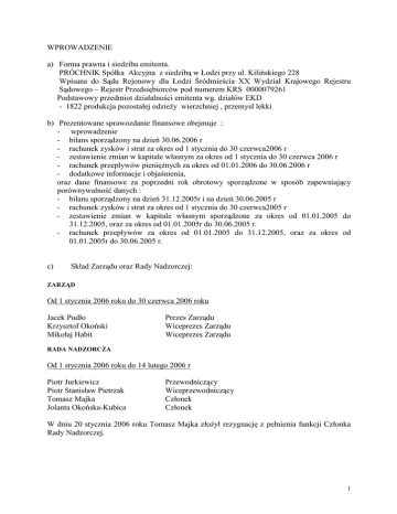 WPROWADZENIE a) Forma prawna i siedziba emitenta. PRÓCHNIK Spółka Akcyjna z siedzibą w Łodzi przy ul. Kilińskiego 228 Wpisana do Sądu Rejonowy dla Łodzi Śródmieścia XX Wydział Krajowego Rejestru Sądowego – Rejestr Przedsiębiorców pod numerem KRS 0000079261 Podstawowy przedmiot działalności emitenta wg. działów EKD - 1822 produkcja pozostałej odzieŜy wierzchniej , przemysł lekki b) Prezentowane sprawozdanie finansowe obejmuje : - wprowadzenie - bilans sporządzony na dzień 30.06.2006 r - rachunek zysków i strat za okres od 1 stycznia do 30 czerwca2006 r - zestawienie zmian w kapitale własnym za okres od 1 stycznia do 30 czerwca 2006 r - rachunek przepływów pienięŜnych za okres od 01.01.2006 do 30.06.2006 r - dodatkowe informacje i objaśnienia, oraz dane finansowe za poprzedni rok obrotowy sporządzone w sposób zapewniający porównywalność danych : - bilans sporządzony na dzień 31.12.2005r i na dzień 30.06.2005 r - rachunek zysków i strat za okres od 1 stycznia do 30 czerwca2005 r - zestawienie zmian w kapitale własnym sporządzone za okres od 01.01.2005 do 31.12.2005, oraz za okres od 01.01.2005r do 30.06.2005 r. - rachunek przepływów za okres od 01.01.2005 do 31.12.2005, oraz za okres od 01.01.2005r do 30.06.2005 r. c) Skład Zarządu oraz Rady Nadzorczej: ZARZĄD Od 1 stycznia 2006 roku do 30 czerwca 2006 roku Jacek Pudło Krzysztof Okoński Mikołaj Habit Prezes Zarządu Wiceprezes Zarządu Wiceprezes Zarządu RADA NADZORCZA Od 1 stycznia 2006 roku do 14 lutego 2006 r Piotr Jurkiewicz Piotr Stanisław Pietrzak Tomasz Majka Jolanta Okońska-Kubica Przewodniczący Wiceprzewodniczący Członek Członek W dniu 20 stycznia 2006 roku Tomasz Majka złoŜył rezygnację z pełnienia funkcji Członka Rady Nadzorczej. 1 Od 14 lutego 2006 r. do 30 czerwca 2006 r. Piotr Jurkiewicz Piotr Stanisław Pietrzak Jolanta Okońska-Kubica Zdzisław Panek Sławomir Filipczyk Przewodniczący Wiceprzewodniczący Członek Członek Członek d) W skład przedsiębiorstwa emitenta nie wchodzą wewnętrzne jednostki organizacyjne sporządzające samodzielne sprawozdania finansowe. e) Sprawozdanie finansowe sporządzono za okres, w czasie którego nie nastąpiło połączenie spółek. f) Jednostka nie sporządza skonsolidowanego sprawozdania finansowego na podstawie MSR 8 & 7 z uwagi iŜ dane finansowe są nieistotne. g) Sprawozdanie zostało sporządzone przy załoŜeniu kontynuowania działalności gospodarczej w dającej się przewidzieć przyszłości. Istniały w 2005 r okoliczności wskazujące na zagroŜenie kontynuowania działalności w związku z ponoszeniem w latach ubiegłych strat, których wysokość na koniec 2004 r. wynosiła 27.966.992,84 zł. jednakŜe w wyniku publicznej subskrypcji akcji, która była następstwem podjętych na Nadzwyczajnym Walnym Zgromadzeniu Akcjonariuszy w dniu 10 stycznia 2005 r uchwał o nowej emisji akcji serii C i D, oraz uchwały Nadzwyczajnego Walnym Zgromadzeniu Akcjonariuszy w dniu 24 października 2005 akcji serii E Spółka pozyskała środki finansowe na kontynuowanie działalności w łącznej wysokości 37.727.575 zł. oraz dokonała zamianę wierzytelności na akcje w wysokości 2.727.575 zł. Środki te spółka zamierza wykorzystać między innymi na budowę własnej sieci sprzedaŜy, zwiększenie asortymentu sprzedawany towarów, zwiększenie udziału sprzedaŜy wyrobów pod własną marką w ogólnych przychodach ze sprzedaŜy, wzrost wolumenu sprzedaŜy i atrakcyjności produktu. Realizacja wszystkie tych planów pozwoli Spółce generować coraz mniejsze straty i osiągnąć dodatni wynik finansowy. ZałoŜenie, Ŝe Spółka będzie kontynuowała działalność gospodarczą w dającej się przewidzieć przyszłości, będzie zasadne pod warunkiem realizacji planów i zamierzeń wymienionych wyŜej. h) Sprawozdanie finansowe zostało sporządzone zgodnie z obowiązującymi zasadami rachunkowości. i) Wybrane dane finansowe za pierwsze półrocze 2006 rok oraz za pierwsze półrocze 2005 zamieszczone na stronie tytułowej do SAP 2006 przeliczono na EURO wg następujących zasad: -do przeliczenia obrotu i wyniku finansowego zastosowano kurs 3,9002 (średnia arytmetyczna średnich kursów ustalanych przez NBP na ostatni dzień kaŜdego miesiąca roku obrotowego) -do przeliczenia aktywów, zobowiązań i kapitałów zastosowano kurs 4,0434 (średni kurs ogłoszony przez NBP na dzień bilansowy). j) Stosowane zasady rachunkowości, w tym metod wyceny aktywów i pasywów oraz pomiaru wyniku finansowego: 2 AKTYWA I. AKTYWA TRWAŁE 1. Wartości niematerialne i prawne Wartości niematerialne i prawne wyceniane są według cen nabycia lub kosztu wytworzenia. Na dzień bilansowy wartości niematerialne i prawne wycenia się według cen nabycia lub kosztów wytworzenia pomniejszonych o umorzenie i łączną kwotę odpisów aktualizacyjnych z tytułu utraty wartości. Wartości niematerialne i prawne amortyzowane są zgodnie z art. 31 ust.2 i art. 32 ust.1 –4 i ust.6 ustawy o rachunkowości, uwzględniający czas ekonomicznej i uŜytkowej przydatności, Stawki amortyzacyjne dla poszczególnych tytułów wartości niematerialnych i prawnych ustalane są na cały okres amortyzacji przed rozpoczęciem dokonywania odpisów amortyzacyjnych . JeŜeli wartość jednostkowa danego tytułu wartości niematerialnych i prawnych nie przekracza kwoty 3,5tys. zł wówczas dokonuje się odpisu jednorazowo w koszty nie zaliczając danego tytułu do wartości niematerialnych i prawnych. 2. Rzeczowe aktywa trwałe Środki trwałe wyceniane są według cen nabycia lub kosztu wytworzenia. Na dzień bilansowy środki trwałe wycenia się według cen nabycia lub kosztu wytworzenia pomniejszonych o dotychczasowe odpisy umorzeniowe, a takŜe o odpisy z tytułu trwałej utraty wartości. Wartość początkowa środków trwałych podlega podwyŜszeniu o wartość nakładów poniesionych na ich ulepszenie. Środki trwałe sfinansowane z ulgi inwestyc