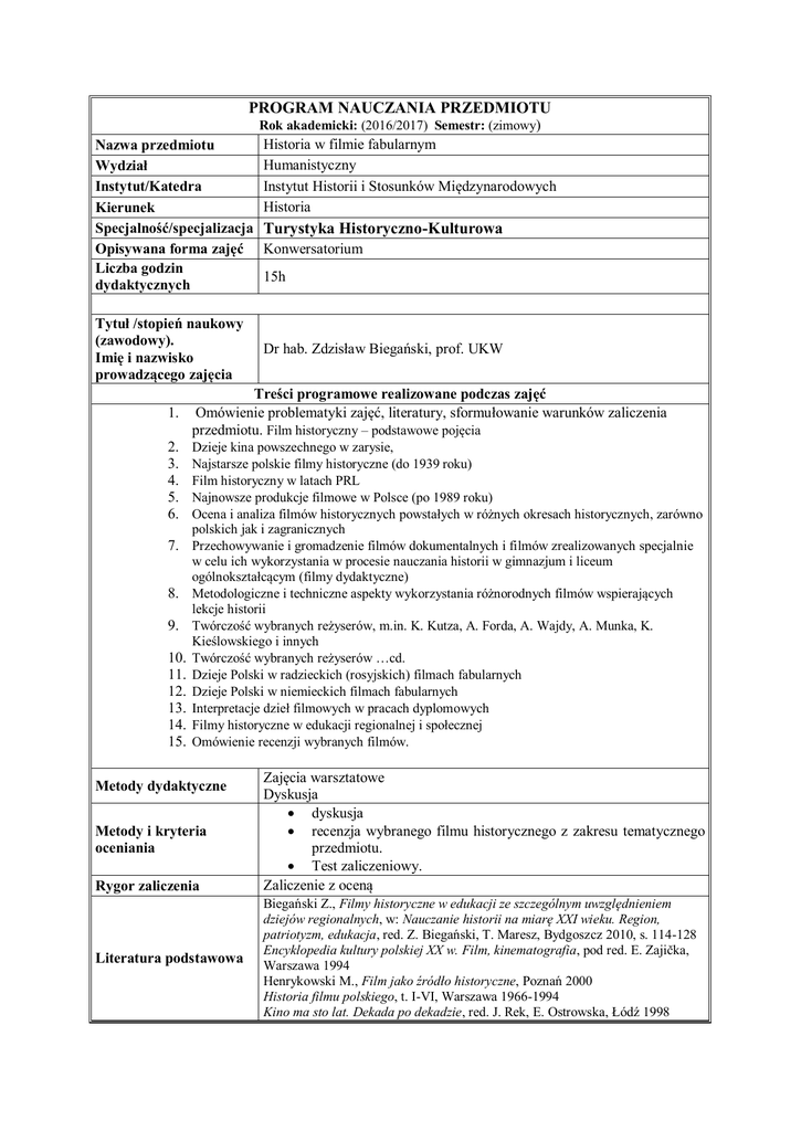 PROGRAM NAUCZANIA PRZEDMIOTU Rok akademicki: (2016/2017) Semestr: (zimowy) Nazwa przedmiotu Wydział Instytut/Katedra Kierunek Specjalność/specjalizacja Opisywana forma zajęć Liczba godzin dydaktycznych Tytuł /stopień naukowy (zawodowy). Imię i nazwisko prowadzącego zajęcia 1. 2. 3. 4. 5. 6. 7. 8. 9. 10. 11. 12. 13. 14. 15. Historia w filmie fabularnym Humanistyczny Instytut Historii i Stosunków Międzynarodowych Historia Turystyka Historyczno-Kulturowa Konwersatorium 15h Dr hab. Zdzisław Biegański, prof. UKW Treści programowe realizowane podczas zajęć Omówienie problematyki zajęć, literatury, sformułowanie warunków zaliczenia przedmiotu. Film historyczny – podstawowe pojęcia Dzieje kina powszechnego w zarysie, Najstarsze polskie filmy historyczne (do 1939 roku) Film historyczny w latach PRL Najnowsze produkcje filmowe w Polsce (po 1989 roku) Ocena i analiza filmów historycznych powstałych w różnych okresach historycznych, zarówno polskich jak i zagranicznych Przechowywanie i gromadzenie filmów dokumentalnych i filmów zrealizowanych specjalnie w celu ich wykorzystania w procesie nauczania historii w gimnazjum i liceum ogólnokształcącym (filmy dydaktyczne) Metodologiczne i techniczne aspekty wykorzystania różnorodnych filmów wspierających lekcje historii Twórczość wybranych reżyserów, m.in. K. Kutza, A. Forda, A. Wajdy, A. Munka, K. Kieślowskiego i innych Twórczość wybranych reżyserów …cd. Dzieje Polski w radzieckich (rosyjskich) filmach fabularnych Dzieje Polski w niemieckich filmach fabularnych Interpretacje dzieł filmowych w pracach dyplomowych Filmy historyczne w edukacji regionalnej i społecznej Omówienie recenzji wybranych filmów. Metody dydaktyczne Metody i kryteria oceniania Rygor zaliczenia Literatura podstawowa Zajęcia warsztatowe Dyskusja dyskusja recenzja wybranego filmu historycznego z zakresu tematycznego przedmiotu. Test zaliczeniowy. Zaliczenie z oceną Biegański Z., Filmy historyczne w edukacji ze szczególnym uwzględnieniem dziejów regionalnych, w: Nauczanie historii na miarę XXI wieku. Region, patriotyzm, edukacja, red. Z. Biegański, T. Maresz, Bydgoszcz 2010, s. 114-128 Encyklopedia kultury polskiej XX w. Film, kinematografia, pod red. E. Zajička, Warszawa 1994 Henrykowski M., Film jako źródło historyczne, Poznań 2000 Historia filmu polskiego, t. I-VI, Warszawa 1966-1994 Kino ma sto lat. Dekada po dekadzie, red. J. Rek, E. Ostrowska, Łódź 1998 Kino w dziesięciu sekwencjach, red. E. Nurczyńska-Fidelska, Łódź 1996 Kletowski P., Wizja lokalna. O obrazie PRL-u w polskich filmach fabularnych po 1989, „Tygodnik Powszechny" 22/2007 Lubelski T., Historia kina polskiego. Twórcy, filmy, konteksty, Warszawa 2009 Płażewski J. , Historia filmu 1895-2005, Warszawa 2006 P. Zwierzchowski, Zapomniani bohaterowie. O bohaterach filmowych polskiego socrealizmu,Warszawa2000 Kino polskie po 1989 roku, red. P. Zwierzchowski, D. Mazur, Bydgoszcz 2006; Skotarczuk D., Obraz społeczeństwa PRL w komedii filmowej, Poznań 2004; Konieczka-Śliwińska D., Filmy i programy telewizyjne w szkolnej edukacji historycznej, „Wiadomości Historyczne” 2008, nr 3; Multimedia w edukacji historycznej i społecznej, red. J. Rulka, B. Tarnowska, Literatura uzupełniająca Bydgoszcz 2002; Guzek M., Filmowa Bydgoszcz 1896-1939, Warszawa 2004; Zwierzchowski P., Czy „Sąsiedzi” opowiadają o sąsiadach? Filmowa wizja bydgoskiego września 1939, „Kwartalnik Filmowy”, 2003, nr 43. www.Filmpolski.pl