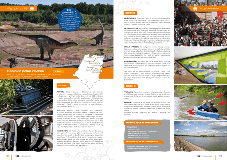 W grupie raźniej Czy e…? wiesz, ż Rex jest s ru au os Tyrann ardziej jednym z najb nozaurów di interesujących jeden To u. rk w JuraPa drapieżników z największych iek biegały w jakie kiedykol zęby miały po ziemi. Jego . długość 30 cm W grupie raźniej DZIEŃ 2 BISKUPICE. Wypoczęci i pełni sił możemy od samego ranka wziąć się do „rycerskiej roboty”: rzucania toporem, włócznią czy nożem. Będziemy mogli przymierzyć prawdziwą, ciężką, rycerską zbroję czy nauczyć się strzelać z łuku. DOBRODZIEŃ. Po atrakcjach rycerskiego grodu, pojedziemy do Dobrodzienia, gdzie zobaczymy Dobrotekę. Jedną z atrakcji jest największy w Polsce, a być może również w Europie wielopoziomowy, tapicerowany mebel relaksacyjny. Ponadto Dobroteka proponuje Salonik Historyczny, który jest ciekawie pomyślaną, barwną panoramą śląskich tradycji rzemiosła meblarskiego. Zabytki kultury materialnej prezentowane są tu w przekroju historycznych epok, wybieranych przez widza na multimedialnych ekranach. MAŁA PANEW. W następnym punkcie naszej wycieczki będziemy mieć do wyboru spływ kajakowy po Małej Panwi, która jest największą na Opolszczyźnie atrakcją dla miłośników kajaków, albo spacer intresującymi ścieżkami edukacyjno-przyrodniczymi Nadleśnictwa Zawadzkie. Na finał tej części przewidziano pieczenie smakowitych kiełbasek na ognisku. KRASIEJÓW. Ostatnim, ale jakże atrakcyjnym punktem drugiego dnia, będą odwiedziny u prehistorycznych gadów, czyli zwiedzanie JuraParku, który jest największą atrakcją turystyczną na Śląsku Opolskim. Opolskie pełne wrażeń 3 DNI Pokój – Zagwiździe - Maciejów – Biskupice – Dobrodzień - Mała Panew – Krasiejów – Turawa - Opole DZIEŃ 1 POKÓJ. Naszą przygodę z Opolszczyzną rozpoczynamy w Pokoju, od zwiedzenia kościoła ewangelickiego Księżnej Zofii i od spaceru po pięknym parku. Cały park liczy 200 hektarów, z czego powierzchnia ogrodu barokowego i XIX-wiecznego parku to około 45 ha. Mimo upływu lat bogata flora parku oraz nieliczne pozostałe pomniki (m.in. „śpiący lew”, „bogini pokoju”, „Minerwa”, „Diana”) wciąż wywierają na odwiedzających niezapomniane wrażenie. Następnym punktem naszej wycieczki jest Zagwiździe, w którym zwiedzimy pozostałości dawnej, XVIII-wiecznej huty. Później przejeżdżamy do Laskowic na spotkanie z „laskowicką śmiercią”, czyli mumią z miejscowego drewnianego kościółka. Dobrze zachowana mumia i jej interesująca historia przyciąga uwagę turystów. Miejscowi przez 400 lat zdążyli się już do niej chyba przyzwyczaić. Mumia to zmarła w XVII w. młoda hrabina Brygida Buchta von Buchtitz. Z „laskowicką śmiercią” wiąże się niesamowita legenda... ale to zupełnie inna historia. MACIEJÓW. W Maciejowie zwiedzamy Pasiekę Zarodową, która powstała w miejscu, gdzie swoje badania naukowe nad pszczołami prowadził ks. Jan Dierżon, uznawany za „Kopernika pszczelarstwa”. Przewidziana jest również degustacja miodów. Można będzie kupić nie tylko miody, ale także pyłki, wosk, propolis, czy ozdobne świece z wosku pszczelego. Z Maciejowa jedziemy do Grodu Rycerskiego pod Byczyną, gdzie będziemy nocować w „średniowiecznych warunkach”. 28 Tam czeka na nas prehistoryczne Oceanarium, Tunel Czasu, ścieżka dydaktyczna oraz Pawilon Paleontologiczny. Można poszaleć na placach zabaw, wsiąść na drapieżnego albertozaura czy wejść do paszczy T-Rexa. Proszę nam wierzyć: to bawi nie tylko dzieci! DZIEŃ 3 TURAWA. Trzeci dzień zaczniemy od wypoczynku w Turawie, wśród lasów, nad brzegiem jeziora. Będzie to jednak aktywny wypoczynek. Czeka nas fitness, spacer, nordic walking, spa oraz rowery. OPOLE. Po powrocie do Opola nie możemy ominąć ZOO. Jego największą atrakcją są goryle, które nie tak łatwo spotkać w ogrodach zoologicznych. Niewiele popularnością ustępują im uchatki czy lemury swobodnie fikające na drzewach na swojej wyspie. Ostatnim punktem programu jest skansen - Muzeum Wsi Opolskiej. INFORMACJE O WYCIECZCE ŚWIADCZENIA: - pilot-przewodnik - wyżywienie: 2 śniadania + 2 obiadokolacje - zakwaterowanie: 2 noclegi - ubezpieczenie: NW (10.000zł) - transport: przejazd autokarem INFORMACJE O OBIEKTACH Dobrodzień - Dobroteka: www.dobroteka.pl Opolskie ZOO: www.zoo.opole.pl 29