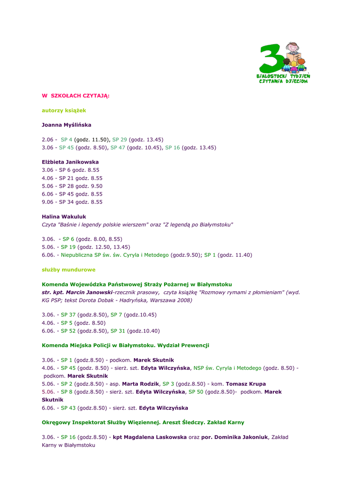 W SZKOŁACH CZYTAJĄ: autorzy książek Joanna Myślińska 2.06 - SP 4 (godz. 11.50), SP 29 (godz. 13.45) 3.06 - SP 45 (godz. 8.50), SP 47 (godz. 10.45), SP 16 (godz. 13.45) Elżbieta Janikowska 3.06 - SP 6 godz. 8.55 4.06 - SP 21 godz. 8.55 5.06 - SP 28 godz. 9.50 6.06 - SP 45 godz. 8.55 9.06 - SP 34 godz. 8.55 Halina Wakuluk Czyta "Baśnie i legendy polskie wierszem" oraz "Z legendą po Białymstoku" 3.06. - SP 6 (godz. 8.00, 8.55) 5.06. - SP 19 (godz. 12.50, 13.45) 6.06. - Niepubliczna SP św. św. Cyryla i Metodego (godz.9.50); SP 1 (godz. 11.40) służby mundurowe Komenda Wojewódzka Państwowej Straży Pożarnej w Białymstoku str. kpt. Marcin Janowski-rzecznik prasowy, czyta książkę "Rozmowy rymami z płomieniam" (wyd. KG PSP; tekst Dorota Dobak - Hadryńska, Warszawa 2008) 3.06. - SP 37 (godz.8.50), SP 7 (godz.10.45) 4.06. - SP 5 (godz. 8.50) 6.06. - SP 52 (godz.8.50), SP 31 (godz.10.40) Komenda Miejska Policji w Białymstoku. Wydział Prewencji 3.06. - SP 1 (godz.8.50) - podkom. Marek Skutnik 4.06. - SP 45 (godz. 8.50) - sierż. szt. Edyta Wilczyńska, NSP św. Cyryla i Metodego (godz. 8.50) podkom. Marek Skutnik 5.06. - SP 2 (godz.8.50) - asp. Marta Rodzik, SP 3 (godz.8.50) - kom. Tomasz Krupa 5.06. - SP 8 (godz.8.50) - sierż. szt. Edyta Wilczyńska, SP 50 (godz.8.50)- podkom. Marek Skutnik 6.06. - SP 43 (godz.8.50) - sierż. szt. Edyta Wilczyńska Okręgowy Inspektorat Służby Więziennej. Areszt Śledczy. Zakład Karny 3.06. - SP 16 (godz.8.50) - kpt Magdalena Laskowska oraz por. Dominika Jakoniuk, Zakład Karny w Białymstoku 5.06. - SP 47 (godz.8.50) - mjr Jacek Łotowski, insp. Joanna Dubowska, Okręgowy Inspektorat Służby Więziennej 6.06. - SP 7 (godz.8.50), SP 12 (godz.10.45) - mjr Wojciech Januszewski, Areszt Śledczy Podlaski Oddział Straży Granicznej Czyta kpt. Katarzyna Zdanowicz, rzecznik prasowy Komendanta POSG. 3.06. - SP 34 (godz.8.50), SP 14 (godz.10.45) 4.06. - SP 20 (godz.8.50), SP 28 (godz.10.45) aktorki Teatr Dramatyczny 3.06 - SP nr 49 (godz. 12.50) - Monika Zaborska – Wróblewska; SP nr 3 ZS Nr 2 (godz. 12.50) Arleta Godziszewska - Półtorak 4.06 - SP nr 1 (godz. 12.50) - Agnieszka Możejko – Szekowska; SP nr 28 (godz. 12.50) - Justyna Godlewska – Kruczkowska bibliotekarze Centrum Edukacji Nauczycieli Biblioteka Pedagogiczna Czyta nauczyciel bibliotekarz - Magdalena Kraszewska 3.06. - SP 34 (2 spotkania), SP 11 (3 spotkania) 4.06. - SP 16 (5 spotkań) 5.06. - SP 19 (1 spotkanie), SP 1 (1 spotkanie) dziennikarze Media Regionalne sp. z o.o., (Gazeta Współczesna, Kurier Poranny) 3.06 - SP nr 16 (godz. 8.50) - Marta Gawina; SP nr 12 (godz. 8.00) - Maryla Pawlak-Żalikowska 5.06 - SP nr 45 (godz. 8.50) - Marta Gawina; SP nr 26 ( 8.50) - Anna Kopeć 6.06 - SP nr 21 (godz. 8.00) - Maryla Pawlak-Żalikowska ; SP nr 8 ( 8.50) - Anna Kopeć Polskie Radio Białystok 3.06 - SP nr 5 (godz. 8.50 ) - Dorota Niebrzydowska 4.06 - SP nr 2 (godz. 9.50 ) - Andrzej Bajguz 5.06 - SP nr 34 (godz. 9.50) - Iza Serafin 6.06 - SP nr 14 (godz. 9.50) - Dorota Sokołowska TVP Białystok 3.06 - SP nr 19 (godz. 8.50 ) - Inga Januszko-Maches; SP nr 26 (godz. 10.45) - Justyna Śliwowska 4.06 - SP nr 44 (godz. 8.50 ) - Dariusz Szada-Borzyszkowski; SP nr 29 (godz. 10.45 ) Magdalena Gołaszewska 4.06 - NSP św. Cyryla i Metodego (godz. 10.45 ) - Katarzyna Wyspiańska-Mirończuk 5.06 - SP nr 4 (godz. 10.45) - Monika Andrulewicz 6.06 - SP nr 49 (godz. 8.50 ) - Dorota Kuc; SP nr 26 (godz. 10.45) - Dariusz SzadaBorzyszkowski leśnicy Regionalna Dyrekcja Lasów Państwowych w Białymstoku Leśnicy czytają wiersze T. Goleckiego "Las uczy nas". 3.06. - SP 14 (godz.8.50), SP 50 (godz.10.45) 4.06. - SP 43 (godz.8.50), SP 44 (godz.10.45) 5.06. - SP 29 (godz.8.50), SP 15 (godz.10.45) 6.06. - SP 4 (godz.8.50), SP 26 (godz.10.45) lekarze Okręgowa Izba Lekarska w Białymstoku 3.06. - SP 15 (godz.8.50), SP 29 (godz.10.45) - dr Anna Jakubowska (przewodnicząca Komisji Kultury OIL ) czyta E. Szelburg - Zarembinę "Mały Afrykańczyk", Luwika J. Kerna "Ferdynand Wspaniały". Kolegium Lekarzy Rodzinnych w Polsce 3.06. - SP 29 (godz.8.50), SP 12 (godz. 10.45) - dr Tamara Klimiuk (wiceprzewodnicząca Białostockiego II Oddziału Terenowego) czyta książkę Renaty Piątkowskiej "A może będzie właśnie tak". 5.06. - SP 50 (godz.14.00) - dr Joanna Szeląg (przewodnicząca Białostockiego II Oddziału Terenowego) urzędnicy Departament Edukacji Urzędu Miejskiego w Białymstoku Panie czytają baśnie Hansa Ch. Andersena. 3.06. - SP 52 (godz.10.45) - Marta Tofiluk 3.06. - SP 51 (godz.10.45) - Anna Cybulko 3.06. - SP 45 (godz.10.45) - Agnieszka Kasprzak 3.06. - SP 21 (godz.10.45) - Justyna Pieczeńczyk Urząd Marszałkowski Województwa Podlaskiego 5.06. - SP 12 (godz.) - Urszula Arter, rzecznik towarzystwa Związek Sybiraków w Białymstoku Panie czytają książki o tematyce sybirackiej. 3.06. 4.06. - SP - SP 4 (godz.8.50) - Helena Łapińska, SP 14 (godz.8.50) - Hieronima Dzierma, SP 34 (godz.10.45) - Liliana 6.06. - SP 19 (godz.8.50) - Jolanta Hryniewicka Fundacja Sąsiedzi Czyta prezes fundacji - Andrzej Kalinowski 5.06. - SP 19 (godz.8.50), SP 11 (godz.10.45) 6 (godz.9.50) 11 (godz. - Teresa Borowska 8.50) - Maria Gulewicz, SP Zalewska