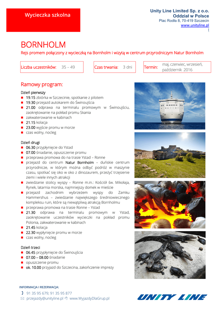 Unity Line Limited Sp. z o.o. Oddział w Polsce Wycieczka szkolna Plac Rodła 8, 70-419 Szczecin www.unityline.pl l BORNHOLM Rejs promem połączony z wycieczką na Bornholm i wizytą w centrum przyrodniczym Natur Bornholm Liczba uczestników: 35 – 49 Czas trwania: 3 dni Ramowy program: Dzień pierwszy 19.15 zbiórka w Szczecinie, spotkanie z pilotem 19.30 przejazd autokarem do Świnoujścia 21.00 odprawa na terminalu promowym w Świnoujściu, zaokrętowanie na pokład promu Skania zakwaterowanie w kabinach 21.15 kolacja 23.00 wyjście promu w morze czas wolny, nocleg Dzień drugi 06.30 przypłynięcie do Ystad 07.00 śniadanie, opuszczenie promu przeprawa promowa do na trasie Ystad – Ronne przejazd do centrum Natur Bornholm – duńskie centrum przyrodnicze, w którym można odbyć podróż w maszynie czasu, spotkać się oko w oko z dinozaurem, przeżyć trzęsienie ziemi i wiele innych atrakcji zwiedzanie stolicy wyspy – Ronne m.in.: Kościół św. Mikołaja, Rynek, latarnia morska, najmniejszy domek w mieście przejazd zachodnim wybrzeżem wyspy do Zamku Hammershus – zwiedzanie największego średniowiecznego kompleksu ruin, które są niewątpliwą atrakcją Bornholmu przeprawa promowa na trasie Ronne – Ystad 21.30 odprawa na terminalu promowym w Ystad, zaokrętowanie uczestników wycieczki na pokład promu Polonia, zakwaterowanie w kabinach 21.45 kolacja 22.30 wypłynięcie promu w morze czas wolny, nocleg Dzień trzeci 06.45 przypłynięcie do Świnoujścia 07.00 – 08.00 śniadanie opuszczenie promu ok. 10.00 przyjazd do Szczecina, zakończenie imprezy INFORMACJA I REZERWACJA: 91 35 95 679; 91 35 95 877 [email protected] www.WyjazdyDlaGrup.pl Termin: maj, czerwiec, wrzesień, październik 2016 Wycieczka szkolna Unity Line Limited Sp. z o.o. Oddział w Polsce Plac Rodła 8, 70-419 Szczecin www.unityline.pl l Cena 435 PLN za osobę w kabinie 4 osobowej Cena zawiera: Przejazd promem Skania na trasie Świnoujście – Ystad Przejazd promem Polonia na trasie Ystad – Świnoujście Miejsce w kabinie podczas rejsu promem Skania oraz promem Polonia Kolacja na promie Skania na trasie Świnoujście – Ystad Śniadanie na promie Skania na trasie Świnoujście – Ystad Kolacja na promie Polonia na trasie Ystad – Świnoujście Śniadanie na promie Polonia na trasie Ystad – Świnoujście Suchy prowiant w drugim dniu wycieczki Przeprawa promowa na trasie Ystad – Ronne – Ystad Wizyta w Natur Bornholm – zajęcia i zwiedzanie z polskojęzycznym przewodnikiem Zwiedzanie Wyspy Obsługa autokaru na całej trasie wg programu Opieka pilota – przewodnika w trakcie trwania wycieczki Ubezpieczenie NNW i KL Dodatek paliwowy Uwagi Oferta dla grupy minimum 35-49 osobowej. W przypadku zmniejszenia ilości osób w grupie, cena oferty ulegnie zmianie. Oferta ważna dla dzieci i młodzieży do lat 19. Wypłynięcie od niedzieli do środy. Oferta nie obowiązuje na rejsy w piątki i soboty. Termin ważności oferty: maj, czerwiec (do 23.06), wrzesień, październik 2016. 3 opiekunów z ramienia szkoły – bezpłatnie. Organizator zastrzega sobie prawo do zmiany programu, kolejności zwiedzania. Sugerowane kieszonkowe (ewentualny posiłek na Bornholmie) około 200 DKK. Oferta zawiera napoje do posiłków. Do zobaczenia na pokładzie! INFORMACJA I REZERWACJA: 91 35 95 679; 91 35 95 877 [email protected] www.WyjazdyDlaGrup.pl