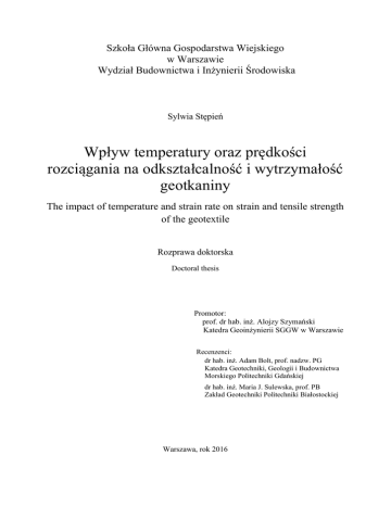 Szkoła Główna Gospodarstwa Wiejskiego w Warszawie Wydział Budownictwa i Inżynierii Środowiska Sylwia Stępień Wpływ temperatury oraz prędkości rozciągania na odkształcalność i wytrzymałość geotkaniny The impact of temperature and strain rate on strain and tensile strength of the geotextile Rozprawa doktorska Doctoral thesis Promotor: prof. dr hab. inż. Alojzy Szymański Katedra Geoinżynierii SGGW w Warszawie Recenzenci: dr hab. inż. Adam Bolt, prof. nadzw. PG Katedra Geotechniki, Geologii i Budownictwa Morskiego Politechniki Gdańskiej dr hab. inż. Maria J. Sulewska, prof. PB Zakład Geotechniki Politechniki Białostockiej Warszawa, rok 2016 Streszczenie Wpływ temperatury oraz prędkości rozciągania na odkształcalność i wytrzymałość geotkaniny Niniejsza rozprawa doktorska dotyczy badań wytrzymałości na rozciąganie geotkanin poddanych wpływowi temperatury, zmiennej prędkości rozciągania oraz cyklom zamrażaniarozmrażania. Przedmiotem dociekań i badań ukazanych w pracy jest uwzględnienie wpływu temperatury oraz prędkości rozciągania na wytrzymałość, wydłużenie względne oraz moduł sieczny geotkanin. Prezentowane opracowanie ma charakter ściśle doświadczalny i jest ukierunkowane na poznanie i opis przebiegu charakterystyki sztywności badanego materiału wraz z analizą czynników, które kształtują rozkład sztywności. W tym celu przeprowadzono badania laboratoryjne wytrzymałości na rozciąganie próbek geotkaniny w zakresie temperatur od -40°C do +140°C przy prędkości rozciągania 20 mm/min według normy PN-EN ISO 10 319 oraz przy niestandardowej prędkości rozciągania 0,02 mm/min w zakresie temperatur od +20°C do +140°C. Praca zawiera również badania laboratoryjne wytrzymałości na rozciąganie geotkaniny po 30 i 60 cyklach zamrażania-rozmrażania. Słowa kluczowe: geotkaniny, temperatura, wytrzymałość na rozciąganie, wydłużenie względne, prędkość rozciągania, moduł sieczny, cykle zamrażania-rozmrażania Summary The impact of temperature and strain rate on strain and tensile strength of the geotextile The present thesis relates to the study on the tensile strength of the geotextiles affected by temperature, variable strain rates and the cycles of freeze-thawing. The main aim of the investigations showed in the dissertation is to capture the impact of temperature and strain rate on the tensile strength, strain and secant stiffness of geotextiles. This compilation is strictly experimental and is focused on understanding and describing the characteristics of the stiffness of the material being tested, along with an analysis of the factors that shape the distribution of stiffness. The laboratory tensile strength tests of the geotextile samples were performed in the temperature range from -40°C to +140°C at strain rate of 20 mm/min according to PN-EN ISO 10 319. The tests were also performed at custom strain rate of 0,02 mm/min at temperatures ranging from +20°C to +140°C. The research includes laboratory tests of geotextile tensile strength after 30 and 60 freezing-thawing cycles. Key words: geotextiles, temperature, tensile strength, strain, strain rate, secant stiffness, freezing-thawing cycles