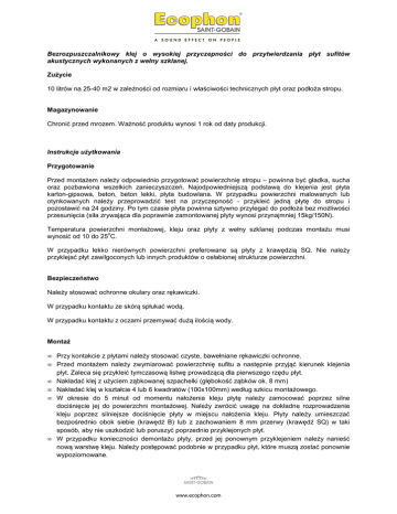 Bezrozpuszczalnikowy klej o wysokiej przyczepności do przytwierdzania płyt sufitów akustycznych wykonanych z wełny szklanej. Zużycie 10 litrów na 25-40 m2 w zależności od rozmiaru i właściwości technicznych płyt oraz podłoża stropu. Magazynowanie Chronić przed mrozem. Ważność produktu wynosi 1 rok od daty produkcji. Instrukcje użytkowania Przygotowanie Przed montażem należy odpowiednio przygotować powierzchnię stropu – powinna być gładka, sucha oraz pozbawiona wszelkich zanieczyszczeń. Najodpowiedniejszą podstawą do klejenia jest płyta karton-gipsowa, beton, beton lekki, płyta budowlana. W przypadku powierzchni malowanych lub otynkowanych należy przeprowadzić test na przyczepność - przykleić jedną płytę do stropu i pozostawić na 24 godziny. Po tym czasie płyta powinna sztywno przylegać do podłoża bez możliwości przesunięcia (siła zrywająca dla poprawnie zamontowanej płyty wynosi przynajmniej 15kg/150N). Temperatura powierzchni montażowej, kleju oraz płyty z wełny szklanej podczas montażu musi o wynosić od 10 do 25 C. W przypadku lekko nierównych powierzchni preferowane są płyty z krawędzią SQ. Nie należy przyklejać płyt zawilgoconych lub innych produktów o osłabionej strukturze powierzchni. Bezpieczeństwo Należy stosować ochronne okulary oraz rękawiczki. W przypadku kontaktu ze skórą spłukać wodą. W przypadku kontaktu z oczami przemywać dużą ilością wody. Montaż • Przy kontakcie z płytami należy stosować czyste, bawełniane rękawiczki ochronne. • Przed montażem należy zwymiarować powierzchnię sufitu a następnie przyjąć kierunek klejenia płyt. Zaleca się przykleić tymczasową listwę prowadzącą dla pierwszego rzędu płyt. • Nakładać klej z użyciem ząbkowanej szpachelki (głębokość ząbków ok. 8 mm) • Nakładać klej w kształcie 4 lub 6 kwadratów (100x100mm) według szkicu montażowego. • W okresie do 5 minut od momentu nałożenia kleju płytę należy zamocować poprzez silne dociśnięcie jej do powierzchni montażowej. Należy zwrócić uwagę na dokładne rozprowadzenie kleju poprzez silniejsze dociśnięcie płyty w miejscu nałożenia kleju. Płyty należy umieszczać bezpośrednio obok siebie (krawędź B) lub z zachowaniem 8 mm przerwy (krawędź SQ) w taki sposób, aby nie uszkodzić lub poruszyć poprzednio przyklejonych płyt. • W przypadku konieczności demontażu płyty, przed jej ponownym przyklejeniem należy nanieść nową warstwę kleju. Należy postępować podobnie w przypadku płyt, które muszą zostać ponownie wypoziomowane. www.ecophon.com 2(2) • Klej uzyskuje pełną wytrzymałość po upływie 1-2 dni. • Niewyschnięty klej można usuwać z użyciem wilgotnej szmatki. Wyschnięty klej można usuwać jedynie mechanicznie. • W przypadku przerw w instalacji należy zakrywać opakowanie kleju. www.ecophon.com