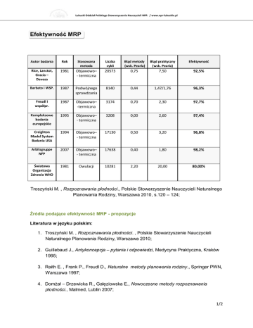 Lubuski Oddział Polskiego Stowarzyszenia Nauczycieli NPR / www.npr-lubuskie.pl Efektywność MRP Autor badania Rok Stosowana metoda Liczba cykli Błąd metody (wsk. Pearla) Błąd praktyczny (wsk. Pearla) Efektywnośd Rice, Lanctot, Gracia – Devesa 1981 Objawowo– - termiczna 20573 0,75 7,50 92,5% Barbato i WSP. 1987 Podwójnego sprawdzania 8140 0,44 1,47/1,76 96,3% Freudl i współpr. 1987 Objawowo– -termiczna 3174 0,70 2,30 97,7% Kompleksowe badania europejskie 1995 Objawowo– - termiczna 3208 0,00 2,60 97,4% Creighton Model System Badania USA 1994 Objawowo– - termiczna 17130 0,50 3,20 96,8% Arbitsgruppe NFP 2007 Objawowo– - termiczna 17638 0,40 1,80 98,2% Światowa Organizacja Zdrowia WHO 1981 Owulacji 10281 2,20 20,00 80,00% Troszyński M. , Rozpoznawania płodności., Polskie Stowarzyszenie Nauczycieli Naturalnego Planowania Rodziny, Warszawa 2010, s.120 – 124; Źródła podające efektywność MRP - propozycje Literatura w języku polskim: 1. Troszyński M. , Rozpoznawania płodności. , Polskie Stowarzyszenie Nauczycieli Naturalnego Planowania Rodziny, Warszawa 2010; 2. Guillebaud J., Antykoncepcja – pytania i odpowiedzi, Medycyna Praktyczna, Kraków 1995; 3. Raith E. , Frank P., Freudl D., Naturalne metody planowania rodziny., Springer PWN, Warszawa 1997; 4. Domżał – Drzewicka R., Gałęziowska E., Nowoczesne metody rozpoznawania płodności., Malmed, Lublin 2007; 1/2 Lubuski Oddział Polskiego Stowarzyszenia Nauczycieli NPR / www.npr-lubuskie.pl Materiały źródłowe publikujące wyniki badań: 1. Freundl G.; Prospective European multi-center study of natural family planning (19891992): interim results; Adv. in contraception; 1993, 9; 269-283. 2. Frank-Hermann et al; ‘The effectiveness of a fertility awareness based method to avoid pregnancy in relation to a couple’s sexual behaviour during the fertile time: a prospective longitudinal study; Human Reproduction, pages 5,7; Feb 2007; p1-10. 3. Freundl G; ‘European multicenter study of natural family planning (1989-1995): efficacy and drop-out’; Advances in contraception; 1999;15; 69-83. This article gives a review of other studies on pages 79,80. 4. Frank-Hermann P.et al; The effectiveness of a fertility awareness based method to avoid pregnancy in relation to a couple’s sexual behaviour during the fertile time: a prospective longitudinal study; Human Reproduction; Feb 2007; p1-10 5. Frank-Herrmann et al; ‘Effectiveness and acceptability of the symptothermal method of natural family planning in Germany; Am J Obstet Gynecol 1991; 165; 2052-4 6. Freundl G.; Prospective European multi-center study of natural family planning (19891992): interim results; Advances in contraception; 1993, 9; 269-283. 2/2