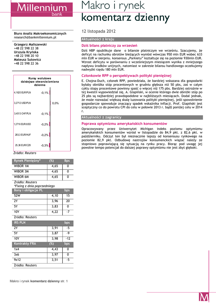 12 listopada 2012 Biuro Analiz Makroekonomicznych [email protected] Aktualności z kraju Grzegorz Maliszewski +48 22 598 22 38 Urszula Kryńska +48 22 598 20 10 Mateusz Sutowicz +48 22 598 22 36 Dziś bilans płatniczy za wrzesień Dziś NBP opublikuje dane o bilansie płatniczym we wrześniu. Szacujemy, że deficyt na rachunku obrotów bieżących wyniósł wówczas 950 mln EUR wobec 633 mln EUR w sierpniu. konsensus „Parkietu” kształtuje się na poziomie 930mln EUR. Wzrost deficytu w porównaniu z wcześniejszym miesiącem wynika z mniejszego napływu środków unijnych, natomiast w zakresie bilansu handlowego oczekujemy nadwyżki rzędu 180 mln EUR. Kursy walutowe dzisiejsze otwarcie/zmiana 0,0 0,0 0,0 0,0 dzienna 4,1620 EUR/PLN 1,2716 EUR/USD 0,0 -0,1% 3,2712 USD/PLN 3,4513 CHF/PLN Członkowie RPP o perspektywach polityki pieniężnej 0,0% -0,1% Aktualności z zagranicy Poprawa optymizmu amerykańskich konsumentów -0,2% 283,3 EUR/HUF -0,2% 25,36 EUR/CZK -0,3% Opracowywany przez Uniwersytet Michigan indeks poziomu optymizmu amerykańskich konsumentów wzrósł w listopadzie do 84,9 pkt. z 82,6 pkt. w październiku. Odczyt ten był nieznacznie lepszy od konsensusu rynkowego na poziomie 82,9 pkt. Odbudowę nastrojów konsumenckich wiązać należy ze stopniowo poprawiającą się sytuacją na rynku pracy. Biorąc pod uwagę jej powolne tempo potencjał do dalszej poprawy optymizmu nie jest zbyt głęboki. Źródło: Reuters Rynek Pieniężny* (%) Bps WIBOR 1M 4,65 0 WIBOR 3M 4,65 0 WIBOR 6M 4,65 0 Źródło: Reuters *Fixing z dnia poprzedniego Bony i obligacje PL bps 52W 4,10 15 2Y 3,96 20 5Y 3,83 0 10Y 4,22 -7 Źródło: Reuters IRS PLN bps 2Y 3,91 -5 5Y 3,87 -9 10Y Kontrakty FRA E. Chojna-Duch, członek RPP, powiedziała, że bardziej wskazana dla gospodarki byłaby obniżka stóp procentowych w grudniu głębsza niż 50 pbs, zaś w całym cyklu stopy procentowe powinny spaść o więcej niż 175 pbs. Bardziej ostrożnie w tej kwestii wypowiedział się, A. Glapiński, w ocenie którego dwie obniżki stóp po 25 pbs są najbardziej prawdopodobne w najbliższych miesiącach. Dodał jednak, że może rozważać większą skalę luzowania polityki pieniężnej, jeśli spowolnienie gospodarcze spowoduje znaczący spadek wskaźnika inflacji. Prof. Glapiński jest sceptyczny co do powrotu CPI do celu w połowie 2013 r. bądź poniżej celu w 2014 r. 3,98 (%) -12 bps 1x4 4,43 0 3x6 3,97 0 9x12 3,51 -5 Źródło: Reuters Makro i rynek komentarz dzienny str. 1 Kursy USD/PLN i EUR/PLN /bid z zamknięcia/ 3,30 4,20 3,25 4,15 3,20 4,10 3,15 4,05 3,10 3,05 4,00 USDPLN /lewa skala/ EURPLN 0 5,5 5,3 -20 5,1 -40 4,9 4,7 -60 4,5 -80 4,5 4,3 4,25 -100 4,25 4,1 4 3,9 4 -120 3,75 3,75 3,75 3,75 3,7 3,75 -140 3,5 1X4 2X5 3X6 4X7 5X8 6X9 7X10 8X11 2012-11-12 Biezace i przeszle stawki FRA Oczekiwania Millennium 9X12 12X15 2012-11-05 Implikowana stopa referencyjna Obligacje krajowe rentowności i ich zmiana dzienna 4,3 25 4,2 20 4,22 4,1 15 4,0 10 3,96 3,9 5 20 3,8 -7 3,6 2Y 5Y Zagranica - kurs EUR/USD Kurs EUR/USD kontynuował zniżkę notowań osiągając podczas piątkowej sesji najniższy od dwóch miesięcy poziom 1,27. Wobec ubogiego kalendarium danych makro, ograniczającym się w głównej mierze do danych z Chin, wycena euro kształtowana była przez sentyment inwestycyjny, który nadal pozostawał niekorzystny dla europejskiej waluty. Traciła ona na wartości głównie w wyniku nienajlepszych informacji z państw południa Starego Kontynentu, w szczególności Grecji. W weekend jednak grecki parlament, pomimo demonstracji, uchwalił przyszłoroczny budżet spełniając tym samym wszystkie warunki do otrzymania kolejnej transzy pomocy finansowej. Temat Grecji zdominuje dzisiejsze spotkanie ministrów finansów strefy euro będące głównym wydarzeniem dzisiejszej sesji. -10 EUR/PLN 4,1250/4,1712 USD/PLN 3,2443/3,3000 Wypowiedzi członków RPP, słaby sentyment międzynarodowego rynku, oczekiwanie na publikację danych o inflacji CPI, Zmiany w notowaniach EURUSD, CHF/PLN 3,4355/3,4783 Zmiany w notowaniach EURCHF, EUR/USD 1,2559/1,2906 Słaby sentyment w związku z gorszymi od oczekiwań danymi oczekiwanie na zakończenie spotkania ministrów finansów strefy euro. 2012-11-12 Spready obligacji PLN vs. EUR Uzasadnienie Obligacje – Rynek krajowy 400 360 320 280 18 paź 23 paź 26 paź 1 lis 2Y 6 lis 5Y 9 lis 3,8 5 0 0 0 1 3,3 0 0 2,8 -1 2,3 -5 -10 1,70 1,8 -15 1,3 -20 0,64 0,8 1,35 0,27 -0,03 -25 -30 0,37 -0,2 -35 2Y 5Y 10Y Zmiana rentowności bundów (bp) Zmiana rentowności treasury (bp) Bundy Treasury Makro i rynek komentarz dzienny str. 2 Polskie obligacje nadal wspierane były oczekiwaniami na obniżki stóp procentowych oraz napływem inwestorów zagranicznych poszukujących atrakcyjnych rynków zbytu. W rezultacie rentowności wszystkich papierów osiągnęły nowe minima. Spadkowy trend dochodowości Obligacje - Rynki bazowe 10Y Bundy i Treasuries rentowności i ich zmiana dzienna 0,3 Najistotniejszy, w kontekście decyzji RPP na posiedzeniu w grudniu, będzie odczyt inflacji CPI. W trakcie porannych notowań złoty pozostaje odporny na gołębie wypowiedzi przedstawicieli RPP, w szczególności E.Chojny-Duch, która skalę cyklu luzowania polityki pieniężnej ocenia na więcej niż 175 bps. Zdaniem członkini Rady obniżka na najbliższym posiedzeniu powinna być głębsza niż 50 bps. Takie oczekiwania są znacznie bardziej agresywne niż wskazywałby konsensus rynkowy. O kierunku notowań podczas dzisiejszej sesji mogą zdecydować informacje płynące ze spotkania ministrów finansów strefy euro. Nasze oczekiwania na dzisiaj Kurs Wsparcie/Opór 10Y zmiana dzienna w bp (prawa oś) Piątek zakończył się umocnieniem złotego w relacji do euro po wcześniejszych dwóch dniach silnego osłabienia polskiej waluty. Podczas ostatniej sesji minionego tygodnia kurs EUR/PLN odrobił 2,5-grosza zawracając z poziomu 4,17. Na gruncie analizy technicznej złotego przed większym osłabienie