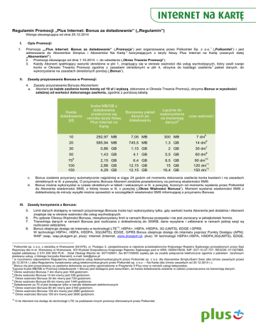 Regulamin Promocji „Plus Internet: Bonus za doładowanie” („Regulamin”) Wersja obowiązująca od dnia 25.12.2014 I. 1. II. Opis Promocji: Promocja „„Plus Internet: Bonus za doładowanie” („Promocja”) jest organizowana przez Polkomtel Sp. z o.o. 1 („Polkomtel”) i jest adresowana do Abonentów Simplus i Abonentów Na Kartę 2 korzystających z taryfy Nowy Plus Internet na Kartę (zwanych dalej „Abonentami”). 2. Promocja obowiązuje od dnia 1.10.2014 r. do odwołania („Okres Trwania Promocji”). 3. Każdy Abonent spełniający warunki określone w pkt 1, znajdujący się w okresie ważności dla usług wychodzących, który zasili swoje konto w Okresie Trwania Promocji zgodnie z zasadami określonymi w pkt 4, otrzyma do każdego zasilenia 3 pakiet danych, do wykorzystania na zasadach określonych poniżej („Bonus”). Zasady przyznawania Bonusa w Promocji: 4. Zasady przyznawania Bonusa Abonentom: a. Abonent za każde zasilenie konta kwotą od 10 zł i wyższą, dokonane w Okresie Trwania Promocji, otrzyma Bonus w wysokości zależnej od wartości dokonanego zasilenia, zgodnie z poniższą tabelą: Kwota doładowania [zł] d. III. Bonusowy pakiet danych po doładowaniu Łącznie do wykorzystania na transmisję 4 danych czas ważności 5 10 292,97 MB 7,05 MB 300 MB 7 dni 20 585,94 MB 745,5 MB 1,3 GB 14 dni 30 0,86 GB 1,15 GB 2 GB 30 dni 50 1,43 GB 4,1 GB 5,5 GB 60 dni 9 2,15 GB 2,86 GB 4,29 GB 6,4 GB 12,15 GB 12,15 GB 8,5 GB 15 GB 16,4 GB 90 dni 11 120 dni 12 150 dni 75 100 150 c. liczba MB/GB z doładowania przeliczona wg cennika taryfy Nowy Plus Internet na Kartę 6 7 8 10 Bonus zostanie przyznany automatycznie najpóźniej w ciągu 24 godzin od momentu dokonania zasilenia konta kwotami i na zasadach określonych w lit. a powyżej. O przyznaniu Bonusa Abonent zostanie powiadomiony za pomocą wiadomości SMS. Bonus można wykorzystać w czasie określonym w tabeli i wskazanym w lit. a powyżej, liczonym od momentu wysłania przez Polkomtel do Abonenta wiadomości SMS, o której mowa w lit. c powyżej („Okres Ważności Bonusa”). Moment wysłania wiadomości SMS z dokładnością do minuty wysyłki można sprawdzić w szczegółach wiadomości SMS informującej o przyznaniu Bonusa. Zasady korzystania z Bonusa: 5. 6. 7. 8. Limit danych dostępny w ramach przyznanego Bonusa może być wykorzystany tylko, gdy wartość konta Abonenta jest dodatnia i Abonent znajduje się w okresie ważności dla usług wychodzących. Po upływie Okresu Ważności Bonusa, niewykorzystany limit w ramach Bonusa przepada i nie jest zwracany w jakiejkolwiek formie. Transmisja danych w ramach Bonusa jest rozliczana z dokładnością do 300KB, dane wysyłane i odbierane w ramach jednej sesji są rozliczane oddzielnie. Bonus obejmuje dostęp do Internetu w technologii LTE13, HSPA+, HSPA, HSDPA, 3G (UMTS), EDGE i GPRS. W technologii HSPA+, HSPA, HSDPA, 3G(UMTS), EDGE, GPRS Bonus obejmuje dostęp do internetu poprzez Punkty Dostępu (APN): WAP (wap, wap.plusgsm.pl, plus); Internet (Internet, www.plusgsm.pl, plus). W technologii HSPA+,HSPA, HSDPA,3G(UMTS), EDGE, 1 Polkomtel sp. z o.o. z siedzibą w Warszawie (02-676), ul. Postępu 3, zarejestrowana w rejestrze przedsiębiorców Krajowego Rejestru Sądowego prowadzonym przez Sąd Rejonowy dla m.st. Warszawy w Warszawie, XIII Wydział Gospodarczy Krajowego Rejestru Sądowego pod nr KRS: 0000419430, NIP: 527-10-37-727, REGON: 011307968, kapitał zakładowy 3 510 300 000 PLN, . Dział Obsługi Klienta tel. 601102601, fax 601102602 (opłaty jak za zwykłe połączenie telefoniczne zgodnie z pakietem taryfowym dostawcy usług, z którego korzysta Abonent), e-mail: [email protected] 2 w rozumieniu odpowiednio Regulaminu świadczenia usług telekomunikacyjnych przez Polkomtel sp. z o.o. dla Abonentów Simplu/Sami Swoi (dla Umów zawartych przed 25.12.2014 r.) albo Regulaminu świadczenia usług telekomunikacyjnych przez Polkomtel sp. z o.o. – Na Kartę (dla Umów zawartych od 25.12.2014 r.). 3 Bonus nie jest przyznawany za zasilenia dokonane za punkty zgromadzone w Programie 5 Plus oraz w ramach usługi teleprzelew. 4 Łączna liczba MB/GB w Promocji (doładowanie + Bonus) jest dostępna pod warunkiem, że kwota doładowania zostanie w całości przeznaczona na transmisję danych. 5 Okres ważności Bonusa 7 dni równy jest 168 godzinom. 6 Okres ważności Bonusa 14 dni równy jest 336 godzinom. 77 Okres ważności Bonusa 30 dni równy jest 720 godzinom. 8 Okres ważności Bonusa 60 dni równy jest 1440 godzinom. 9 Doładowanie za 75 zł jest dostępne tylko w kanale doładowań elektronicznych 10 Okres ważności Bonusa 90 dni równy jest 2160 godzinom. 11 Okres ważności Bonusa 120 dni równy jest 2880 godzinom. 12 Okres ważności Bonusa 150 dni równy jest 3600 godzinom. 13 O ile Abonent ma dostęp do technologii LTE na podstawie innych promocji oferowanych przez Polkomtel. 9. 10. 11. 12. 13. 14. IV. GPRS Bonus nie obejmuje pakietowej transmisji danych poprzez Punkt Dostępu (APN): video.plusgsm.pl, i za pomocą protokołu (RTSP) („Video Streaming") oraz transmisji danych w ramach usługi MMS, które rozliczane są zgodnie z Cennikiem Taryfy Nowy Plus Internet na Kartę. Transmisja danych w ramach APN wap.plus.pl przy połączeniach z portalem Plus.pl nie pomniejsza jednostek dostępnych w ramach Bonusa a opłaty naliczane są zgodnie z Taryfą Nowy Plus Internet na Kartę bądź regulaminem promocji „Plus.pl najlepszy portal w komórce bez dodatkowych opłat”. W technologii LTE Bonus obejmuje dostęp do internetu poprzez Punkt Dostępu (APN): Internet oraz plus. Bonus obejmuje połączenia transmisji „Video Streaming". Z Bonusa nie można korzystać w roamingu. Abonent w Okresie Trwania Promocji może korzystać z Promocji i otrzymywać Bonus dowolną liczbę razy. Abonent ma możliwość sprawdzenia pozostałego limitu w ramach przyznanego Bonusa oraz dnia, w którym upływa Okres Ważności Bonusa za pomocą krótkiego kodu: *12