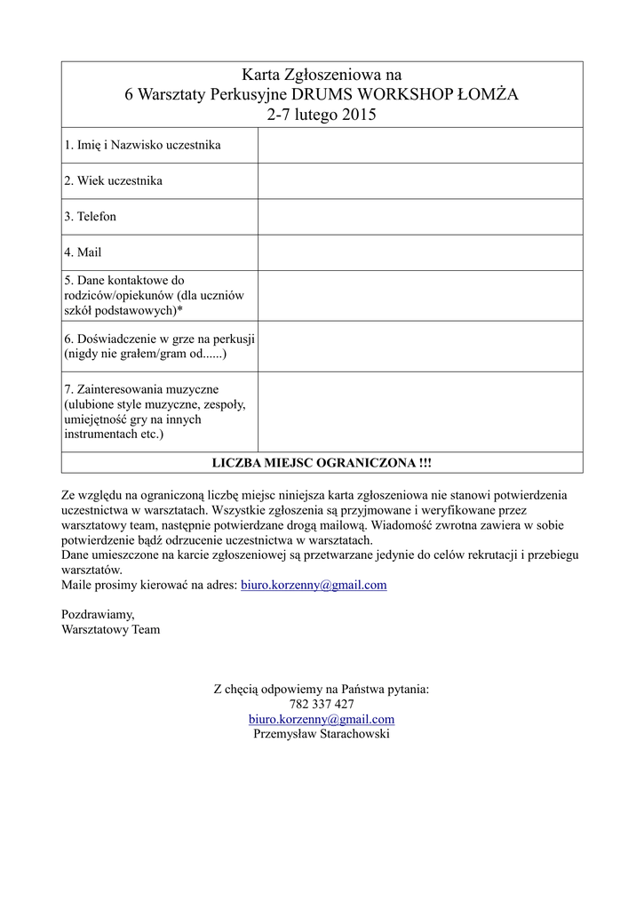 Karta Zgłoszeniowa na 6 Warsztaty Perkusyjne DRUMS WORKSHOP ŁOMŻA 2-7 lutego 2015 1. Imię i Nazwisko uczestnika 2. Wiek uczestnika 3. Telefon 4. Mail 5. Dane kontaktowe do rodziców/opiekunów (dla uczniów szkół podstawowych)* 6. Doświadczenie w grze na perkusji (nigdy nie grałem/gram od......) 7. Zainteresowania muzyczne (ulubione style muzyczne, zespoły, umiejętność gry na innych instrumentach etc.) LICZBA MIEJSC OGRANICZONA !!! Ze względu na ograniczoną liczbę miejsc niniejsza karta zgłoszeniowa nie stanowi potwierdzenia uczestnictwa w warsztatach. Wszystkie zgłoszenia są przyjmowane i weryfikowane przez warsztatowy team, następnie potwierdzane drogą mailową. Wiadomość zwrotna zawiera w sobie potwierdzenie bądź odrzucenie uczestnictwa w warsztatach. Dane umieszczone na karcie zgłoszeniowej są przetwarzane jedynie do celów rekrutacji i przebiegu warsztatów. Maile prosimy kierować na adres: [email protected] Pozdrawiamy, Warsztatowy Team Z chęcią odpowiemy na Państwa pytania: 782 337 427 [email protected] Przemysław Starachowski