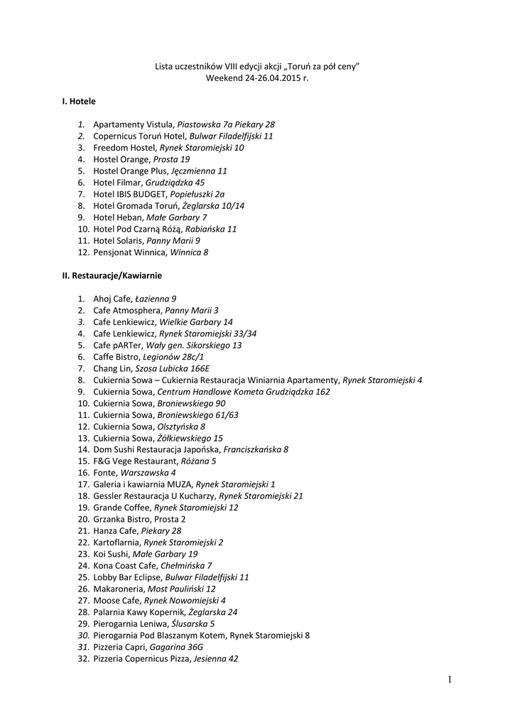 Lista uczestników VIII edycji akcji „Toruo za pół ceny” Weekend 24-26.04.2015 r. I. Hotele 1. 2. 3. 4. 5. 6. 7. 8. 9. 10. 11. 12. Apartamenty Vistula, Piastowska 7a Piekary 28 Copernicus Toruo Hotel, Bulwar Filadelfijski 11 Freedom Hostel, Rynek Staromiejski 10 Hostel Orange, Prosta 19 Hostel Orange Plus, Jęczmienna 11 Hotel Filmar, Grudziądzka 45 Hotel IBIS BUDGET, Popiełuszki 2a Hotel Gromada Toruo, Żeglarska 10/14 Hotel Heban, Małe Garbary 7 Hotel Pod Czarną Różą, Rabiaoska 11 Hotel Solaris, Panny Marii 9 Pensjonat Winnica, Winnica 8 II. Restauracje/Kawiarnie 1. 2. 3. 4. 5. 6. 7. 8. 9. 10. 11. 12. 13. 14. 15. 16. 17. 18. 19. 20. 21. 22. 23. 24. 25. 26. 27. 28. 29. 30. 31. 32. Ahoj Cafe, Łazienna 9 Cafe Atmosphera, Panny Marii 3 Cafe Lenkiewicz, Wielkie Garbary 14 Cafe Lenkiewicz, Rynek Staromiejski 33/34 Cafe pARTer, Wały gen. Sikorskiego 13 Caffe Bistro, Legionów 28c/1 Chang Lin, Szosa Lubicka 166E Cukiernia Sowa – Cukiernia Restauracja Winiarnia Apartamenty, Rynek Staromiejski 4 Cukiernia Sowa, Centrum Handlowe Kometa Grudziądzka 162 Cukiernia Sowa, Broniewskiego 90 Cukiernia Sowa, Broniewskiego 61/63 Cukiernia Sowa, Olsztyoska 8 Cukiernia Sowa, Żółkiewskiego 15 Dom Sushi Restauracja Japooska, Franciszkaoska 8 F&G Vege Restaurant, Różana 5 Fonte, Warszawska 4 Galeria i kawiarnia MUZA, Rynek Staromiejski 1 Gessler Restauracja U Kucharzy, Rynek Staromiejski 21 Grande Coffee, Rynek Staromiejski 12 Grzanka Bistro, Prosta 2 Hanza Cafe, Piekary 28 Kartoflarnia, Rynek Staromiejski 2 Koi Sushi, Małe Garbary 19 Kona Coast Cafe, Chełmioska 7 Lobby Bar Eclipse, Bulwar Filadelfijski 11 Makaroneria, Most Paulioski 12 Moose Cafe, Rynek Nowomiejski 4 Palarnia Kawy Kopernik, Żeglarska 24 Pierogarnia Leniwa, Ślusarska 5 Pierogarnia Pod Blaszanym Kotem, Rynek Staromiejski 8 Pizzeria Capri, Gagarina 36G Pizzeria Copernicus Pizza, Jesienna 42 1 33. 34. 35. 36. 37. 38. 39. 40. 41. 42. 43. 44. 45. 46. 47. 48. 49. 50. 51. 52. 53. 54. 55. 56. 57. 58. 59. 60. Pizzeria DI CLAUDIO, Centrum Handlowe Kometa Grudziądzka 162 Pizzeria „Domowa Pizza” pod Arkadami, Różana 5 Pizzeria Gruby Benek, Szosa Lubicka 166h Pizzeria R1, Łyskowskiego 29/35 Pizzeria Wiki, Poznaoska 73 Presto - Starówka, Franciszkaoska 20 Redberry Polska, Broniewskiego 90 Restauracja Celia Cooking, Dziewulskiego 21 Restauracja Hotelu Heban, Małe Garbary 7 Restauracja Kashmir, Wojska Polskiego 43/45 Restauracja KFC Drive Thru, Szosa Lubicka 109/111 Restauracja KFC Bielawy, Olsztyoska 8 Restauracja Kuranty Toruo, Rynek Staromiejski 29 Restauracja La Mancha, Mostowa 19 Restauracja Legenda, Rynek Nowomiejski 3 Restauracja Meza, Chełmioska 12 Restauracja Monte Carlo, Dożynkowa 9c Restauracja Oberża, Rabiaoska 9 Restauracja Olender, Cierpice Toruoska 34/40 Restauracja Ponte, Mostowa 3 Restauracja Solaris, Panny Marii 9 Restauracja Zielona Oliwka, Poznaoska 49 Royal India, Prosta 19 Subway, Szeroka 32B Subway, Broniewskiego 90 Subway, Żółkiewskiego 15 Telepizza, Rynek Nowomiejski 2 Trzy Smaki, Mazowiecka 43 III. Kulturalne 1. Afisz – Teatr Impresaryjny, Bulwar Filadelfijski 18 2. Biuro Turystyczne COPERNICANA, Żeglarska 31/1 3. Centrum Astronomii UMK Obserwatorium Astronomiczne w Piwnicach 4. Centrum Kultury Zamek Krzyżacki, Przedzamcze 3 5. Dom Legend Toruoskich, Szeroka 35 6. Fort IV, Chrobrego 86 7. Galeria Sztuki WOZOWNIA, Rabiaoska 20 8. Muzeum Etnograficzne im. Marii Znamierowskiej-Prűfferowej w Toruniu, Wały gen. Sikorskiego 19 9. Muzeum Okręgowe w Toruniu, Rynek Staromiejski 1 (Ratusz Staromiejski, Rynek Staromiejski 1, /Dom Mikołaja Kopernika, Kopernika 15/17, /Kamienica Pod Gwiazdą, Rynek Staromiejski 35, /Dom Eskenów, Łazienna 16, /Muzeum Podróżników im. Tony’ego Halika, Franciszkaoska 9/11) 10. Mydło i pachnidło, Browarna 4 11. Oddział Miejski PTTK w Toruniu, Biuro Obsługi Ruchu Turystycznego PTTK, Plac Rapackiego 2 12. Ośrodek Informacji Turystycznej, Rynek Staromiejski 25 13. Planetarium im. Władysława Dziewulskiego, Franciszkaoska 15-21 14. Toruoska Orkiestra Symfoniczna, Rynek Staromiejski 6 15. Żywe Muzeum Piernika, Rabiaoska 9 IV. Rekreacja/Zakupy/Usługi 1. 5aSec, Centrum Handlowe Kometa Grudziądzka 162 2. Akademia Nauki, Św. Katarzyny 4 2 3. 4. 5. 6. 7. 8. 9. 10. 11. 12. 13. 14. 15. 16. 17. 18. 19. 20. 21. 22. 23. 24. 25. 26. 27. 28. 29. 30. 31. 32. 33. 34. 35. 36. 37. 38. 39. 40. 41. 42. 43. 44. 45. Bang Bang Studio, Rynek Nowomiejski 27 Basen, Blue Moon Wellness&Spa Copernicus Toruo Hotel, Bulwar Filadelfijski 11 Basen Zespołu Szkół nr 8, Łyskowskiego 28 Bella Line Wellness Centrum, Żółkiewskiego 8 Cardano Jewellery, Św. Katarzyny 4 Centrum Sportu i Rekreacji OLENDER, Cierpice Toruoska 34/40 E-Papierosy – stoisko z elektronicznymi papierosami, Centrum Handlowe Kometa Grudziądzka 162 EWTEX – odzież męska, Centrum Handlowe Kometa Grudziądzka 162 Fragmania Paintball Futsal Kids Toruo Galeria Optyczna, Rynek Nowomiejski 25 GREY WOLF, Szewska 27 Grota Solna Yodo, Św. Józefa 17 Joanna Salon Kosmetyczny, Zbożowa 45B 97A Kniferz Crew, Rynek Nowomiejski 27 Kora – stoisko z torebkami, Centrum Handlowe Kometa Grudziądzka 162 Korty tenisowe Copernicus Toruo Hotel, Bulwar Filadelfijski 11 Kręgielnia Copernicus Toruo Hotel, Bulwar Filadelfijski 11 Manufaktura Słodyczy Karmelowa Kraina, Szewska 2 Manufaktura Słodyczy Smak Dzieciostwa, Kopernika 41/1 MEDiKOM, Podgórna 13b MILAGRE Salon Wyszczuplająco-Upiększający, Staszica 8 MobArt – mobilna myjnia parowa, Małe Garbary 26b/7 MISTER MINIT – naprawa obuwia, dorabianie kluczy, Centrum Handlowe Kometa Grudziądzka 162 Open the Door, Piekary 11/16 Optometria Karczewski KIDS, Rynek Nowomiejski 25 Perfect Wax&Nails Studio Depilacji Woskiem i Stylizacji Paznokci, Kwiatowa 49-51 Plac zabaw TOLUO, Rejtana 2-4 REAL, Centrum Handlowe Kometa Grudziądzka 162 Sa Calobra, Centrum Handlowe Kometa Grudziądzka 162 Salon Kosmetyczny NATHALIE, Grudziądzka 79 Salon Kosmetyczny Sekrety Urody, Chełmioska 10 Sal