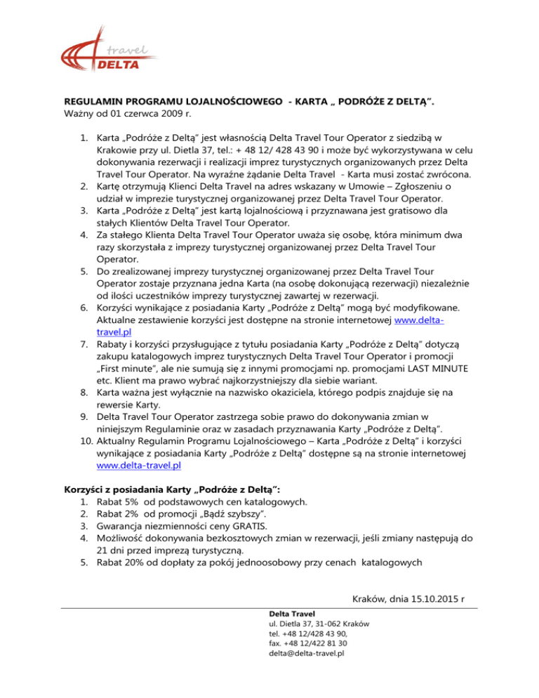 REGULAMIN PROGRAMU LOJALNOŚCIOWEGO - KARTA „ PODRÓŻE Z DELTĄ”. Ważny od 01 czerwca 2009 r. 1. Karta „Podróże z Deltą” jest własnością Delta Travel Tour Operator z siedzibą w Krakowie przy ul. Dietla 37, tel.: + 48 12/ 428 43 90 i może być wykorzystywana w celu dokonywania rezerwacji i realizacji imprez turystycznych organizowanych przez Delta Travel Tour Operator. Na wyraźne żądanie Delta Travel - Karta musi zostać zwrócona. 2. Kartę otrzymują Klienci Delta Travel na adres wskazany w Umowie – Zgłoszeniu o udział w imprezie turystycznej organizowanej przez Delta Travel Tour Operator. 3. Karta „Podróże z Deltą” jest kartą lojalnościową i przyznawana jest gratisowo dla stałych Klientów Delta Travel Tour Operator. 4. Za stałego Klienta Delta Travel Tour Operator uważa się osobę, która minimum dwa razy skorzystała z imprezy turystycznej organizowanej przez Delta Travel Tour Operator. 5. Do zrealizowanej imprezy turystycznej organizowanej przez Delta Travel Tour Operator zostaje przyznana jedna Karta (na osobę dokonującą rezerwacji) niezależnie od ilości uczestników imprezy turystycznej zawartej w rezerwacji. 6. Korzyści wynikające z posiadania Karty „Podróże z Deltą” mogą być modyfikowane. Aktualne zestawienie korzyści jest dostępne na stronie internetowej www.deltatravel.pl 7. Rabaty i korzyści przysługujące z tytułu posiadania Karty „Podróże z Deltą” dotyczą zakupu katalogowych imprez turystycznych Delta Travel Tour Operator i promocji „First minute”, ale nie sumują się z innymi promocjami np. promocjami LAST MINUTE etc. Klient ma prawo wybrać najkorzystniejszy dla siebie wariant. 8. Karta ważna jest wyłącznie na nazwisko okaziciela, którego podpis znajduje się na rewersie Karty. 9. Delta Travel Tour Operator zastrzega sobie prawo do dokonywania zmian w niniejszym Regulaminie oraz w zasadach przyznawania Karty „Podróże z Deltą”. 10. Aktualny Regulamin Programu Lojalnościowego – Karta „Podróże z Deltą” i korzyści wynikające z posiadania Karty „Podróże z Deltą” dostępne są na stronie internetowej www.delta-travel.pl Korzyści z posiadania Karty „Podróże z Deltą”: 1. Rabat 5% od podstawowych cen katalogowych. 2. Rabat 2% od promocji „Bądź szybszy”. 3. Gwarancja niezmienności ceny GRATIS. 4. Możliwość dokonywania bezkosztowych zmian w rezerwacji, jeśli zmiany następują do 21 dni przed imprezą turystyczną. 5. Rabat 20% od dopłaty za pokój jednoosobowy przy cenach katalogowych Kraków, dnia 15.10.2015 r Delta Travel ul. Dietla 37, 31-062 Kraków tel. +48 12/428 43 90, fax. +48 12/422 81 30 [email protected]