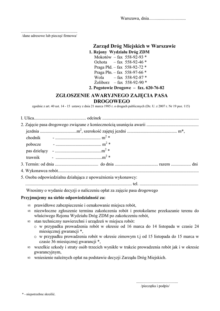 Warszawa, dnia........................................ ............................................................. /dane adresowe lub pieczęć firmowa/ Zarząd Dróg Miejskich w Warszawie 1. Rejony Wydziału Dróg ZDM Mokotów – fax 558-92-93 * Ochota – fax 558-92-46 * Praga Płd. – fax 558-92-72 * Praga Płn. – fax 558-97-66 * Wola – fax 558-92-87 * śoliborz – fax 558-92-90 * 2. Pogotowie Drogowe – fax. 620-76-82 ZGŁOSZENIE AWARYJNEGO ZAJĘCIA PASA DROGOWEGO zgodnie z art. 40 ust. 14 - 15 ustawy z dnia 21 marca 1985 r. o drogach publicznych (Dz. U. z 2007 r. Nr 19 poz. 115) l. Ulica............................................... odcinek ....................................................................................... 2. Zajęcie pasa drogowego związane z koniecznością usunięcia awarii ............................................... jezdnia .................................m2, szerokość zajętej jezdni ............................................. m*, chodnik - ......................................... m2 * pobocze - ......................................... m2 * pas dzielący - ..........................................m2 * trawnik - ..........................................m2 * 3. Termin: od dnia ....................................... do dnia ....................................... razem .................. dni 4. Wykonawca robót............................................................................................................................... 5. Osoba odpowiedzialna działająca z upowaŜnienia wykonawcy: ................................................................................................ tel. ..................................................... Wnosimy o wydanie decyzji o naliczeniu opłat za zajęcie pasa drogowego Przyjmujemy na siebie odpowiedzialność za: • • • • • prawidłowe zabezpieczenie i oznakowanie miejsca robót, niezwłoczne zgłoszenie terminu zakończenia robót i protokolarne przekazanie terenu do właściwego Rejonu Wydziału Dróg ZDM po zakończeniu robót, stan techniczny nawierzchni i urządzeń w miejscu robót: o w przypadku prowadzenia robót w okresie od 16 marca do 14 listopada w czasie 24 miesięcznej gwarancji *, o w przypadku prowadzenia robót w okresie zimowym t.j od 15 listopada do 15 marca w czasie 36 miesięcznej gwarancji *, wszelkie szkody i straty osób trzecich wynikłe w trakcie prowadzenia robót jak i w okresie gwarancyjnym, wniesienie naleŜnych opłat na podstawie decyzji Zarządu Dróg Miejskich. ............................................. /pieczątka i podpis/ * - niepotrzebne skreślić. SZKIC ZAJĘCIA