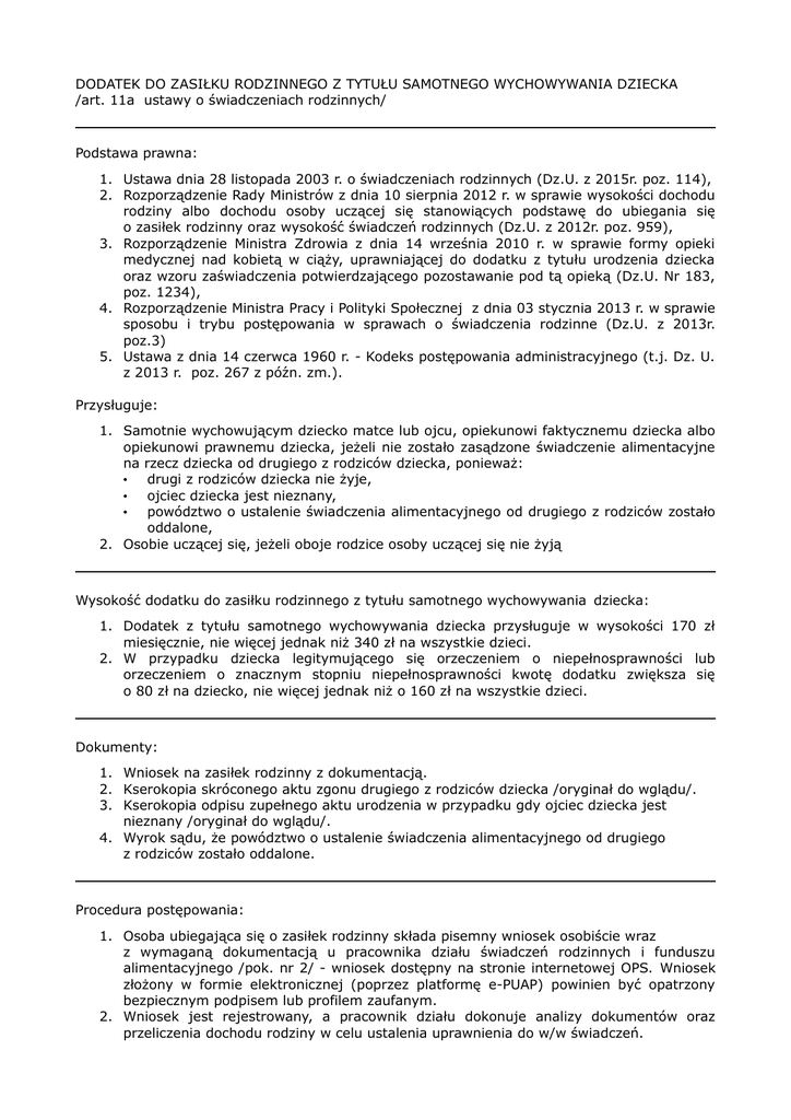 DODATEK DO ZASIŁKU RODZINNEGO Z TYTUŁU SAMOTNEGO WYCHOWYWANIA DZIECKA /art. 11a ustawy o świadczeniach rodzinnych/ Podstawa prawna: 1. Ustawa dnia 28 listopada 2003 r. o świadczeniach rodzinnych (Dz.U. z 2015r. poz. 114), 2. Rozporządzenie Rady Ministrów z dnia 10 sierpnia 2012 r. w sprawie wysokości dochodu rodziny albo dochodu osoby uczącej się stanowiących podstawę do ubiegania się o zasiłek rodzinny oraz wysokość świadczeń rodzinnych (Dz.U. z 2012r. poz. 959), 3. Rozporządzenie Ministra Zdrowia z dnia 14 września 2010 r. w sprawie formy opieki medycznej nad kobietą w ciąży, uprawniającej do dodatku z tytułu urodzenia dziecka oraz wzoru zaświadczenia potwierdzającego pozostawanie pod tą opieką (Dz.U. Nr 183, poz. 1234), 4. Rozporządzenie Ministra Pracy i Polityki Społecznej z dnia 03 stycznia 2013 r. w sprawie sposobu i trybu postępowania w sprawach o świadczenia rodzinne (Dz.U. z 2013r. poz.3) 5. Ustawa z dnia 14 czerwca 1960 r. - Kodeks postępowania administracyjnego (t.j. Dz. U. z 2013 r. poz. 267 z późn. zm.). Przysługuje: 1. Samotnie wychowującym dziecko matce lub ojcu, opiekunowi faktycznemu dziecka albo opiekunowi prawnemu dziecka, jeżeli nie zostało zasądzone świadczenie alimentacyjne na rzecz dziecka od drugiego z rodziców dziecka, ponieważ: • drugi z rodziców dziecka nie żyje, • ojciec dziecka jest nieznany, • powództwo o ustalenie świadczenia alimentacyjnego od drugiego z rodziców zostało oddalone, 2. Osobie uczącej się, jeżeli oboje rodzice osoby uczącej się nie żyją Wysokość dodatku do zasiłku rodzinnego z tytułu samotnego wychowywania dziecka: 1. Dodatek z tytułu samotnego wychowywania dziecka przysługuje w wysokości 170 zł miesięcznie, nie więcej jednak niż 340 zł na wszystkie dzieci. 2. W przypadku dziecka legitymującego się orzeczeniem o niepełnosprawności lub orzeczeniem o znacznym stopniu niepełnosprawności kwotę dodatku zwiększa się o 80 zł na dziecko, nie więcej jednak niż o 160 zł na wszystkie dzieci. Dokumenty: 1. Wniosek na zasiłek rodzinny z dokumentacją. 2. Kserokopia skróconego aktu zgonu drugiego z rodziców dziecka /oryginał do wglądu/. 3. Kserokopia odpisu zupełnego aktu urodzenia w przypadku gdy ojciec dziecka jest nieznany /oryginał do wglądu/. 4. Wyrok sądu, że powództwo o ustalenie świadczenia alimentacyjnego od drugiego z rodziców zostało oddalone. Procedura postępowania: 1. Osoba ubiegająca się o zasiłek rodzinny składa pisemny wniosek osobiście wraz z wymaganą dokumentacją u pracownika działu świadczeń rodzinnych i funduszu alimentacyjnego /pok. nr 2/ - wniosek dostępny na stronie internetowej OPS. Wniosek złożony w formie elektronicznej (poprzez platformę e-PUAP) powinien być opatrzony bezpiecznym podpisem lub profilem zaufanym. 2. Wniosek jest rejestrowany, a pracownik działu dokonuje analizy dokumentów oraz przeliczenia dochodu rodziny w celu ustalenia uprawnienia do w/w świadczeń. 3. Wniosek zostaje przekazany dyrektorowi Ośrodka do akceptacji. 4. Po akceptacji wniosek zostaje wprowadzony przez pracownika działu do programu informatycznego. 5. Zaakceptowany wniosek przez dyrektora Ośrodka stanowi podstawę do wydania decyzji administracyjnej. 6. Decyzja podpisana przez dyrektora Ośrodka lub jego zastępcę zostaje przekazana wnioskodawcy za potwierdzeniem odbioru. 7. Stronie niezadowolonej z podjętej decyzji lub w przypadku decyzji odmownej przysługuje prawo wniesienia odwołania za pośrednictwem Dyrektora Ośrodka do Samorządowego Kolegium Odwoławczego w Krakowie w terminie 14 dni od daty otrzymania decyzji, które to odwołanie składa się w formie pisemnej w sekretariacie Ośrodka /pok. nr 4/ lub za pośrednictwem poczty. Decyzja nie podlega opłacie.