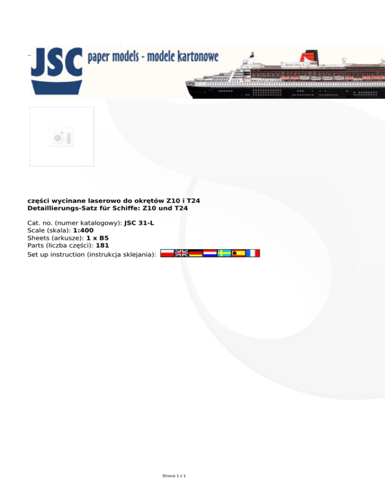 części wycinane laserowo do okrętów Z10 i T24 Detaillierungs-Satz für Schiffe: Z10 und T24 Cat. no. (numer katalogowy): JSC 31-L Scale (skala): 1:400 Sheets (arkusze): 1 x B5 Parts (liczba części): 181 Set up instruction (instrukcja sklejania): Strona 1 z 1