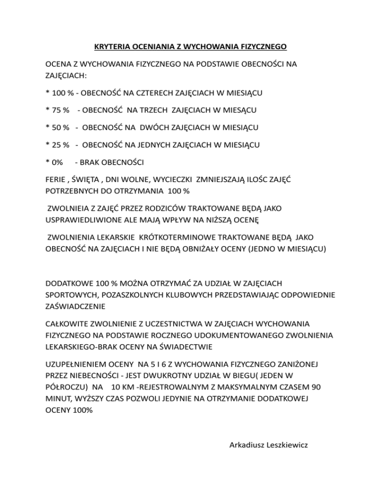 KRYTERIA OCENIANIA Z WYCHOWANIA FIZYCZNEGO OCENA Z WYCHOWANIA FIZYCZNEGO NA PODSTAWIE OBECNOŚCI NA ZAJĘCIACH: * 100 % - OBECNOŚĆ NA CZTERECH ZAJĘCIACH W MIESIĄCU * 75 % - OBECNOŚĆ NA TRZECH ZAJĘCIACH W MIESĄCU * 50 % - OBECNOŚĆ NA DWÓCH ZAJĘCIACH W MIESIĄCU * 25 % - OBECNOŚĆ NA JEDNYCH ZAJĘCIACH W MIESIĄCU * 0% - BRAK OBECNOŚCI FERIE , ŚWIĘTA , DNI WOLNE, WYCIECZKI ZMNIEJSZAJĄ ILOŚC ZAJĘĆ POTRZEBNYCH DO OTRZYMANIA 100 % ZWOLNIEIA Z ZAJĘĆ PRZEZ RODZICÓW TRAKTOWANE BĘDĄ JAKO USPRAWIEDLIWIONE ALE MAJĄ WPŁYW NA NIŻSZĄ OCENĘ ZWOLNIENIA LEKARSKIE KRÓTKOTERMINOWE TRAKTOWANE BĘDĄ JAKO OBECNOŚĆ NA ZAJĘCIACH I NIE BĘDĄ OBNIŻAŁY OCENY (JEDNO W MIESIĄCU) DODATKOWE 100 % MOŻNA OTRZYMAĆ ZA UDZIAŁ W ZAJĘCIACH SPORTOWYCH, POZASZKOLNYCH KLUBOWYCH PRZEDSTAWIAJĄC ODPOWIEDNIE ZAŚWIADCZENIE CAŁKOWITE ZWOLNIENIE Z UCZESTNICTWA W ZAJĘCIACH WYCHOWANIA FIZYCZNEGO NA PODSTAWIE ROCZNEGO UDOKUMENTOWANEGO ZWOLNIENIA LEKARSKIEGO-BRAK OCENY NA ŚWIADECTWIE UZUPEŁNIENIEM OCENY NA 5 I 6 Z WYCHOWANIA FIZYCZNEGO ZANIŻONEJ PRZEZ NIEBECNOŚCI - JEST DWUKROTNY UDZIAŁ W BIEGU( JEDEN W PÓŁROCZU) NA 10 KM -REJESTROWALNYM Z MAKSYMALNYM CZASEM 90 MINUT, WYŻSZY CZAS POZWOLI JEDYNIE NA OTRZYMANIE DODATKOWEJ OCENY 100% Arkadiusz Leszkiewicz
