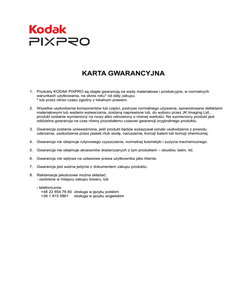 KARTA GWARANCYJNA 1. Produkty KODAK PIXPRO są objęte gwarancją na wady materiałowe i produkcyjne, w normalnych warunkach użytkowania, na okres roku* od daty zakupu. * lub przez okres czasu zgodny z lokalnym prawem. 2. Wszelkie uszkodzenia komponentów lub części, podczas normalnego używania, spowodowane defektami materiałowymi lub wadami wytwarzania, zostaną naprawione lub, do wyboru przez JK Imaging Ltd., produkt zostanie wymieniony na nowy albo odnowiony o równej wartości. Na wymieniony produkt jest oddzielna gwarancja na czas równy pozostałemu czasowi gwarancji oryginalnego produktu. 3. Gwarancja zostanie unieważniona, jeśli produkt będzie wykazywał oznaki uszkodzenia z powodu uderzenia, uszkodzenia przez piasek i/lub wodę, naruszenia, korozji baterii lub korozji chemicznej. 4. Gwarancja nie obejmuje rutynowego czyszczenia, normalnej kosmetyki i zużycia mechanicznego. 5. Gwarancja nie obejmuje akcesoriów dostarczanych z tym produktem – obudów, taśm, itd. 6. Gwarancja nie wpływa na ustawowe prawa użytkownika jako klienta. 7. Gwarancja jest ważna jedynie z dokumentem zakupu produktu. 8. Reklamacje jakościowe można składać: - osobiście w miejscu zakupu towaru, lub - telefonicznie: +48 22 654 76 60 obsługa w języku polskim +36 1 815 5861 obsługa w języku angielskim