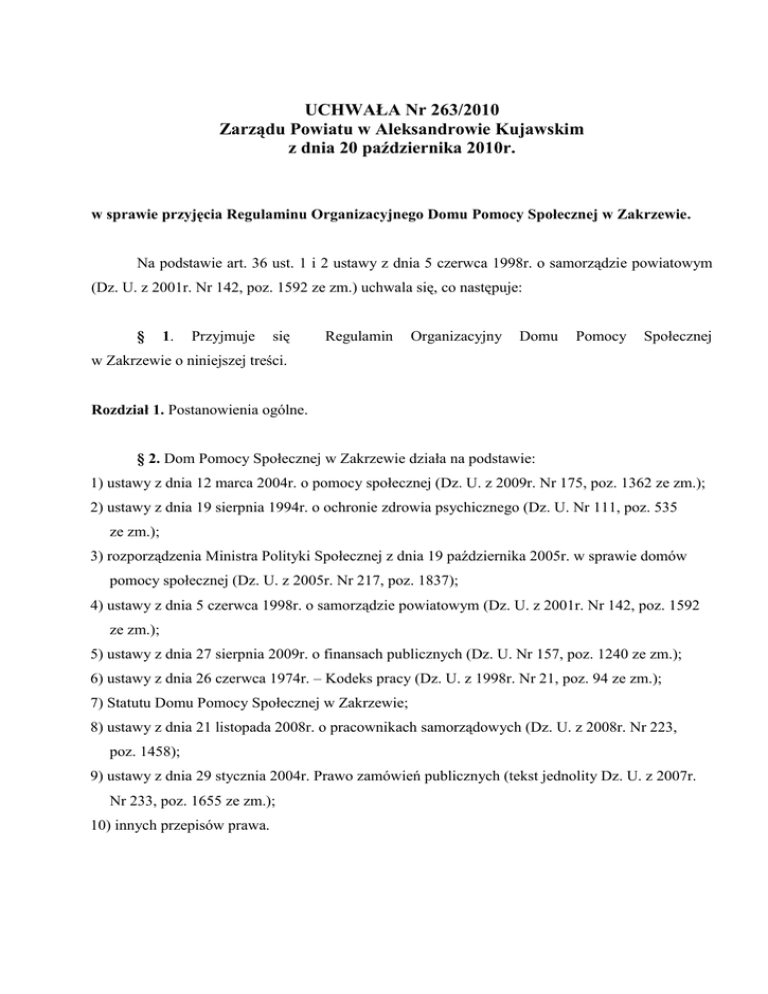 UCHWAŁA Nr 263/2010 Zarządu Powiatu w Aleksandrowie Kujawskim z dnia 20 października 2010r. w sprawie przyjęcia Regulaminu Organizacyjnego Domu Pomocy Społecznej w Zakrzewie. Na podstawie art. 36 ust. 1 i 2 ustawy z dnia 5 czerwca 1998r. o samorządzie powiatowym (Dz. U. z 2001r. Nr 142, poz. 1592 ze zm.) uchwala się, co następuje: § 1. Przyjmuje się Regulamin Organizacyjny Domu Pomocy Społecznej w Zakrzewie o niniejszej treści. Rozdział 1. Postanowienia ogólne. § 2. Dom Pomocy Społecznej w Zakrzewie działa na podstawie: 1) ustawy z dnia 12 marca 2004r. o pomocy społecznej (Dz. U. z 2009r. Nr 175, poz. 1362 ze zm.); 2) ustawy z dnia 19 sierpnia 1994r. o ochronie zdrowia psychicznego (Dz. U. Nr 111, poz. 535 ze zm.); 3) rozporządzenia Ministra Polityki Społecznej z dnia 19 października 2005r. w sprawie domów pomocy społecznej (Dz. U. z 2005r. Nr 217, poz. 1837); 4) ustawy z dnia 5 czerwca 1998r. o samorządzie powiatowym (Dz. U. z 2001r. Nr 142, poz. 1592 ze zm.); 5) ustawy z dnia 27 sierpnia 2009r. o finansach publicznych (Dz. U. Nr 157, poz. 1240 ze zm.); 6) ustawy z dnia 26 czerwca 1974r. – Kodeks pracy (Dz. U. z 1998r. Nr 21, poz. 94 ze zm.); 7) Statutu Domu Pomocy Społecznej w Zakrzewie; 8) ustawy z dnia 21 listopada 2008r. o pracownikach samorządowych (Dz. U. z 2008r. Nr 223, poz. 1458); 9) ustawy z dnia 29 stycznia 2004r. Prawo zamówień publicznych (tekst jednolity Dz. U. z 2007r. Nr 233, poz. 1655 ze zm.); 10) innych przepisów prawa. § 3.1. Regulamin organizacyjny Domu Pomocy Społecznej w Zakrzewie, zwany dalej regulaminem określa: 1) organizację oraz zasady funkcjonowania Domu Pomocy Społecznej w Zakrzewie; 2) zakres działania działów, kierowników i stanowisk pracy; 3) zasady kontroli wewnętrznej. 2. Ilekroć w Regulaminie jest mowa o: 1) Domu – należy przez to rozumieć Dom Pomocy Społecznej w Zakrzewie; 2) Dyrektorze – należy przez to rozumieć Dyrektora Domu Pomocy Społecznej w Zakrzewie; 3) Kierowniku – należy przez to rozumieć Kierownika Działu Domu Pomocy Społecznej w Zakrzewie. § 4.1. Dom ma swoją siedzibę w miejscowości Zakrzewo ul. Inowrocławska 20, w Powiecie Aleksandrowskim w Województwie Kujawsko-Pomorskim. 2. Dom jest domem stałego pobytu dla 100 osób: 1) przewlekle psychicznie chorych; 2) przewlekle somatycznie chorych (do czasu naturalnego wygaśnięcia). 3. Dom może przyjmować mieszkańców również na pobyt czasowy. 4. Dom jest powiatową jednostką budżetową w rozumieniu przepisów ustawy o finansach publicznych. 5. Podstawą gospodarki finansowej jest roczny plan rzeczowo – finansowy sporządzony przez jednostkę i zatwierdzony przez Zarząd Powiatu. § 5. W Domu zamieszkują osoby umieszczone na podstawie obowiązujących przepisów. § 6. Celem Domu jest zapewnienie mieszkańcom całodobowej opieki oraz zaspokajanie niezbędnych potrzeb bytowych, zdrowotnych, społecznych i religijnych na poziomie obowiązujących standardów. § 7.1. Pobyt w Domu jest odpłatny. 2. Odpłatność ustalana jest decyzją administracyjną, zgodnie z obowiązującymi przepisami prawa. Rozdział 2. Organizacja Domu. § 8.1. Domem kieruje jednoosobowo Dyrektor, zatrudniany i zwalniany przez Zarząd Powiatu w Aleksandrowie Kujawskim. 2. Do obowiązków Dyrektora należy w szczególności: 1) kierowanie bieżącymi sprawami Domu; 2) reprezentowanie Domu na zewnątrz; 3) realizacja zadań wynikających z art. 94 Kodeksu pracy; 4) nadzorowanie przestrzegania dyscypliny pracy, bhp, p. poż. itp.; 5) nadzorowanie prawidłowej realizacji budżetu; 6) podejmowanie działań w celu zapewnienia mieszkańcom odpowiedniego poziomu usług zgodnie z obowiązującymi standardami; 7) współpraca z Zarządem Powiatu, Radą Powiatu i jej komisjami oraz z PCPR-em; 8) Odpowiadanie za gospodarowanie mieniem powiatu. 3. W czasie nieobecności Dyrektora Domu związanej w szczególności: z urlopem, absencją chorobową, wyjazdem służbowym obowiązki pełni główny księgowy a w razie jego nieobecności inny upoważniony pracownik. 4. Prawa i obowiązki pracodawcy i pracowników związane z porządkiem w Domu określa regulamin pracy ustalony przez Dyrektora. 5. Starosta Aleksandrowski przy pomocy Powiatowego Centrum Pomocy Rodzinie w Aleksandrowie Kujawskim sprawuje nadzór nad działalnością Domu. § 9.1. Zadania Domu realizowane są przez działy, które posługują się w korespondencji odpowiednimi symbolami: 1) Dział Terapeutyczno – Opieuńczy – DPT; 2) Dział Administracyjno – Księgowy – DPA; 3) Dział Techniczno – Gospodarczy – DPG. 2. Schemat organizacyjny Domu Pomocy Społecznej w Zakrzewie stanowi załącznik nr 1 do niniejszego regulaminu. § 10.1. Pracą działów kierują Kierownicy. 2. Kierownicy działów ponoszą przed Dyrektorem jednoosobową odpowiedzialność za wyniki pracy działów, ich organizację pracy oraz prawidłowe i sprawne wykonywanie zadań. 3. Do obowiązków kierowników działów należy w szczególności: 1) nadzór nad realizacją zadań; 2) zapewnienie prawidłowego obiegu, ewidencji i przechowywania dokumentów i pism skierowanych do działów z zachowaniem tajemnicy służbowej; 3) nadzór nad przestrzeganiem przez pracowników działu dyscypliny pracy, dbałość o powierzone pomieszczenia, sprzęt i wyposażenie. Rozdział 3 . Zakres i poziom świadczonych usług przez Dom. § 11.1.Standard świadczonych usług Domu dostosowuje się do indywidualnych potrzeb i możliwości psychofizycznych mieszkańców Domu. 2. Dom zapewnia w szczególności: 1) w zakresie potrzeb bytowych: a) miejsce zamieszkania, b) wyżywienie, c) odzież, obuwie, d) utrzymanie czystości; 2) usługi opiekuńcze polegające na: a) udzielaniu pomocy w podstawowych czynnościach życiowych, b) pielęgnacji, c) podnoszeniu sprawności i aktywności mieszkańców, d) niezbędnej pomocy w załatwianiu spraw osobistych; 3) usługi wspomagające polegające na: a) umożliwieniu udziału w terapii zajęciowej, b) 