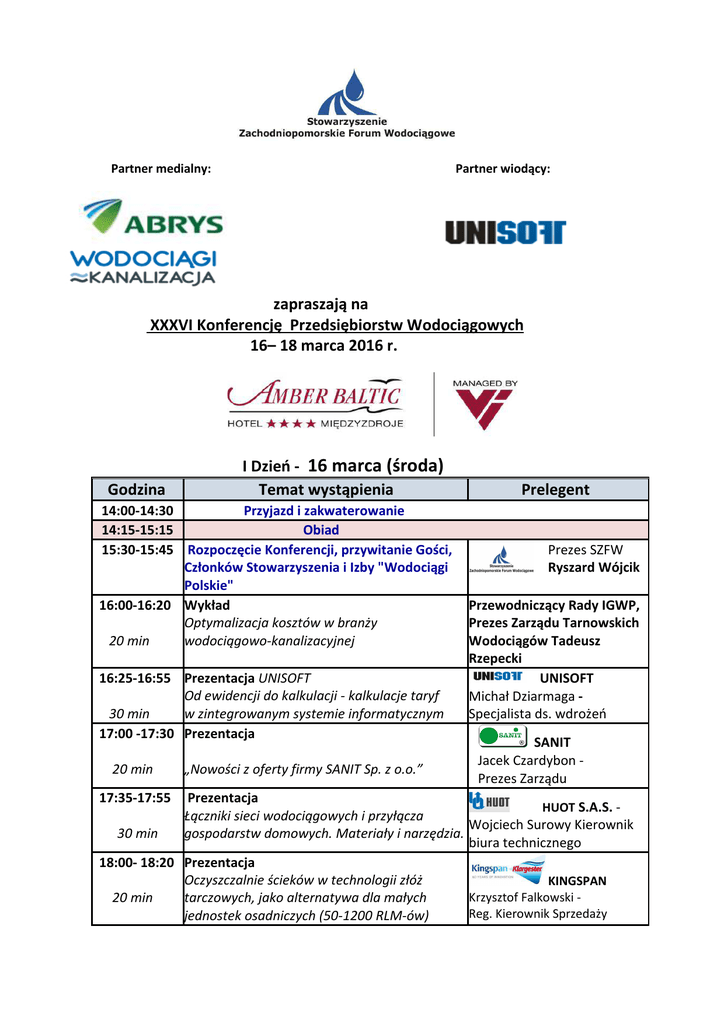 Partner medialny: Partner wiodący: zapraszają na XXXVI Konferencję Przedsiębiorstw Wodociągowych 16– 18 marca 2016 r. Godzina I Dzień - 16 marca (środa) Temat wystąpienia 14:00-14:30 Przyjazd i zakwaterowanie 14:15-15:15 Obiad 15:30-15:45 Rozpoczęcie Konferencji, przywitanie Gości, Członków Stowarzyszenia i Izby "Wodociągi Polskie" 16:00-16:20 Wykład Optymalizacja kosztów w branży 20 min wodociągowo-kanalizacyjnej 16:25-16:55 Prezentacja UNISOFT Od ewidencji do kalkulacji - kalkulacje taryf 30 min w zintegrowanym systemie informatycznym 17:00 -17:30 Prezentacja 20 min 17:35-17:55 „Nowości z oferty firmy SANIT Sp. z o.o.” Prelegent Prezes SZFW Ryszard Wójcik Przewodniczący Rady IGWP, Prezes Zarządu Tarnowskich Wodociągów Tadeusz Rzepecki UNISOFT Michał Dziarmaga Specjalista ds. wdrożeń SANIT Jacek Czardybon Prezes Zarządu Prezentacja HUOT S.A.S. Łączniki sieci wodociągowych i przyłącza Wojciech Surowy Kierownik 30 min gospodarstw domowych. Materiały i narzędzia. biura technicznego 18:00- 18:20 Prezentacja Oczyszczalnie ścieków w technologii złóż KINGSPAN Krzysztof Falkowski 20 min tarczowych, jako alternatywa dla małych Reg. Kierownik Sprzedaży jednostek osadniczych (50-1200 RLM-ów) 20:00 Godzina Kolacja uroczysta II Dzień - 17 marca (czwartek) Temat wystąpienia Prelegent 08:00-10:30 Śniadanie 10:45-11:30 Dyskusja z udziałem przedstawicieli Izby Moderator - Janusz Gospodarczej "Wodociągi Polskie" Dawidziak - Prezes aktualne problemy branży wodociągowo - kan. Goleniowskich Wodociągów 45 min Udział eksperta prawnego - komentarz do Dr Jędrzej Bujny- Radca Rozporządzenia Min. Zdrowia w/s jakości wody Prawny - kancelarie przeznaczonej do spożycia przez ludzi Poznań/Warszawa 11:40-12:00 Prezentacja ATF Poznań Połączenia rurowe STRAUB Andrzej Lewandowski 20 min. Przedstawiciel Regionalny 12:05-12:25 Prezentacja ECOL-UNICON Praktyczne rozwiązania retencyjne Michał Dończak 20 min. z wykorzystaniem zbiorników DZB ECOLDoradca Techn.- Handlowy UNICON dr hab. inż. Marcin Hołub 12:30-12:55 Wykład Prodziekan ds. Organizacji i "Nowoczesne techniki i trendy w redukcji Rozwoju Wydziału 25min uciążliwości zapachowej". Elektrycznego 13:00-13:45 Obiad 14:00-15:30 WALNE ZGROMADZENIE członków SZFW 90 min 16:00-19:00 Turniej bowlingowy o puchar Prezesa 180 min lub wycieczka po Międzyzdrojach 19:30 Wspólna kolacja III Dzień - 18 marca (piątek) 08:00 – 10:30 Śniadanie, wyjazdy Nasi partnerzy : HUFGARD POLSKA