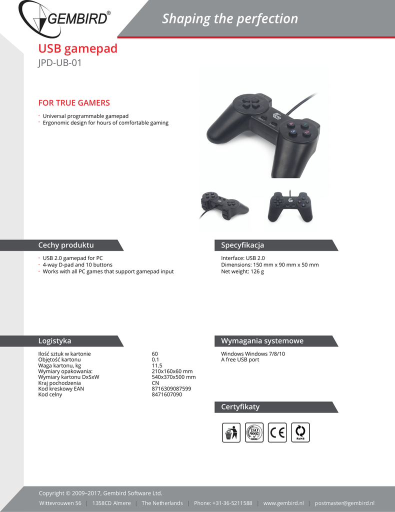 USB gamepad JPD-UB-01 FOR TRUE GAMERS - Universal programmable gamepad - Ergonomic design for hours of comfortable gaming Cechy produktu Specyfikacja - USB 2.0 gamepad for PC - 4-way D-pad and 10 buttons - Works with all PC games that support gamepad input Interface: USB 2.0 Dimensions: 150 mm x 90 mm x 50 mm Net weight: 126 g Logistyka Wymagania systemowe Ilość sztuk w kartonie Objętość kartonu Waga kartonu, kg Wymiary opakowania: Wymiary kartonu DxSxW Kraj pochodzenia Kod kreskowy EAN Kod celny 60 0.1 11.5 210x160x60 mm 540x370x500 mm CN 8716309087599 8471607090 Windows Windows 7/8/10 A free USB port Certyfikaty Copyright © 2009–2017, Gembird Software Ltd. ! " # $ ! "
