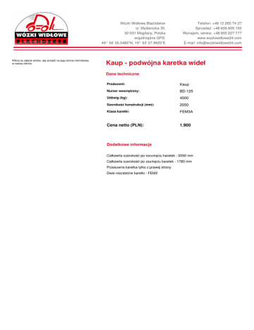 Kliknij na zdjęcie wózka, aby przejść na jego stronę internetową w naszej ofercie. Wózki Widłowe Blachdeker ul. Myślenicka 35, 32-031 Mogilany, Polska współrzędne GPS: 49° 56' 55.5485"N, 19° 53' 27.9925"E Telefon: +48 12 265 74 27 Sprzedaż: +48 606 605 100 Wynajem, serwis: +48 600 227 777 www.wozkiwidlowe24.com E-mail: [email protected] Kaup - podwójna karetka wideł Dane techniczne Producent: Kaup Numer wewnętrzny: BD-125 Udźwig (kg): 4000 Szerokość konstrukcji (mm): 2050 Klasa karetki: FEM3A Cena netto (PLN): 1.900 Dodatkowe informacje Całkowita szerokość po rozunięciu karetek - 2050 mm Całkowita szerokość po zsunięciu karetek - 1780 mm Przesuwna karetka tylko z prawej strony Dwie niezależne karetki - FEM2