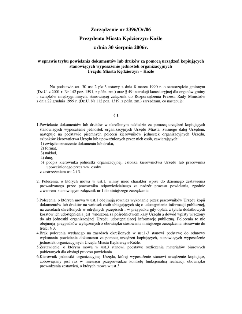 Zarządzenie nr 2396/Or/06 Prezydenta Miasta Kędzierzyn-Koźle z dnia 30 sierpnia 2006r. w sprawie trybu powielania dokumentów lub druków za pomocą urządzeń kopiujących stanowiących wyposażenie jednostek organizacyjnych Urzędu Miasta Kędzierzyn – Koźle Na podstawie art. 30 ust 2 pkt.3 ustawy z dnia 8 marca 1990 r. o samorządzie gminnym (Dz.U. z 2001 r. Nr 142 poz. 1591, z późn. zm.) oraz § 49 instrukcji kancelaryjnej dla organów gminy i związków międzygminnych, stanowiącej załącznik do Rozporządzenia Prezesa Rady Ministrów z dnia 22 grudnia 1999 r. (Dz.U. Nr 112 poz. 1319, z późn. zm.) zarządzam, co następuje: §1 1.Powielanie dokumentów lub druków w określonym nakładzie za pomocą urządzeń kopiujących stanowiących wyposażenie jednostek organizacyjnych Urzędu Miasta, zwanego dalej Urzędem, następuje na podstawie pisemnych poleceń kierowników jednostek organizacyjnych Urzędu, członków kierownictwa Urzędu lub upoważnionych przez nich osób, zawierających: 1) zwięzłe oznaczenie dokumentu lub druku, 2) format, 3) nakład, 4) datę, 5) podpis kierownika jednostki organizacyjnej, członka kierownictwa Urzędu lub pracownika upoważnionego przez ww. osoby z zastrzeżeniem ust.2 i 3. 2. Polecenia, o których mowa w ust.1, winny mieć charakter wpisu do dziennego zestawienia prowadzonego przez pracownika odpowiedzialnego za nadzór procesu powielania, zgodnie z wzorem stanowiącym załącznik nr 1 do niniejszego zarządzenia. 3.Polecenia, o których mowa w ust.1 obejmują również wykonanie przez pracowników Urzędu kopii dokumentów lub druków na wniosek osób ubiegających się o udostępnienie informacji publicznej, na zasadach określonych w odrębnych przepisach , w przypadku gdy opłata z tytułu dodatkowych kosztów ich udostępnienia jest wnoszona za pośrednictwem kasy Urzędu a dowód wpłaty włączony do akt jednostki organizacyjnej Urzędu udostępniającej informację publiczną. Polecenia te nie obejmują przypadków wyłączonych z obowiązku stosowania niniejszego zarządzenia ,stosownie do treści § 3. 4.Brak polecenia wydanego na zasadach określonych w ust.1-3 stanowi podstawę do odmowy wykonania powielania dokumentu za pomocą urządzeń kopiujących, stanowiących wyposażenie jednostek organizacyjnych Urzędu Miasta Kędzierzyn-Koźle. 5.Zestawienie, o którym mowa w ust.3 stanowi podstawę rozliczenia materiałów biurowych pobieranych dla obsługi procesu powielania. 6.Kierownik jednostki organizacyjnej Urzędu, której wyposażenie stanowi urządzenie kopiujące, zobowiązany jest raz w miesiącu przeprowadzić kontrolę funkcjonalną realizacji obowiązku prowadzenia zestawień, o których mowa w ust.3. §2 1.Wykaz urządzeń kopiujących oraz pracowników odpowiedzialnych za nadzór procesu powielania i prowadzenia zestawień poleceń kopiowania, o których mowa w §1 ust.3, stanowi załącznik nr 2 do niniejszego zarządzenia. 2.W przypadku wyznaczenia kilku pracowników odpowiedzialnych za nadzór procesu powielania i prowadzenia zestawień poleceń kopiowania, o których mowa w §1 ust.3, kierownicy jednostek organizacyjnych, których wyposażenie stanowią urządzenia kopiujące zobowiązani są ustalić harmonogram określający czas indywidualnej odpowiedzialności tych pracowników za wykonanie czynności o których mowa wyżej. §3 Zarządzenia nie stosuje się do kopii dokumentów lub druków wykonywanych przez osoby ubiegające się o udostępnienie informacji publicznej lub o potwierdzenie treści dokumentów złożonych w Urzędzie za pomocą ogólnodostępnych urządzeń kopiujących wyposażonych w aparat wrzutowy, umożliwiających bezpośrednie wnoszenie przez te osoby opłat z tytułu dodatkowych kosztów wykonania kopii dokumentu lub druku. §4 Traci moc Zarządzenie nr 3/W/01 z dnia 10 stycznia 2001 r. §5 Zarządzenie wchodzi w życie z dniem podjęcia i podlega ogłoszeniu w pomieszczeniach Urzędu Miasta wyposażonych w urządzenia kopiujące oraz pismem okólnym, kierowanym do pracowników odpowiedzialnych za nadzór procesu powielania. PREZYDENT MIASTA KĘDZIERZYN-KOŹLE W i e s ł a w F ą f a r a (-) Odpowiedzialny za sporządzenie informacji: Kierownik Wydziału Organizacyjnego Urzędu Miasta Kędzierzyn-Koźle Zbigniew Romanowicz (-) Załącznik nr 1 do Zarządzenia nr 2396/Or/06 Prezydenta Miasta Kędzierzyn-Koźle z dnia 30 sierpnia 2006r. Kędzierzyn-Koźle dnia……………………. DZIENNE ZESTAWIENIE POLECEŃ KOPIOWANIA DLA POTRZEB URZĘDU Lp. Data Nazwa jednostki organizacyjnej Format Ilość stron Nazwa dokumentu lub druku Podpis osoby upoważnionej do wydania polecenia Stan licznika na koniec dnia …………………………… ….…………………………………………………… Podpis pracownika odpowiedzialnego za nadzór procesu powielania Załącznik nr 2 do Zarządzenia nr 2396/Or/06 Prezydenta Miasta Kędzierzyn-Koźle z dnia 30 sierpnia 2006r. Wykaz urządzeń kopiujących stanowiących własność gminy i wyposażenie jednostek organizacyjnych Urzędu Miasta oraz pracowników odpowiedzialnych za nadzór procesu powielania: Lp. Nazwa środka trwałego 1 Kserokopiarka TOSHIBA DP 3580 2 Kserokopiarka TOSHIBA DP 3580 3 Kserokopiarka OLIVETTI 3050 4 Kserokopiarka SHARP AR – 50122 5 Kserokopiarka PANASONIC DP-1510 6 Kserokopiarka CANON FC 220 7 Kserokopiarka CANON Jednostka organizacyjna Wydział Organizacyjny (kserokopiarnia – p. 034) Wydział organizacyjny (kserokopiarnia – p. 034) Wydział Ochrony Środowiska i Infrastruktury Sekretariat Prezydenta (p.127) Wydział Finansowy ( p.226) Imię i nazwisko osoby odpowiedzialnej za nadzór procesu powielania Monika i Wiesław Mędrys Monika i Wiesław Mędrys Lucyna Płatek Katarzyna Abramik Wiesława Kamińska Barbara Piechulek Jowita Jankowska - Seredziuk Iwona Wąsik Urząd Stanu Cywilnego (p.119) Wydział Spraw Obywatelskich Janina Brożyna ( p.17) Wykaz urządzeń kopiujących dzierżawionych przez