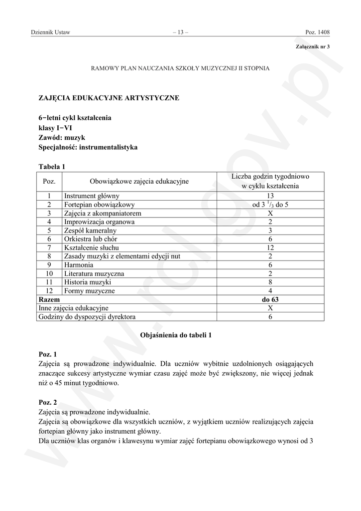 Dziennik Ustaw – 13 – Załącznik nrPoz. 3 1408 Załącznik nr 3 .go v.p l RAMOWY PLAN NAUCZANIA RAMOWY SZKOŁY PLAN NAUCZANIA SZKOŁY MUZYCZNEJ II MUZYCZNEJ STOPNIA II STOPNIA ZAJĘCIA EDUKACYJNE ARTYSTYCZNE 6–letni cykl kształcenia klasy I–VI Zawód: muzyk Specjalność: instrumentalistyka Tabela 1 Poz. Obowiązkowe zajęcia edukacyjne ww w. rcl 1 Instrument główny 2 Fortepian obowiązkowy 3 Zajęcia z akompaniatorem 4 Improwizacja organowa 5 Zespół kameralny 6 Orkiestra lub chór 7 Kształcenie słuchu 8 Zasady muzyki z elementami edycji nut 9 Harmonia 10 Literatura muzyczna 11 Historia muzyki 12 Formy muzyczne Razem Inne zajęcia edukacyjne Godziny do dyspozycji dyrektora Liczba godzin tygodniowo w cyklu kształcenia 13 od 3 1/3 do 5 X 2 3 6 12 2 6 2 8 4 do 63 X 6 Objaśnienia do tabeli 1 Poz. 1 Zajęcia są prowadzone indywidualnie. Dla uczniów wybitnie uzdolnionych osiągających znaczące sukcesy artystyczne wymiar czasu zajęć może być zwiększony, nie więcej jednak niż o 45 minut tygodniowo. Poz. 2 Zajęcia są prowadzone indywidualnie. Zajęcia są obowiązkowe dla wszystkich uczniów, z wyjątkiem uczniów realizujących zajęcia fortepian główny jako instrument główny. Dla uczniów klas organów i klawesynu wymiar zajęć fortepianu obowiązkowego wynosi od 3 10 Dziennik Ustaw – 14 – Poz. 1408 l godzin 15 minut do 5 godzin tygodniowo w cyklu kształcenia. Dopuszcza się możliwość zmniejszenia liczby godzin w cyklu kształcenia po zrealizowaniu podstawy programowej. .go v.p Poz. 3 W klasach I–V zajęcia są prowadzone w wymiarze od 15 do 45 minut tygodniowo w przeliczeniu na jednego ucznia, a w klasie VI – do 2 godzin tygodniowo w przeliczeniu na jednego ucznia. Zajęcia nie są oceniane. Zajęcia nie obowiązują uczniów klas: fortepianu, organów, akordeonu, harfy i gitary. Poz. 4 Zajęcia są prowadzone indywidualnie. Zajęcia są obowiązkowe dla uczniów klasy organów. Poz. 5 Zajęcia mogą być prowadzone łącznie z nauką akompaniamentu. W przypadku uczniów klasy perkusji zajęcia są prowadzone jako zespół perkusyjny. Poz. 6 Zajęcia są prowadzone w okresie nie krótszym niż 3 lata w cyklu kształcenia. rcl Poz. 7 Zajęcia są prowadzone w grupach liczących do 12 uczniów. Poz. 8 i 10–12 Zajęcia są prowadzone w grupach liczących do 16 uczniów. ww w. Poz. 9 Zajęcia są prowadzone w grupach liczących do 12 uczniów. Inne zajęcia edukacyjne mogą obejmować w szczególności: ćwiczenia z harmonii, kontrapunkt, analizę form muzycznych, ćwiczenia z kompozycji, dyrygowanie, emisję głosu, podstawy aranżacji, zespół muzyki rozrywkowej, naukę akompaniamentu. 11 Dziennik Ustaw – 15 – Poz. 1408 l ZAJĘCIA EDUKACYJNE ARTYSTYCZNE Tabela 2 Poz. .go v.p 6–letni cykl kształcenia klasy I–VI Zawód: muzyk Specjalność: instrumentalistyka jazzowa Obowiązkowe zajęcia edukacyjne rcl 1 Instrument główny – jazzowy 2 Fortepian obowiązkowy – jazzowy 3 Kształcenie słuchu 4 Harmonia jazzowa z podstawami improwizacji 5 Historia jazzu z literaturą 6 Big-band 7 Combo (zespół jazzowy) 8 Historia muzyki 9 Formy muzyczne 10 Ćwiczenia rytmiczne 11 Zasady muzyki z elementami edycji nut Razem Inne zajęcia edukacyjne Godziny do dyspozycji dyrektora Liczba godzin tygodniowo w cyklu kształcenia 13 3 12 6 6 4 8 4 4 3 2 65 X 6 Objaśnienia do tabeli 2 ww w. Poz. 1 Zajęcia są prowadzone indywidualnie. Zalecane jest prowadzenie zajęć w obecności innych uczniów. Poz. 2 Zajęcia są prowadzone indywidualnie. Poz. 3 i 4 Zajęcia są prowadzone w grupach liczących do 12 uczniów. Poz. 5 i 8–11 Zajęcia są prowadzone w grupach liczących do 16 uczniów. Poz. 6 Zajęcia są prowadzone w maksymalnym możliwym dla szkoły składzie. 12 Dziennik Ustaw – 16 – Poz. 1408 .go v.p l Poz. 7 Zajęcia są prowadzone w grupach liczących od 3 do 7 uczniów grających jednocześnie. Zajęcia są prowadzone w każdym roku kształcenia, począwszy od klasy II. ww w. rcl Inne zajęcia edukacyjne mogą obejmować w szczególności: instrument dodatkowy, techniki kompozytorskie XX wieku, technikę sceniczno-studyjną, pracę z komputerem, aranżację, instrumentoznawstwo. 13 Dziennik Ustaw – 17 – Poz. 1408 l ZAJĘCIA EDUKACYJNE ARTYSTYCZNE Tabela 3 Poz. .go v.p 4–letni cykl kształcenia klasy I–IV Zawód: muzyk Specjalność: instrumentalistyka jazzowa Obowiązkowe zajęcia edukacyjne rcl 1 Instrument główny – jazzowy 2 Fortepian obowiązkowy – jazzowy 3 Kształcenie słuchu 4 Harmonia jazzowa z podstawami improwizacji 5 Historia jazzu z literaturą 6 Big-band 7 Combo (zespół jazzowy) 8 Historia muzyki 9 Formy muzyczne 10 Ćwiczenia rytmiczne 11 Zasady muzyki z elementami edycji nut Razem Inne zajęcia edukacyjne Godziny do dyspozycji dyrektora Liczba godzin tygodniowo w cyklu kształcenia 9 4 8 4 6 4 8 4 4 2 2 55 X 4 Objaśnienia do tabeli 3 ww w. Poz. 1 Zajęcia są prowadzone indywidualnie. Zalecane jest prowadzenie zajęć w obecności innych uczniów. Poz. 2 Zajęcia są prowadzone indywidualnie. Zajęcia są obowiązkowe dla wszystkich uczniów, z wyjątkiem uczniów realizujących zajęcia fortepian obowiązkowy – jazzowy jako instrument główny – jazzowy. Poz. 3 i 4 Zajęcia są prowadzone w grupach liczących do 12 uczniów. Poz. 5 i 8–11 Zajęcia są prowadzone w grupach liczących do 16 uczniów. Poz. 6 Zajęcia są prowadzone w maksymalnym możliwym dla szkoły składzie. 14 Dziennik Ustaw – 18 – Poz. 1408 .go v.p l Poz. 7 Zajęcia są prowadzone w grupach liczących od 3 do 7 uczniów grających jednocześnie. Zajęcia są prowadzone w każdym roku kształcenia, począwszy od klasy II. ww w. rcl Inne zajęcia edukacyjne mogą obejmować w szczególności: instrument dodatkowy, techniki kompozytorskie XX wieku, technikę sceniczno-studyjną, pracę z komputerem, aranżację, instrumentoznawstwo. 15 Dziennik Ustaw – 19 – Poz. 1408 Tabela 4 Poz. .go v.p 6–letni cykl kształcenia klasy I–VI 