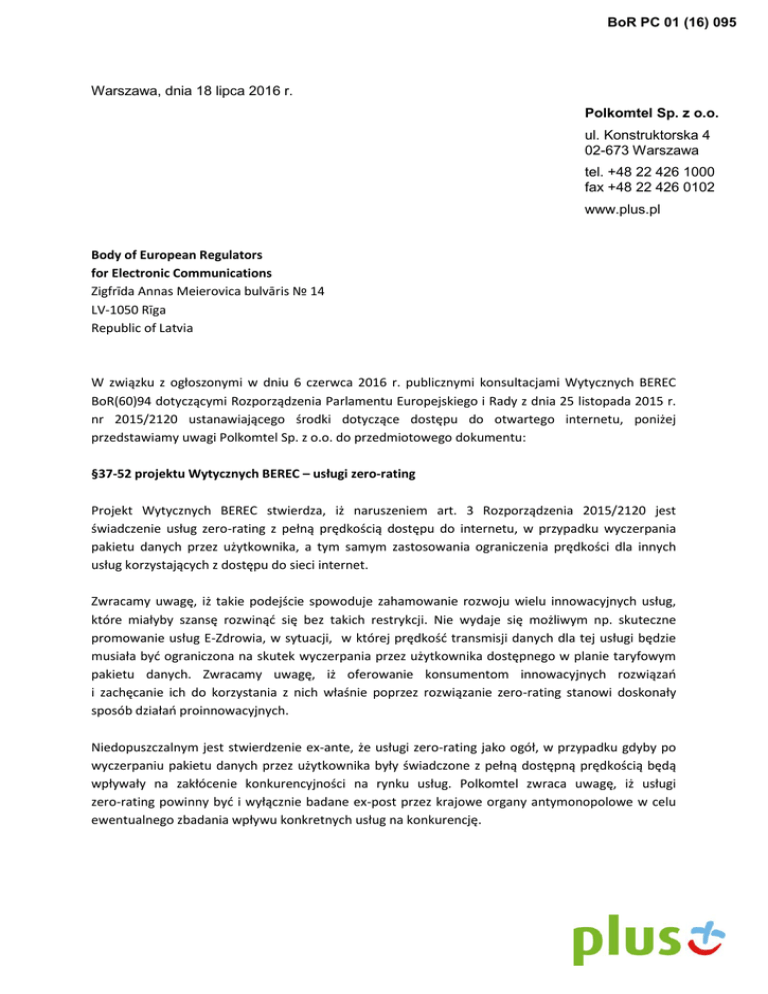 BoR PC 01 (16) 095 Warszawa, dnia 18 lipca 2016 r. Polkomtel Sp. z o.o. ul. Konstruktorska 4 02-673 Warszawa tel. +48 22 426 1000 fax +48 22 426 0102 www.plus.pl Body of European Regulators for Electronic Communications Zigfrīda Annas Meierovica bulvāris № 14 LV-1050 Rīga Republic of Latvia W związku z ogłoszonymi w dniu 6 czerwca 2016 r. publicznymi konsultacjami Wytycznych BEREC BoR(60)94 dotyczącymi Rozporządzenia Parlamentu Europejskiego i Rady z dnia 25 listopada 2015 r. nr 2015/2120 ustanawiającego środki dotyczące dostępu do otwartego internetu, poniżej przedstawiamy uwagi Polkomtel Sp. z o.o. do przedmiotowego dokumentu: §37-52 projektu Wytycznych BEREC – usługi zero-rating Projekt Wytycznych BEREC stwierdza, iż naruszeniem art. 3 Rozporządzenia 2015/2120 jest świadczenie usług zero-rating z pełną prędkością dostępu do internetu, w przypadku wyczerpania pakietu danych przez użytkownika, a tym samym zastosowania ograniczenia prędkości dla innych usług korzystających z dostępu do sieci internet. Zwracamy uwagę, iż takie podejście spowoduje zahamowanie rozwoju wielu innowacyjnych usług, które miałyby szansę rozwinąć się bez takich restrykcji. Nie wydaje się możliwym np. skuteczne promowanie usług E-Zdrowia, w sytuacji, w której prędkość transmisji danych dla tej usługi będzie musiała być ograniczona na skutek wyczerpania przez użytkownika dostępnego w planie taryfowym pakietu danych. Zwracamy uwagę, iż oferowanie konsumentom innowacyjnych rozwiązań i zachęcanie ich do korzystania z nich właśnie poprzez rozwiązanie zero-rating stanowi doskonały sposób działań proinnowacyjnych. Niedopuszczalnym jest stwierdzenie ex-ante, że usługi zero-rating jako ogół, w przypadku gdyby po wyczerpaniu pakietu danych przez użytkownika były świadczone z pełną dostępną prędkością będą wpływały na zakłócenie konkurencyjności na rynku usług. Polkomtel zwraca uwagę, iż usługi zero-rating powinny być i wyłącznie badane ex-post przez krajowe organy antymonopolowe w celu ewentualnego zbadania wpływu konkretnych usług na konkurencję. §124-155 projektu Wytycznych BEREC – obowiązki informacyjne Rozporządzenie 2015/2120 nakłada na operatorów szereg dodatkowych obowiązków informacyjnych względem klientów. Zgodnie z zapisami art 4 ust 1 Rozporządzenia 2015/2120, informacje należy przekazywać klientom w dokumentach umownych. Zwracamy uwagę, iż obowiązki informacyjne wobec klientów obecnie ciążące na polskich operatorach skutkują tym, że umowy zawierane z klientami mają często objętość nawet kilkudziesięciu stron. Wprowadzanie zgodnie projektem Wytycznych BEREC dodatkowego obowiązku ujęcia szeregu kolejnych informacji w umowie, które to informacje powinny zostać opisane wyczerpująco, zrozumiale i w sposób niezwykle szczegółowy, skutkować będzie dodatkowym istotnym zwiększeniem objętości umów podpisywanych z klientami. Takie działania, naszym zdaniem, spowodują odwrotny skutek – zamiast wskazania konsumentowi kluczowych i najistotniejszych dla niego elementów umowy, dostarczy mu się dziesiątki stron treści, z których to on sam będzie zmuszony odnaleźć istotne dla niego kwestie. Biorąc pod uwagę, iż już w chwili obecnej większość konsumentów nie jest w stanie ze zrozumieniem zapoznać się z całością zapisów umowy, a biorąc pod uwagę objętość umów należy domniemywać, iż znaczna część klientów nigdy nie przeczytała całości podpisanych umów o świadczenie usług telekomunikacyjnych, wprowadzanie do tychże dokumentów dodatkowych zapisów nie będzie skutkowało zwiększeniem świadomości klientów co do parametrów świadczonych im usług. Wytyczne BEREC do Rozporządzenia, powinny w opinii Spółki określać, iż realizacja obowiązków informacyjnych wynikających z art. 4 ust 1 Rozporządzenia 2015/2120 następuje poprzez podanie w umowie z klientem adresu strony internetowej operatora, na której tenże prezentuje szczegółowe informacje odpowiadające wymaganiom zapisanym art. 4 ust 1 Rozporządzenia 2015/2120. Rozwiązanie takie umożliwi zainteresowanym klientom zapoznanie się z informacjami odpowiadającymi zapisom art. 4 ust 1 Rozporządzenia 2015/2120. Zapis taki umożliwi natomiast operatorom aktualizowanie informacji dostępnych dla klientów, co nie byłoby możliwe w przypadku konieczności podania tychże informacji w umowie – klient otrzymywałby bowiem w takim przypadku informacje aktualne tylko na moment podpisywania umowy. §150-154 projektu Wytycznych BEREC – definicja prędkości dostępu do internetu Zwracamy uwagę, iż projekt Wytycznych BEREC w żaden sposób nie wyjaśnia jak należy rozumieć szacunkową maksymalną prędkość dostępu do sieci internet dla sieci mobilnych, jaką zgodnie z Rozporządzeniem 2015/2120 operatorzy powinni prezentować użytkownikom. Co więcej, proponowane zapisy Wytycznych BEREC wprowadzają dodatkową niepewność co do sposobu w jaki operator powinien wykonywać tenże obowiązek. W §150 projektu Wytycznych BEREC stwierdza, iż użytkownicy końcowi powinni być w stanie na podstawie uzyskanych informacji zrozumieć, jaka jest szacunkowa maksymalna prędkość dostępu do sieci internet w różnych lokalizacjach. Jednakże BEREC w projekcie wytycznych nie wyjaśnia, co to powinny być za lokalizacje, jak je określić, ile ich powinno być, etc.. Biorąc pod uwagę, iż Rozporządzenie 2015/2020 jasno określa, iż szacunkowa prędkość maksymalna powinna być zapisana w dokumentach umownych klienta, wprowadzanie dodatkowych niewiadomych w tym zakresie jest jak najbardziej niepożądane. Bezsprzecznym jest, iż stwierdzenie „osiągalna prędkość w warunkach rzeczywistych” stosowane przez BEREC w projekcie wytycznych jako próba definiowania prędkości maksymalnej jest całkowicie nieprzystające do specyfiki funkcjonowania sieci komórkowych. Prędkość jaką mo