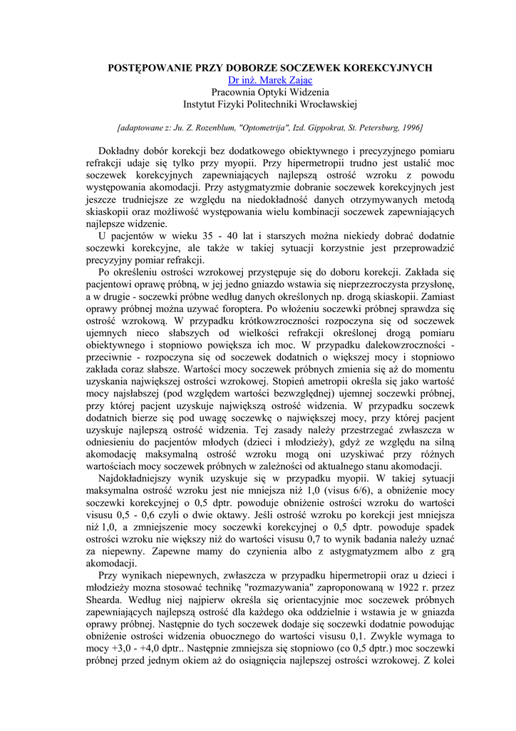 POSTĘPOWANIE PRZY DOBORZE SOCZEWEK KOREKCYJNYCH Dr inż. Marek Zając Pracownia Optyki Widzenia Instytut Fizyki Politechniki Wrocławskiej [adaptowane z: Ju. Z. Rozenblum, "Optometrija", Izd. Gippokrat, St. Petersburg, 1996] Dokładny dobór korekcji bez dodatkowego obiektywnego i precyzyjnego pomiaru refrakcji udaje się tylko przy myopii. Przy hipermetropii trudno jest ustalić moc soczewek korekcyjnych zapewniających najlepszą ostrość wzroku z powodu występowania akomodacji. Przy astygmatyzmie dobranie soczewek korekcyjnych jest jeszcze trudniejsze ze względu na niedokładność danych otrzymywanych metodą skiaskopii oraz możliwość występowania wielu kombinacji soczewek zapewniających najlepsze widzenie. U pacjentów w wieku 35 - 40 lat i starszych można niekiedy dobrać dodatnie soczewki korekcyjne, ale także w takiej sytuacji korzystnie jest przeprowadzić precyzyjny pomiar refrakcji. Po określeniu ostrości wzrokowej przystępuje się do doboru korekcji. Zakłada się pacjentowi oprawę próbną, w jej jedno gniazdo wstawia się nieprzezroczysta przysłonę, a w drugie - soczewki próbne według danych określonych np. drogą skiaskopii. Zamiast oprawy próbnej można uzywać foroptera. Po włożeniu soczewki próbnej sprawdza się ostrość wzrokową. W przypadku krótkowzroczności rozpoczyna się od soczewek ujemnych nieco słabszych od wielkości refrakcji określonej drogą pomiaru obiektywnego i stopniowo powiększa ich moc. W przypadku dalekowzroczności przeciwnie - rozpoczyna się od soczewek dodatnich o większej mocy i stopniowo zakłada coraz słabsze. Wartości mocy soczewek próbnych zmienia się aż do momentu uzyskania największej ostrości wzrokowej. Stopień ametropii określa się jako wartość mocy najsłabszej (pod względem wartości bezwzględnej) ujemnej soczewki próbnej, przy której pacjent uzyskuje największą ostrość widzenia. W przypadku soczewk dodatnich bierze się pod uwagę soczewkę o największej mocy, przy której pacjent uzyskuje najlepszą ostrość widzenia. Tej zasady należy przestrzegać zwłaszcza w odniesieniu do pacjentów młodych (dzieci i młodzieży), gdyż ze względu na silną akomodację maksymalną ostrość wzroku mogą oni uzyskiwać przy różnych wartościach mocy soczewek próbnych w zależności od aktualnego stanu akomodacji. Najdokładniejszy wynik uzyskuje się w przypadku myopii. W takiej sytuacji maksymalna ostrość wzroku jest nie mniejsza niż 1,0 (visus 6/6), a obniżenie mocy soczewki korekcyjnej o 0,5 dptr. powoduje obniżenie ostrości wzroku do wartości visusu 0,5 - 0,6 czyli o dwie oktawy. Jeśli ostrość wzroku po korekcji jest mniejsza niż 1,0, a zmniejszenie mocy soczewki korekcyjnej o 0,5 dptr. powoduje spadek ostrości wzroku nie większy niż do wartości visusu 0,7 to wynik badania należy uznać za niepewny. Zapewne mamy do czynienia albo z astygmatyzmem albo z grą akomodacji. Przy wynikach niepewnych, zwłaszcza w przypadku hipermetropii oraz u dzieci i młodzieży mozna stosować technikę "rozmazywania" zaproponowaną w 1922 r. przez Shearda. Według niej najpierw określa się orientacyjnie moc soczewek próbnych zapewniających najlepszą ostrość dla każdego oka oddzielnie i wstawia je w gniazda oprawy próbnej. Następnie do tych soczewek dodaje się soczewki dodatnie powodując obniżenie ostrości widzenia obuocznego do wartości visusu 0,1. Zwykle wymaga to mocy +3,0 - +4,0 dptr.. Następnie zmniejsza się stopniowo (co 0,5 dptr.) moc soczewki próbnej przed jednym okiem aż do osiągnięcia najlepszej ostrości wzrokowej. Z kolei przywraca się pierwotną moc soczewki próbnej przed tym okiem (łącznie z dodatkiem "rozmywającym") i stopniowo obniża moc soczewki próbnej przed drugim okiem aż do osiągnięcia maksymalnej ostrości wzrokowej. Za miarę refrakcji przyjmuje się te wartości mocy, przy których po raz pierwszy pacjent uzyskał największą ostrość widzenia. Jeśli opisana procedura nie pozwala na określenie wartości mocy soczewek próbnych z wystarczającą pewnością to należy przeprowadzić korekcję przy wyłączonej (porażonej) akomodacji (w warunkach cycloplegii) W razie wykrycia astygmatyzmu należy przeprowadzićć dodatkowe badania pozwalające określić jego wielkość oraz kierunki osi astygmatycznych oka. Dla podwyższenia precyzji określenia korekcji można wykonać dodatkowe badania uzywając refraktometru badź autorefraktometru lub/i oftalmoskopu oraz metodą skiaskopii szczelinowej. Do wyłączenia akomodacji stosuje się medykamenty paraliżujace mięśnie rzęskowe, zwykle w postaci kropli. Najpełniejsze sparaliżowanie akomodacji uzyskać można stosując roztworu atropiny (dzieci do 1 r.z. - roztwór 0,1%, dzieci w wieku od 1 do 2 lat - roztwór 0,3%, dzieci w wieku 3 - 7 lat - roztwór 0,5%, dzieci starsze niż 8 lat i dorośli - roztwór 1%) po jednej kropli dziennie rano i wieczorem przez trzy dni oraz rano 4. dnia. W 1 - 2 godziny po ostatnim zakropleniu przeprowadza się skiaskopię. Jesli wyniki są niepewne a także przy podejrzeniu o spastyczną akomodację można przedłużyć zakraplanie atropiną do 7 - 10 dni. W większości przypadków trzydniowa atropinizacja powoduje wystarczajace wyłączenie akomodacji. Taką procedurę stosuje się standardowo przy pierwszym badaniu refrakcji u dzieci i młodzieży a także we wszystkich przypadkach wątpliwych, skomplikowanych i niejasnych np. przy zbyt szybkim narastaniu presbyopii, przy podejrzeniu pseudomiopii, przy trudnościach w określeniu wartości refrakcji a także w sytuacjach gdy wymagana jest szczególna dokładność pomiaru. Wadą tak przeprowadzanej cycloplegii jest utrzymujące się do 2. tygodni działanie atropiny, co może znacznie utrudnić normalną aktywność życiową: pracę, czytanie i pisanie, patrzenie na bliskie odległości. Przez pierwsze 2 - 3 dni w ogóle nie można czytać ani pisać. Jeśli podczas zakraplania atropiny pojawią si