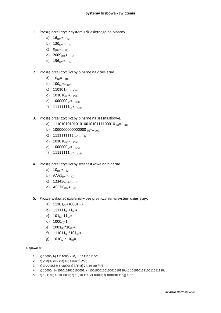 Systemy liczbowe - ćwiczenia 1. Proszę przeliczyd z systemu dziesiętnego na binarny. a) 16(10)=... (2) b) 120(10)=... (2) c) 0(10)=... (2) d) 2009(10)=... (2) e) 156(10)=... (2) 2. Proszę przeliczyd liczby binarne na dziesiętne. a) 10(2)=.. (10) b) 100(2)=.. (10) c) 110101(2)=.. (10) d) 101010(2)=.. (10) e) 1000000(2)=.. (10) f) 11111111(2)=.. (10) 3. Proszę przeliczyd liczby binarne na szesnastkowe. a) 111010101010101001010111100010 (2)=.. (16) b) 1000000000000000 (2)=.. (16) c) 1111111111(2)=.. (16) d) 101010(2)=.. (16) e) 1000000(2)=.. (16) f) 11111111(2)=.. (16) 4. Proszę przeliczyd liczby szesnastkowe na binarne. a) 10(16)=.. (2) b) AAA1(16)=.. (2) c) 123456(16)=.. (2) d) ABCDE(16)=.. (2) 5. Proszę wykonad działania – bez przeliczania na system dziesiętny. a) 11101(2)+10001(2)=... b) 111111(2)+1(2)=... c) 101(2)-11(2)=... d) 1000(2)-1(2)=... e) 1001(2)*10(2)=... f) 111011(2)*101(2)=... g) 1010(2) 10(2)=... Odpowiedzi: 1. 2. 3. 4. 5. a) 10000; b) 1111000; c) 0; d) 11111011001; a) 2; b) 4; c) 53; d) 42; e) 64; f) 255; a) 3AAA95E2; b) 8000; c) 3FF; d) 2A; e) 40; f) FF; a) 10000; b) 1010101010100001; c) 100100011010001010110; d) 10101011110011011110; a) 101110; b) 1000000; c) 10; d) 111; e) 10010; f) 100100111; g) 101; dr Artur Bartoszewski