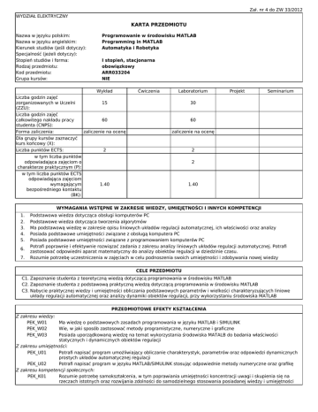 Zał. nr 4 do ZW 33/2012 WYDZIAŁ ELEKTRYCZNY KARTA PRZEDMIOTU Nazwa w języku polskim: Nazwa w języku angielskim: Kierunek studiów (jeśli dotyczy): Specjalność (jeżeli dotyczy): Stopień studiów i forma: Rodzaj przedmiotu: Kod przedmiotu: Grupa kursów: Programowanie w środowisku MATLAB Programming in MATLAB Automatyka i Robotyka I stopień, stacjonarna obowiązkowy ARR033204 NIE Wykład Liczba godzin zajęć zorganizowanych w Uczelni 15 (ZZU): Liczba godzin zajęć całkowitego nakładu pracy 60 studenta (CNPS): Forma zaliczenia: zaliczenie na ocenę Dla grupy kursów zaznaczyć kurs końcowy (X): Liczba punktów ECTS: 2 w tym liczba punktów odpowiadająca zajęciom o charakterze praktycznym (P): w tym liczba punktów ECTS odpowiadająca zajęciom wymagającym 1.40 bezpośredniego kontaktu (BK): Ćwiczenia Laboratorium Projekt Seminarium 30 60 zaliczenie na ocenę 2 2 1.40 WYMAGANIA WSTĘPNE W ZAKRESIE WIEDZY, UMIEJĘTNOŚCI I INNYCH KOMPETENCJI 1. 2. 3. 4. 5. 6. 7. Podstawowa wiedza dotycząca obsługi komputerów PC Podstawowe wiedza dotycząca tworzenia algorytmów Ma podstawową wiedzę w zakresie opisu liniowych układów regulacji automatycznej, ich właściwości oraz analizy Posiada podstawowe umiejętności związane z obsługą komputera PC Posiada podstawowe umiejętności związane z programowaniem komputerów PC Potrafi poprawnie i efektywnie rozwiązać zadania z zakresu analizy liniowych układów regulacji automatycznej. Potrafi zastosować odpowiedni aparat matematyczny do analizy obiektów regulacji w dziedzinie czasu. Rozumie potrzebę uczestniczenia w zajęciach w celu podnoszenia swoich umiejętności i zdobywania nowej wiedzy CELE PRZEDMIOTU C1. Zapoznanie studenta z teoretyczną wiedzą dotyczącą programowania w środowisku MATLAB C2. Zapoznanie studenta z podstawową praktyczną wiedzą dotyczącą programowania w środowisku MATLAB C3. Nabycie praktycznej wiedzy i umiejętności obliczania podstawowych parametrów i wielkości charakteryzujących liniowe układy regulacji automatycznej oraz analizy dynamiki obiektów regulacji, przy wykorzystaniu środowiska MATLAB PRZEDMIOTOWE EFEKTY KSZTAŁCENIA Z zakresu wiedzy: PEK_W01 Ma wiedzę o podstawowych zasadach programowania w języku MATLAB i SIMULINK PEK_W02 Wie, w jaki sposób zastosować metody programistyczne, numeryczne i graficzne PEK_W03 Posiada uporządkowaną wiedzę na temat wykorzystania środowiska MATALB do badania właściwości statycznych i dynamicznych obiektów regulacji Z zakresu umiejętności: PEK_U01 Potrafi napisać program umożliwiający obliczanie charakterystyk, parametrów oraz odpowiedzi dynamicznych prostych układów automatycznej regulacji PEK_U02 Potrafi napisać program w języku MATLAB/SIMULINK stosując odpowiednie metody numeryczne oraz grafikę Z zakresu kompetencji społecznych: PEK_K01 Rozumie potrzebę samokształcenia, w tym poprawiania umiejętności koncentracji uwagi i skupienia się na rzeczach istotnych oraz rozwijania zdolności do samodzielnego stosowania posiadanej wiedzy i umiejętności TREŚCI PROGRAMOWE Wy1 Wy2 Wy3 Wy4 Wy5 Wy6 Wy7 Wy8 La1 La2 La3 La4 La5 La6 La7 La8 La9 La10 La11 La12 La13 La14 La15 Forma zajęć - wykład Wprowadzenie do języka MATLAB, polecenia w oknie Matlaba, obliczanie wartości wyrażeń arytmetycznych i algebraicznych, typy danych Tworzenie własnych funkcji, grafika, obliczenia macierzowe i wektorowe, liczby zespolone, instrukcje strukturalne Analiza i synteza układów regulacji automatycznej przy wykorzystaniu narzędzi MATLABa (transmitancje, odpowiedzi skokowe i impulsowe, stabilność układów, charakterystyki częstotliwościowe, obserwowalność i sterowalność, przebiegi czasowe w układach dynamicznych) Rozwiązywanie równań różniczkowych zwyczajnych. Różniczkowanie i całkowanie numeryczne. Wykorzystanie Matlaba przy opracowywaniu wyników pomiarów Zastosowanie języka SIMULINK do projektowania prostych układów sterowania (modelowanie obwodów elektrycznych) Zastosowanie języka SIMULINK do projektowania zamkniętych układów sterowania (modelowanie układów elektromechanicznych) Zastosowanie środowiska MATLAB-SIMULINK do komputerowo wspomaganego projektowania układów regulacji oraz systemów z procesorami sygnałowymi. Zaliczenie suma godzin: liczba godzin: Forma zajęć - laboratorium Zapoznanie się z podstawowymi poleceniami MATLABA i zasadami pisania programów Rachunek macierzowy - podstawowe operacje na macierzach i wektorach Obsługa i programowanie grafiki w MATLABIE Rozwiązywanie układów równań liniowych Rozwiązywanie zadań interpolacji i aproksymacji Zastosowanie MATLABA do rozwiązywania równań różniczkowych zwyczajnych Całkowanie i różniczkowanie numeryczne w środowisku MATLAB Zastosowanie MATLABA do analizy i syntezy liniowych układów sterowania w dziedzinie czasu i częstotliwości Wprowadzenie do Simulinka. Generowanie przebiegów. Wykreślanie odpowiedzi układów opisanych transmitancjami na zadane wymuszenia Badanie właściwości regulatorów liniowych P, PI ,PID. Wybrane kryteria doboru nastaw regulatorów i ich wpływ na przebieg odpowiedzi na zadane wymuszenia Modelowanie prostych układów regulacji automatycznej Modelowanie nieliniowych układów regulacji Modelowanie silnika prądu stałego SPS na podstawie równań i transmitancji Badanie dynamiki układu regulacji automatycznej prędkości SPS Zaliczenie suma godzin: liczba godzin: 2 2 2 2 2 2 2 2 2 2 2 2 2 2 1 15 STOSOWANE NARZĘDZIA DYDAKTYCZNE N1. N2. N3. N4. N5. N6. Wykład multimedialny z elementami wykładu tradycyjnego i problemowego Praca własna – samodzielne studia i przygotowanie do egzaminu Konsultacje Praca własna – przygotowanie do ćwiczeń laboratoryjnych Sprawdzanie wiedzy za pomocą krótkich sprawdzianów Ćwiczenia laboratoryjne – dyskusja otrzymanych wyników zawartych w sprawozdaniach OCENA OSIĄGNIĘCIA PRZEDMIOTOWYCH EFEKTÓW KSZTAŁCENIA Oceny Numer efektu kształcenia F - 