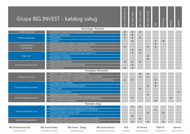finansowanie zarządzanie Inżynieria lądowa i przemysłowa obiekty przemysłowo-usługowe - projektowanie i nadzór x usługi pośrednictwa nieruchomości inwestycyjnych rozwój projektów komercyjnych - hotele, apartamenty outsourcing remontów i budowy (rurociągi, instalacje, itp..) Ropa i gaz x projekt Hotelu Water Discus outsourcing produkcji przemysłu morskiego inżynieria morska Energetyka Odnawialna x x x x x x x x x kolektory - rozwój projektów i usługi inżynieryjne Energetyka słoneczna panele fotowoltaiczne (PV) - rozwój projektów i usługi inżynieryjne zakup / sprzedaż projektów kolektorów/paneli słonecznych do produkcji energii x x x x usługi inżynieryjne dla wdrażanego projektu x pomiary wiatru rozwój własnych projektów zagadnienia inżynieryjno-techniczne Morska energetyka wiatrowa x x x Pozostałe usługi x Ochrona środowiska i inne x analizy i raporty rynkowe Lokalne przedstawicielstwo x badania środowiskowe i ocena oddziaływania na środowisko zarządzanie spółkami celowymi (SPV) wyspecializowani polscy inwestorzy i producenci w Abu Dhabi x wyspecializowani zagraniczni inwestorzy i producenci w Polsce x x Sevivon x x x sprawy formalne i środowiskowe obudowywanie rafy koralowej i tworzenie sztucznych raf x x x x x rozwój i projektowanie podmorskich sieci elektroenergetycznych x x x Due diligence dot. projektów Lądowa energetyka wiatrowa PSM SA x x x x x BT Service x automatyka przemysłowa teletransmisja i monitoring Przemysł morski/stoczniowy x x x x AOS Projekty inwestycyjne x x x BIG Invest Service wyszukiwanie i dostarczanie innowacyjnych technologii tworzenie i pośrednictwo BIG Invest - Dubaj Transfer technologii BIG Invest Polska Technologia i Przemysł BIG InvestConsult AG Grupa BIG INVEST - katalog usług x x x x BIG InvestConsult AG BIG Invest Polska BIG Invest - Dubaj BIG Invest Service AOS BT Service PSM SA Sevivon www.biginvest.ch www.biginvest.com.pl www.biginvest.ae www.biginvest-service.pl www.aos.pl www.btservice.pl www.psmsa.pl www.sevivon.pl