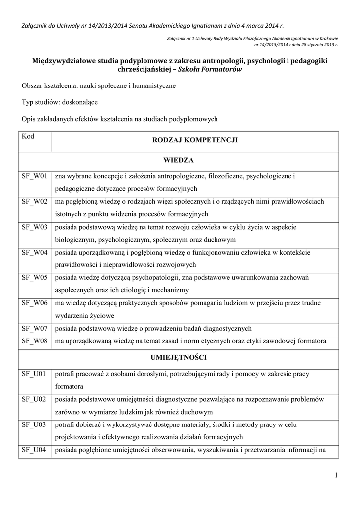 Załącznik do Uchwały nr 14/2013/2014 Senatu Akademickiego Ignatianum z dnia 4 marca 2014 r. Załącznik nr 1 Uchwały Rady Wydziału Filozoficznego Akademii Ignatianum w Krakowie nr 14/2013/2014 z dnia 28 stycznia 2013 r. Międzywydziałowe studia podyplomowe z zakresu antropologii, psychologii i pedagogiki chrześcijańskiej – Szkoła Formatorów Obszar kształcenia: nauki społeczne i humanistyczne Typ studiów: doskonalące Opis zakładanych efektów kształcenia na studiach podyplomowych Kod RODZAJ KOMPETENCJI WIEDZA SF_W01 zna wybrane koncepcje i założenia antropologiczne, filozoficzne, psychologiczne i pedagogiczne dotyczące procesów formacyjnych SF_W02 ma pogłębioną wiedzę o rodzajach więzi społecznych i o rządzących nimi prawidłowościach istotnych z punktu widzenia procesów formacyjnych SF_W03 posiada podstawową wiedzę na temat rozwoju człowieka w cyklu życia w aspekcie biologicznym, psychologicznym, społecznym oraz duchowym SF_W04 posiada uporządkowaną i pogłębioną wiedzę o funkcjonowaniu człowieka w kontekście prawidłowości i nieprawidłowości rozwojowych SF_W05 posiada wiedzę dotyczącą psychopatologii, zna podstawowe uwarunkowania zachowań aspołecznych oraz ich etiologię i mechanizmy SF_W06 ma wiedzę dotyczącą praktycznych sposobów pomagania ludziom w przejściu przez trudne wydarzenia życiowe SF_W07 posiada podstawową wiedzę o prowadzeniu badań diagnostycznych SF_W08 ma uporządkowaną wiedzę na temat zasad i norm etycznych oraz etyki zawodowej formatora UMIEJĘTNOŚCI SF_U01 potrafi pracować z osobami dorosłymi, potrzebującymi rady i pomocy w zakresie pracy formatora SF_U02 posiada podstawowe umiejętności diagnostyczne pozwalające na rozpoznawanie problemów zarówno w wymiarze ludzkim jak również duchowym SF_U03 potrafi dobierać i wykorzystywać dostępne materiały, środki i metody pracy w celu projektowania i efektywnego realizowania działań formacyjnych SF_U04 posiada pogłębione umiejętności obserwowania, wyszukiwania i przetwarzania informacji na 1 temat zjawisk społecznych SF_U05 potrafi samodzielnie pogłębiać wiedzę i rozwijać swoje profesjonalne umiejętności, korzystając z różnych źródeł SF_U06 umie rozpoznawać i identyfikować swoje reakcje, aby skutecznie wspierać tych, z którymi pracuje nad ich problemami emocjonalnymi i duchowymi SF_U07 opracowuje i interpretuje wyniki badań, wyciąga wnioski, wskazuje kierunki dalszych oddziaływań formacyjnych SF_U08 potrafi pracować w zespole, pełnić różne role, umie przyjmować i wyznaczać zadania SF_U09 ma elementarne umiejętności organizacyjne pozwalające na realizację celów związanych z projektowaniem i podejmowaniem profesjonalnych działań formacyjnych SF_U10 potrafi dokonać analizy własnych działań i motywacji oraz wskazać ewentualne obszary wymagające ich modyfikacji SF_U11 potrafi wykorzystywać informacje i postawy w celu zrozumienia innych, aby skutecznie zająć się problemami ludzi potrzebujących wsparcia SF_U12 ma pogłębione umiejętności obserwowania, diagnozowania i racjonalnego oceniania złożonych sytuacji problemowych oraz analizowania motywów i wzorów ludzkich zachowań SF_U13 posiada umiejętność dostrzegania i identyfikowania problemów w środowisku rodzinnym, a także podejmowania działań profilaktycznych i naprawczych KOMPETENCJE SPOŁECZNE SF_K01 ma świadomość poziomu swojej wiedzy i umiejętności, rozumie potrzebę ciągłego rozwoju osobistego i dokształcania się zawodowego SF_K02 dokonuje autoanalizy i samooceny własnych kompetencji oraz doskonali umiejętności, wyznaczając kierunki własnego rozwoju i formacji SF_K03 ma świadomość konieczności prowadzenia indywidualnej i grupowej formacji SF_K04 potrafi prawidłowo komunikować się i tworzyć dobre relacje z osobami, grupami i środowiskami potrzebującymi rady i wsparcia SF_K05 ma świadomość zachowywania się w sposób profesjonalny i etyczny w praktyce stosuje zasady profesjonalnego i etycznego zachowania się formatora SF_K06 jest wrażliwy na problemy współczesnego człowieka i odpowiedzialny za podejmowane działań w procesie formacji oraz jest świadomy roli jaką w nim pełni SF_K07 wykazuje gotowość do towarzyszenia innym w braniu pełniejszej odpowiedzialności za samych siebie, a posiadając kompetencje w rozwiązywaniu problemów człowieka, poszukuje sposobów ich rozwiązania szanujących godność, intymność i podmiotowość osoby 2