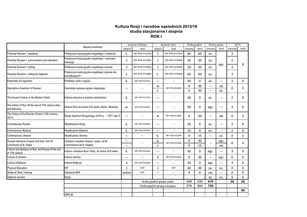 Kultura Rosji i narodów sąsiednich 2015/16 studia stacjonarne I stopnia ROK I Nazwa przedmiotu semestr zimowy zajęcia kod semestr letni zajęcia kod liczba godzin zimowy letni forma oceny zimowy letni ECTS zimowy letni Practical Russian I: speaking Praktyczna nauka języka rosyjskiego I: mówienie ć. WF.IFW-H101Da ć WF.IFW-H101Db 60 60 oc. Practical Russian I: pronunciation and intonation Praktyczna nauka języka rosyjskiego I: wymowa i intonacja ć WF.IFW-H102Da ć WF.IFW-H102Db 30 30 oc. Practical Russian I: writing Praktyczna nauka języka rosyjskiego I:pisanie ć WF.IFW-H103Da ć WF.IFW-H103Db 30 30 oc. Practical Russian I: writing for beginers Praktyczna nauka języka rosyjskiego I:pisanie dla początkujących ć. WF.IFW-H104Da ć. WF.IFW-H104Db 60 60 oc. Essentials of Linguistics Podstawy nauki o języku k. WF.IFW-H115Da --- --- --- 0 30 30 oc. ----- --zal. oc. 0 Gramatyka opisowa języka rosyjskiego 30 0 0 2 Descriptive Grammar of Russian --w ć. 0 5 The Ancient Culture in the Modern World Kultura antyczna w świecie nowożytnym k. WF.IFW-H117Da --- --- 30 0 oc. --- 2 0 The history of Rus’ till the end of 17th century (Kiev and Moscow) Historia Rusi do końca XVII wieku (Kijów i Moskwa) w. WF.IFW-H118Da --- --- 30 0 egz. --- 3 0 The history of the Russian Empire (18th century – 1917) Dzieje Imperium Rosyjskiego (XVIII w. – 1917 roku I) --- --- w WF.IFW-H119Db 0 30 --- zal. 0 2 Contemporary Russia Współczesna Rosja k. WF.IFW-H120Da --- --- 30 0 oc. --- 2 0 Contemporary Belarus Współczesna Białoruś --k. --- Współczesna Ukraina k. --- WF.IFW-H121Da Contemporary Ukraine WF.IFW-H122Db 15 0 0 15 oc. --- --oc. 2 0 0 2 Russian literature of place and time; from M. Lomonosov to N. Gogol Literatura rosyjska miejsca i czasu; od M. Łomonosowa do N. Gogola ----- --- w. ć. WF.IFW-H123Db 0 0 30 15 --- egz. zal. 0 4 Kultura i literatura Rusi i Rosji do końca XVII wieku k. WF.IFW-H124Da --- --- 30 0 egz. --- 3 0 Kultura Ukrainy --- --- k WF.IFW-H125Db 0 30 --- egz. 0 3 Culture of Belarus Kultura Białorusi k WF.IFW-H126Da --- --- 30 0 egz. --- 3 0 Physical Education WF Szkolenie BHP ć --- SWF Safety at Work Training ć online SWF 30 4 30 0 Optional courses Opcje oc. --oc. 349 379 330 360 oc. zal. oc. 679 739 0 0 5 30 0 0 6 30 Culture and literature of Rus’ and Russia till the end of 17th century Culture of Ukraine --- BHP WF.IFW-H116Db --- liczba godzin grupa zaaw. liczba godzin grupa niezaaw. 3 2 egz. 3 8 3 60 OPCJE Kultura Rosji i narodów sąsiednich 2016/17 studia stacjonarne I stopnia ROK II Nazwa przedmiotu semestr zimowy zajęcia kod semestr letni zajęcia kod liczba godzin zimowy letni forma oceny zimowy letni Praktyczna nauka języka rosyjskiego I: mówieni ć. WF.IFW-H201Da ć. WF.IFW-H201Db 60 60 oc. Praktyczna nauka języka rosyjskiego I: pisanie Formowanie jęz. rosyjskiego na tle historycznokulturowym Gramatyka opisowa języka rosyjskiego ć. WF.IFW-H202Da ć. WF.IFW-H202Db 60 60 oc. egz. ECTS zimowy letni 2 6 2 --- k. 0 30 --- oc. 0 2 Język staro-cerkiewno-słowiański k. k. ----- 30 30 0 0 egz. oc. ----- 3 2 0 0 Dzieje Imperium Rosyjskiego (XVIII w. – 1917 roku II.) w. --- 30 0 egz. --- 3 0 Historia Imperium Rosyjskiego i ZSRR w. --k. --- 0 30 0 30 30 0 30 0 --oc. --oc. egz. Historia Białorusi --w. --k. oc. --- 0 2 0 2 3 0 2 0 Proseminarium - Kultura Rusi, Imperium Rosyjskiego i ZSRR w zwierciadle współczesności k. k. 15 15 zal. zal. 2 2 w. ć. w. --- 30 15 30 0 oc. oc. egz. --- 2 2 2 0 w. ć. ć. w. w. ć. ć. --- 30 15 60 6 30 15 60 0 zal. oc. oc. zal. egz. zal. egz. --- 3 3 441 360 801 4 1 3 33 0 4 0 3 27 60 Historia filozofii Historia Ukrainy Kultura Imperium Rosyjskiego 1842-1917 Nowe narzędzia filologa XX i XXI wieku Literatura rosyjska miejsca i czasu; od I. Turgieniewa do M. Gorkiego Lektorat języka zachodniego Ochrona własności intelektualnej WF-OWI --- Opcje Kultura Rosji i narodów sąsiednich 2017/18 studia stacjonarne I stopnia ROK III Nazwa przedmiotu Praktyczna nauka języka rosyjskiego I: mówieni semestr zimowy zajęcia kod Język rosyjski w biznesie ć. ć. ć. Podstawy gramatyki historycznej języka rosyjskiego k. Rosyjski językowy obraz świata k. Praktyczna nauka języka rosyjskiego I: pisanie Historia Rosji po 1991 roku Kultura rosyjska po 1917 roku Dzieje kina rosyjskiego Literatura rosyjska miejsca i czasu; od A. Błoka do B. Pasternaka Literatura Rosyjska od I. Erenburga do J. Brodskiego Seminarium licencjackie literaturoznawcze Seminarium licencjackie kulturoznawcze Lektorat drugiego jęz. wschodniosłowiańskiego w. w. ć. w. ć. ----sem. sem. ć. semestr letni zajęcia kod ć. ć. ć. w. w. --------w. ć. sem. sem. ć. ----- liczba godzin zimowy letni forma oceny zimowy letni ECTS zimowy letni 30 60 30 60 30 30 oc. oc. oc. egz. oc. 2 2 2 30 0 oc. --- 2 0 30 0 30 15 15 30 15 0 0 30 30 60 0 30 30 0 0 0 0 30 15 30 30 60 oc. --oc. egz. zal. egz. zal. ----zal. zal. oc. --egz oc. --------egz zal. zal. zal. egz. 2 0 2 0 3 2 2 0 3 0 3 0 12 12 3 375 315 8 8 3 3 34 Opcje 4 2 26 60