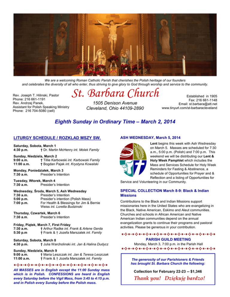 We are a welcoming Roman Catholic Parish that cherishes the Polish heritage of our founders and celebrates the diversity of all who enter, thus striving to give glory to God through worship and service to the community. Rev. Joseph T. Hilinski, Pastor Phone: 216 661-1191 Rev. Andrzej Panek, Assistant for Polish Speaking Ministry Phone: 216 704-5080 (cell) St. Barbara Church 1505 Denison Avenue Cleveland, Ohio 44109-2890 Established in 1905 Fax: 216 661-1148 Email: [email protected] www.tinyurl.com/st-barbaracleveland Eighth Sunday in Ordinary Time – March 2, 2014 LITURGY SCHEDULE / ROZKLAD MSZY SW. Saturday, Sobota, March 1 4:30 p.m. † Dr. Martin McHenry int. Molek Family Sunday, Niedziela, March 2 9:00 a.m. † Tillie Karbowski int. Karbowski Family 11:00 a.m. † Bogdan Pajak int. Krystyna Kowalski Monday, Poniedziałek, March 3 7:30 a.m. Presider’s Intention Tuesday, Wtorek, March 4 7:30 a.m. Presider’s Intention Wednesday, Środa, March 5, Ash Wednesday 7:30 a.m. Presider’s Intention 5:00 p.m. Presider’s intention (Polish Mass) 7:00 p.m. For Health & Blessings for Jim & Bernie Weiss int. Loretta Budzinski Thursday, Czwartek, March 6 7:30 a.m. Presider’s Intention Friday, Piątek, March 7, First Friday 7:30 a.m. † Arthur Radke int. Frank & Arlene Gerda 5:30 p.m † Frank & † Jozefa Marszalek int. Family Saturday, Sobota, March 8 4:30 p.m. † Julia Warcholinski int. Jan & Halina Dudycz Sunday, Niedziela, March 9 9:00 a.m. † Maria Leszczak int. Jan & Teresa Leszczak 11:00 a.m. † Frank & † Jozefa Marszalek int. Family All MASSES are in English except the 11:00 Sunday mass which is in Polish. CONFESSIONS are heard in English every Saturday before the Vigil Mass, from 3:45 to 4:15 p.m. and in Polish every Sunday before the Polish mass. ASH WEDNESDAY, March 5, 2014 Lent begins this week with Ash Wednesday on March 5. Masses are scheduled for 7:30 a.m., 5:00 p.m. (Polish) and 7:00 p.m. This weekend we will be distributing our Lent & Holy Week Pamphlet which includes the Mass and Services Schedule for Holy Week Reminders for Fasting & Abstinence, a schedule of Opportunities for Prayer and & Reflection and a listing of Opportunities for Service and Volunteering in our Community. SPECIAL COLLECTION March 8-9: Black & Indian Missions Contributions to the Black and Indian Missions support missionaries here in the United States who are evangelizing in the Black, Native American, Eskimo and Aleut communities. Churches and schools in African American and Native American Indian communities depend on the annual evangelization grants to continue their programs and pastoral activities. Please be generous in your contribution. PARISH GUILD MEETING Monday, March 3, 7:00 p.m. in the Parish Hall The generosity of our Parishioners & Friends has brought St. Barbara Church the following: Collection for February 22-23 -- $1,346 Thank you! Dziękuję bardzo! Prayer List Please pray for our parishioners who are ill and all who are in need of our prayers: Phyllis Bobko, Donna Cuevas, Donald Friedl, Irene Heruminek, Joseph A. Hilinski, Andrew Mura, Dorothy Noga, Ted Sliwa, Doris Wojton, Dora Wotowiec, Jeanette Woznicki This Week’s Quote from BLESSED JOHN PAUL II As the family goes, so goes the nation and so goes the whole world in which we live. from:catholicfire.blogspot.com OD KS. ANDRZEJA … SAVE THE DATE: Saturday, March 22, 5-8 p.m Parish ”Nie bojcie sie zostac swietymi…" - Bl. Jan Pawel II Zycie i dzialalnosc – ciag dalszy 13 marca 1976 – Kard.Wojtyla glosi rekolekcje dla papieza Pawla VI I Kurii Rzymskiej More information coming soon Share Your Blessings Our Partnership with Brookside Center We received a thank you letter from Brookside Center acknowledging our contribution of approximately $400 worth of grocery items for the month of January. This helped Brookside to give 894 low-income families food assistance. They also distributed 70 blankets, 8 new coats and numerous mittens, scarves, hats and gloves generously donated by various churches and groups. The outreach staff provided resource referrals and support to over 200 individuals. Together we DO make a difference! Donations for Lia House We are also contributing to the Lia House Winter Wish List during the months of February and March. They are requesting new or gently worn winter gloves, jackets, hats, scarfs and men's clothing along with men's toiletries. Please put your donations in the bin marked Lia House. Service Opportunities for Lent and Beyond Please see our Lent & Holy Week 2014 Pamphlet for more opportunities for service. Although the service opportunities are highlighted for this Lenten season, they may also inspire parishioners to volunteer at other times of the year as well. If you have any questions regarding the service opportunities listed please call Sharon Kazimore at 440-886-6052 for more information. REMINDER: LITURGICAL MINISTRY SCHEDULES All Altar Servers, Readers, Eucharistic Ministers, and Ushers/Greeters are reminded to pick up their service schedule for March 2014. They are located by the statue of the Blessed Virgin Mary near the door to the sacristy. Please remember to make arrangements for a substitute if you are not able to serve for your scheduled date and time. There is always a need for men and women to assist at Mass. If you are interested, please contact Joyce Gibson at 216 749-6598. 11 wrzesnia 1976 - udaje sie do USA na Miedzynarodowy Kongres Eucharystyczny 15 maja 1977 – Kard.Wojtyla konsekruje Kosciol Arka Pana w Nowej Hucie 25 maja 1978 – Kard.Wojtyla broni podstawowych praw czlowieka w obecnosci 60 tys.wiernych podczas procesji Bozego Ciala w Krakowie 2 pazdziernika 1978 – Karol Wojtyla pisze swoj ostatni wiersz p. t. Stanislaw 14 pazdziernika 1978 - rozpoczyna sie Konklawe 16 pazdziernika 1978 - PO RAZ PIERWSZY OD 1522 R. PAPIEZEM ZOSTAJE NIE WLOCH ALE KAROL WOJTYLA POLAK, PRZYBIERA IMIE JAN PAWEL II 22 pazdziernika 1978 – rozpoczyna swoj pontyfikat.Mowi-“Nie bojc