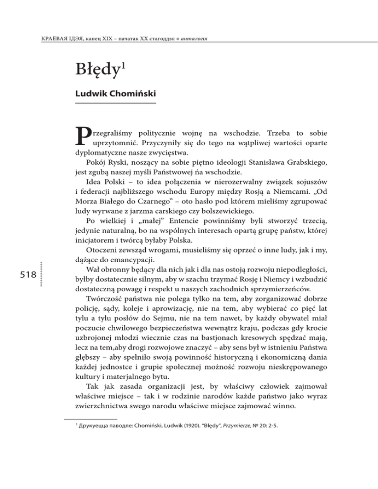 КРАЁВАЯ ІДЭЯ, канец ХІХ – пачатак ХХ стагоддзя анталогія Błędy1 Ludwik Chomiński P 518 rzegraliśmy politycznie wojnę na wschodzie. Trzeba to sobie uprzytomnić. Przyczyniły się do tego na wątpliwej wartości oparte dyplomatyczne nasze zwycięstwa. Pokój Ryski, noszący na sobie piętno ideologji Stanisława Grabskiego, jest zgubą naszej myśli Państwowej ńa wschodzie. Idea Polski – to idea połączenia w nierozerwalny związek sojuszów i federacji najbliższego wschodu Europy między Rosją a Niemcami. „Od Morza Białego do Czarnego” – oto hasło pod którem mieliśmy zgrupować ludy wyrwane z jarzma carskiego czy bolszewickiego. Po wielkiej i „małej” Entencie powinniśmy byli stworzyć trzecią, jedynie naturalną, bo na wspólnych interesach opartą grupę państw, której inicjatorem i twórcą byłaby Polska. Otoczeni zewsząd wrogami, musieliśmy się oprzeć o inne ludy, jak i my, dążące do emancypacji. Wał obronny będący dla nich jak i dla nas ostoją rozwoju niepodległości, byłby dostatecznie silnym, aby w szachu trzymać Rosję i Niemcy i wzbudzić dostateczną powagę i respekt u naszych zachodnich sprzymierzeńców. Twórczość państwa nie polega tylko na tem, aby zorganizować dobrze policję, sądy, koleje i aprowizację, nie na tem, aby wybierać co pięć lat tylu a tylu posłów do Sejmu, nie na tem nawet, by każdy obywatel miał poczucie chwilowego bezpieczeństwa wewnątrz kraju, podczas gdy krocie uzbrojonej młodzi wiecznie czas na bastjonach kresowych spędzać mają, lecz na tem,aby drogi rozwojowe znaczyć – aby sens był w istnieniu Państwa głębszy – aby spełniło swoją powinność historyczną i ekonomiczną dania każdej jednostce i grupie społecznej możność rozwoju nieskrępowanego kultury i materjalnego bytu. Tak jak zasada organizacji jest, by właściwy człowiek zajmował właściwe miejsce – tak i w rodzinie narodów każde państwo jako wyraz zwierzchnictwa swego narodu właściwe miejsce zajmować winno. 1 Друкуецца паводле: Chomiński, Ludwik (1920). “Błędy”, Przymierze, № 20: 2-5. Podtrzymywanie bytu za pomocą pięści, jest równie złudne, jak złudnymi są czczy sentymentalizm lub donkichoterja w polityce. Moc pięści może pęknąć, jak to widzieliśmy na przykładzie monarchji rozbiorowych, a także latem tego roku. Motorem przewodnim musi być idea. Tą ideą dla Polski jest właśnie stare hasło: wolni z wolnymi, które niegdyś nasze państwo zbudowało i które życie, które historja znowu nas do podjęcia zmusza. Cofnąć się nie mamy prawa, bo zaprzeczymy w ten sposób głębszej racji naszego istnienia. Musimy wreszcie otrząsnąć się z psychicznych śladów niewoli; nie niewolę a wolność nieść musi stopa naszego żołnierza. W tem jest sens głębszy naszej drogi rozwojowej. Musimy wreszcie rozwinąć twórczą myśl na arenie międzynarodowej. Dosyć już straciliśmy czasu na tem polu, dając się ubiegać różnym Czechosłowacjom. Była chwila wiosną tego roku, kiedy zdawało się, że zaczynamy właśne idee nieść nazewnątrz, kiedy się zdawało, że własną myśl państwa urzeczywistniać poczynamy, ale wkrótce zwinęliśmy skrzydła i pod wpływem najgorszej przeciętności, najstraszniejszego bezładu myślowego, reprezentowanego przez endecję rodzimą cofnęliśmy się z drogi. Wielką myśl Naczelnika, przenikliwym wzrokiem utkwionym w przyszłość jasnowidząco, nam wskazaną zamieniliśmy na liczman lichy codzienności i naśladownictwa zmurszałych wzorów prusko-carskich czcicieli pięści, domorosłych Bismarków. Przeciętność polska Grabskich czy Teodorowiczów, od której wolną nie jest i prawe skrzydło ruchu ludowego, wzięła górę nad genjalnym planem prawdziwego Wodza Narodu. „Uczciwość w polityce kresowej” postawiona jako hasło przez Piłsudskiego – to była droga, którą iść nam należało. Siły naszej bać się mogą sąsiedzi – chęci do związania losów z przedstawicielem siły, nie będącej na usługach idei, nikt nie wykaże. Widzimy to już dziś ze smutkiem na Łotwie. Nie dość widzieć choćby i słomy w oku bliżniego, gdy belka nam samym wzrok przesłania. Idea związku ludów państw od morza Białego do Czarnego zaczyna się na Białej Rusi, idzie przez Litwę i Ukrainę. Nie wszystko da się odrazu wykonać – lecz myśl – tendencję należy uwydatnić – trzeba być szczerym i uczciwym w małych rzeczach – wtedy nam wierzyć będą i łatwiej dadzą się osiągnąć wielkie. Sprawę Białej Rusi mieliśmy w ręku i mogliśmy śmiało rozwiązać. Łatwiejby poszło wówczas z Litwą – z czasem by się dało osiągnąć 519 КРАЁВАЯ ІДЭЯ, канец ХІХ – пачатак ХХ стагоддзя анталогія 520 rozwiązanie kwestji Ukrainy. Zaprzepaściliśmy Sprawę Białejrusi w Rydze a przez dziwną nieudolność zaprzepaszczamy Litwę w Litwie środkowej. O Ukrainie nie myślimy już wcale. Jakże to się stało? Przedewszystkiem Białoruś. Można się godzić z tymi „specjalistami” od spraw białoruskich, jakich mamy mnóstwo, twierdzącymi, że Białoruś dotychczas nie wykazała sił państwowo-twórczych, że lud jest bierny i przeważnie nieuświadomiony, że dzieli go rozłam religijny na dwa wrogie obozy, jak do niedawna serbów i chorwatów, że nieliczni wodzowie, podzieleni między sąsiadujące państwa, dotychczas uprawiają dzięki swym różnorodnym orjentacjom różnorodną politykę, że, jednem słowem wojna światowa nie wykrzesała w narodzie białoruskim mocy twórczej, motoru czynnego działania dostatecznego do budowy państwowości. Gdyby nawet zgodzić się całkowicie na powyższe twierdzenia, które jednak w rzeczywistości wymagają szeregu i to nieraz poważnych zastrzeżeń – to jednego faktu się mimo wszystko nie przekreśli – to jest istnienia narodu białoruskiego