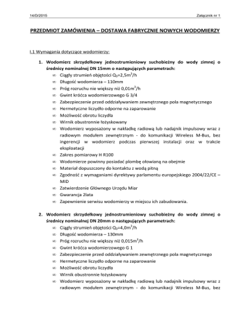 14/D/2015 Załącznik nr 1 PRZEDMIOT ZAMÓWIENIA – DOSTAWA FABRYCZNIE NOWYCH WODOMIERZY I.1 Wymagania dotyczące wodomierzy: 1. Wodomierz skrzydełkowy jednostrumieniowy suchobieżny do wody zimnej o średnicy nominalnej DN 15mm o następujących parametrach: • Ciągły strumień objętości Q3=2,5m3/h • Długość wodomierza – 110mm • Próg rozruchu nie większy niż 0,01m3/h • Gwint króćca wodomierzowego G 3/4 • Zabezpieczenie przed oddziaływaniem zewnętrznego pola magnetycznego • Hermetyczne liczydło odporne na zaparowanie • Możliwość obrotu liczydła • Wirnik obustronnie łożyskowany • Wodomierz wyposażony w nakładkę radiową lub nadajnik impulsowy wraz z radiowym modułem zewnętrznym - do komunikacji Wireless M-Bus, bez ingerencji w wodomierz podczas pierwszej instalacji oraz w trakcie eksploatacji • Zakres pomiarowy H R100 • Wodomierze powinny posiadać plombę ołowianą na obejmie • Materiał dopuszczony do kontaktu z wodą pitną • Zgodność z wymaganiami dyrektywy parlamentu europejskiego 2004/22/CE – MID • Zatwierdzenie Głównego Urzędu Miar • Gwarancja 2lata • Zapewnienie serwisu wodomierzy w miejscu ich zabudowania. 2. Wodomierz skrzydełkowy jednostrumieniowy suchobieżny do wody zimnej o średnicy nominalnej DN 20mm o następujących parametrach: • Ciągły strumień objętości Q3=4,0m3/h • Długość wodomierza – 130mm • Próg rozruchu nie większy niż 0,015m3/h • Gwint króćca wodomierzowego G 1 • Zabezpieczenie przed oddziaływaniem zewnętrznego pola magnetycznego • Hermetyczne liczydło odporne na zaparowanie • Możliwość obrotu liczydła • Wirnik obustronnie łożyskowany • Wodomierz wyposażony w nakładkę radiową lub nadajnik impulsowy wraz z radiowym modułem zewnętrznym - do komunikacji Wireless M-Bus, bez 14/D/2015 Załącznik nr 1 • • • • • • • ingerencji w wodomierz podczas pierwszej instalacji oraz w trakcie eksploatacji Zakres pomiarowy H R100 Wodomierze powinny posiadać plombę ołowianą na obejmie Materiał dopuszczony do kontaktu z wodą pitną Zgodność z wymaganiami dyrektywy parlamentu europejskiego 2004/22/CE – MID Zatwierdzenie Głównego Urzędu Miar Gwarancja 2lata Zapewnienie serwisu wodomierzy w miejscu ich zabudowania. 3. Wodomierz skrzydełkowy jednostrumieniowy suchobieżny do wody zimnej o średnicy nominalnej DN 25mm o następujących parametrach: • Ciągły strumień objętości Q3=10,0m3/h • Próg rozruchu nie większy niż 0,035m3/h • Długość wodomierza – 260mm • Gwint króćca wodomierzowego G 11/4 • Wirnik obustronnie łożyskowany • Zabezpieczenie przed oddziaływaniem zewnętrznego pola magnetycznego • Hermetyczne lub uszczelnione liczydło odporne na zaparowanie • Wodomierze powinny posiadać plombę ołowianą na obejmie • Możliwość obrotu liczydła • Wodomierz wyposażony w nakładkę radiową lub nadajnik impulsowy wraz z radiowym modułem zewnętrznym - do komunikacji Wireless M-Bus, bez ingerencji w wodomierz podczas pierwszej instalacji oraz w trakcie eksploatacji • Zakres pomiarowy H R100 • Materiał dopuszczony do kontaktu z wodą pitną • Zgodność z wymaganiami dyrektywy parlamentu europejskiego 2004/22/CE – MID • Zatwierdzenie Głównego Urzędu Miar • Gwarancja 2lata • Zapewnienie serwisu wodomierzy w miejscu ich zabudowania. 4. Wodomierz skrzydełkowy jednostrumieniowy suchobieżny do wody zimnej o średnicy nominalnej DN 32mm o następujących parametrach: • Ciągły strumień objętości Q3=10,0m3/h 14/D/2015 Załącznik nr 1 • • • • • • • • • • • • • • • Próg rozruchu nie większy niż 0,035m3/h Długość wodomierza – 260mm Gwint króćca wodomierzowego G 11/2 Wirnik obustronnie łożyskowany Zabezpieczenie przed oddziaływaniem zewnętrznego pola magnetycznego Hermetyczne lub uszczelnione liczydło odporne na zaparowanie Wodomierze powinny posiadać plombę ołowianą na obejmie Możliwość obrotu liczydła Wodomierz wyposażony w nakładkę radiową lub nadajnik impulsowy wraz z radiowym modułem zewnętrznym - do komunikacji Wireless M-Bus, bez ingerencji w wodomierz podczas pierwszej instalacji oraz w trakcie eksploatacji Zakres pomiarowy H R100 Materiał dopuszczony do kontaktu z wodą pitną Zgodność z wymaganiami dyrektywy parlamentu europejskiego 2004/22/CE – MID Zatwierdzenie Głównego Urzędu Miar Gwarancja 2lata Zapewnienie serwisu wodomierzy w miejscu ich zabudowania. 5. Wodomierz skrzydełkowy jednostrumieniowy suchobieżny do wody zimnej o średnicy nominalnej DN 40mm o następujących parametrach: • Ciągły strumień objętości Q3=16,0m3/h • Próg rozruchu nie większy niż 0,055m3/h • Długość wodomierza – 300mm • Gwint króćca wodomierzowego G 2 • Wirnik obustronnie łożyskowany • Zabezpieczenie przed oddziaływaniem zewnętrznego pola magnetycznego • Hermetyczne lub uszczelnione liczydło odporne na zaparowanie • Wodomierze powinny posiadać plombę ołowianą na obejmie • Możliwość obrotu liczydła • Wodomierz wyposażony w nakładkę radiową lub nadajnik impulsowy wraz z radiowym modułem zewnętrznym - do komunikacji Wireless M-Bus, bez ingerencji w wodomierz podczas pierwszej instalacji oraz w trakcie eksploatacji • Zakres pomiarowy H R100 • Materiał dopuszczony do kontaktu z wodą pitną • Zgodność z wymaganiami dyrektywy parlamentu europejskiego 2004/22/CE – MID • Zatwierdzenie Głównego Urzędu Miar 14/D/2015 Załącznik nr 1 • • Gwarancja 2lata Zapewnienie serwisu wodomierzy w miejscu ich zabudowania. 6. Wodomierz skrzydełkowy jednostrumieniowy suchobieżny kołnierzowy do wody zimnej o średnicy nominalnej DN 50mm o następujących parametrach: • Nominalny strumień objętości qp=15,0m3/h • Próg rozruchu nie większy niż 0,032m3/h • Klasa metrologiczna C • Długość wodomierza – 270mm • Wirnik obustronnie łożyskowany • Zabezpieczenie przed