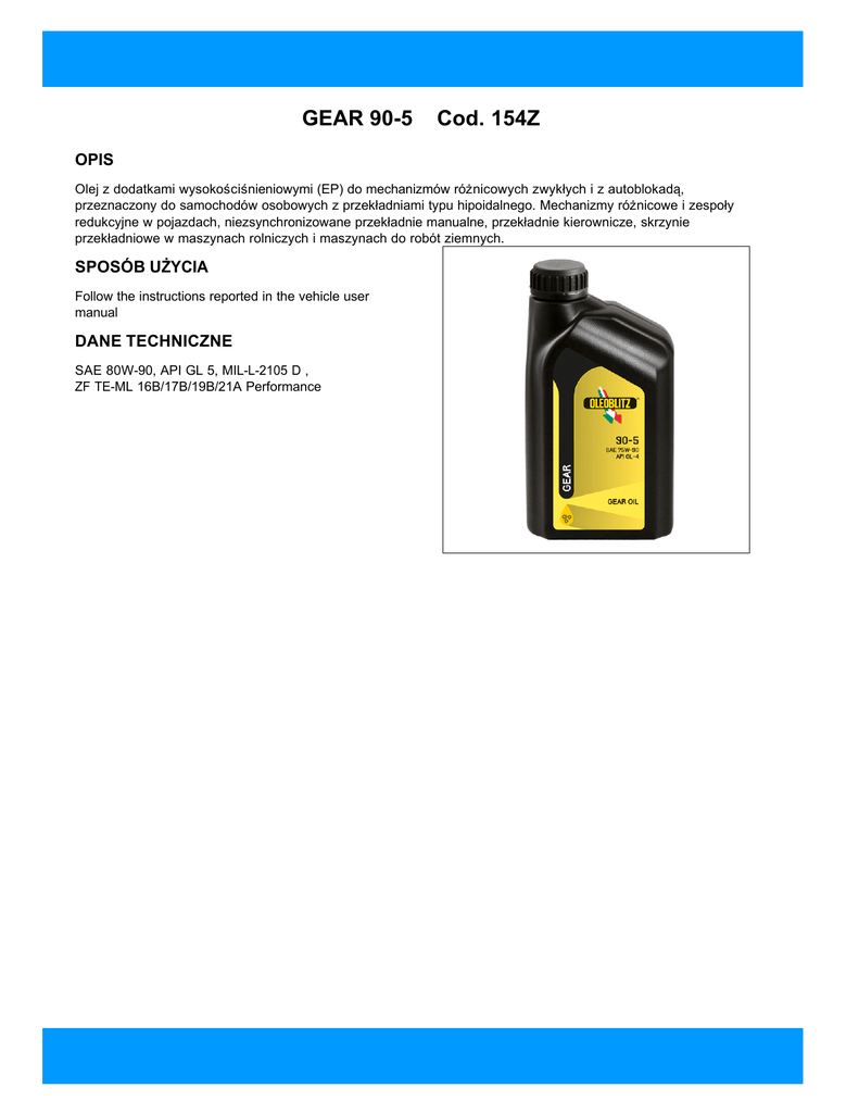 GEAR 90-5 Cod. 154Z OPIS Olej z dodatkami wysokościśnieniowymi (EP) do mechanizmów różnicowych zwykłych i z autoblokadą, przeznaczony do samochodów osobowych z przekładniami typu hipoidalnego. Mechanizmy różnicowe i zespoły redukcyjne w pojazdach, niezsynchronizowane przekładnie manualne, przekładnie kierownicze, skrzynie przekładniowe w maszynach rolniczych i maszynach do robót ziemnych. SPOSÓB UŻYCIA Follow the instructions reported in the vehicle user manual DANE TECHNICZNE SAE 80W-90, API GL 5, MIL-L-2105 D , ZF TE-ML 16B/17B/19B/21A Performance