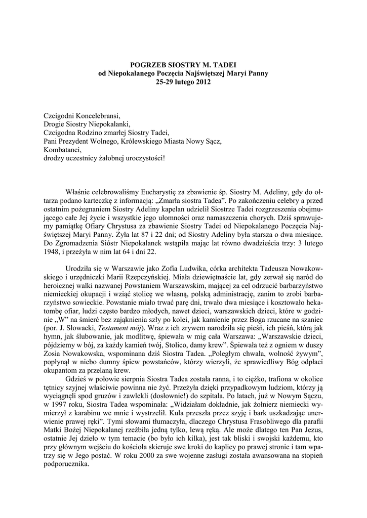 POGRZEB SIOSTRY M. TADEI od Niepokalanego Poczęcia Najświętszej Maryi Panny 25-29 lutego 2012 Czcigodni Koncelebransi, Drogie Siostry Niepokalanki, Czcigodna Rodzino zmarłej Siostry Tadei, Pani Prezydent Wolnego, Królewskiego Miasta Nowy Sącz, Kombatanci, drodzy uczestnicy żałobnej uroczystości! Właśnie celebrowaliśmy Eucharystię za zbawienie śp. Siostry M. Adeliny, gdy do ołtarza podano karteczkę z informacją: „Zmarła siostra Tadea”. Po zakończeniu celebry a przed ostatnim pożegnaniem Siostry Adeliny kapelan udzielił Siostrze Tadei rozgrzeszenia obejmującego całe Jej życie i wszystkie jego ułomności oraz namaszczenia chorych. Dziś sprawujemy pamiątkę Ofiary Chrystusa za zbawienie Siostry Tadei od Niepokalanego Poczęcia Najświętszej Maryi Panny. Żyła lat 87 i 22 dni; od Siostry Adeliny była starsza o dwa miesiące. Do Zgromadzenia Sióstr Niepokalanek wstąpiła mając lat równo dwadzieścia trzy: 3 lutego 1948, i przeżyła w nim lat 64 i dni 22. Urodziła się w Warszawie jako Zofia Ludwika, córka architekta Tadeusza Nowakowskiego i urzędniczki Marii Rzepczyńskiej. Miała dziewiętnaście lat, gdy zerwał się naród do heroicznej walki nazwanej Powstaniem Warszawskim, mającej za cel odrzucić barbarzyństwo niemieckiej okupacji i wziąć stolicę we własną, polską administrację, zanim to zrobi barbarzyństwo sowieckie. Powstanie miało trwać parę dni, trwało dwa miesiące i kosztowało hekatombę ofiar, ludzi często bardzo młodych, nawet dzieci, warszawskich dzieci, które w godzinie „W” na śmierć bez zająknienia szły po kolei, jak kamienie przez Boga rzucane na szaniec (por. J. Słowacki, Testament mój). Wraz z ich zrywem narodziła się pieśń, ich pieśń, którą jak hymn, jak ślubowanie, jak modlitwę, śpiewała w mig cała Warszawa: „Warszawskie dzieci, pójdziemy w bój, za każdy kamień twój, Stolico, damy krew”. Śpiewała też z ogniem w duszy Zosia Nowakowska, wspominana dziś Siostra Tadea. „Poległym chwała, wolność żywym”, popłynął w niebo dumny śpiew powstańców, którzy wierzyli, że sprawiedliwy Bóg odpłaci okupantom za przelaną krew. Gdzieś w połowie sierpnia Siostra Tadea została ranna, i to ciężko, trafiona w okolice tętnicy szyjnej właściwie powinna nie żyć. Przeżyła dzięki przypadkowym ludziom, którzy ją wyciągnęli spod gruzów i zawlekli (dosłownie!) do szpitala. Po latach, już w Nowym Sączu, w 1997 roku, Siostra Tadea wspominała: „Widziałam dokładnie, jak żołnierz niemiecki wymierzył z karabinu we mnie i wystrzelił. Kula przeszła przez szyję i bark uszkadzając unerwienie prawej ręki”. Tymi słowami tłumaczyła, dlaczego Chrystusa Frasobliwego dla parafii Matki Bożej Niepokalanej rzeźbiła jedną tylko, lewą ręką. Ale może dlatego ten Pan Jezus, ostatnie Jej dzieło w tym temacie (bo było ich kilka), jest tak bliski i swojski każdemu, kto przy głównym wejściu do kościoła skieruje swe kroki do kaplicy po prawej stronie i tam wpatrzy się w Jego postać. W roku 2000 za swe wojenne zasługi została awansowana na stopień podporucznika. Talent rzeźbiarski Zosia odziedziczyła po ojcu, architekcie o duszy artysty. Jako nastolatka wraz z nim wykonała dużych wymiarów tzw. szopkę krakowską (Jej dziełem były różne drobne figurki), a samodzielnie płaskorzeźbę św. Jerzego. Zasad rysunku i rzeźby uczyła się jednak dopiero po wojnie u Zofii Trzcińskiej-Kamińskiej (1890-1977), zasłużonej rzeźbiarki i medalierki, w roku 1915 żołnierza II Brygady Legionów. Dziełem Siostry Tadei jest także piękna, jakoby nieukończona, figura Pana Jezusa leżącego w grobie; pomyślimy czule o Jego twórczyni w najbliższy Wielki Piątek, w czterdziesty drugi dzień od Jej śmierci. Jej dziełem jest też biała figura Matki Bożej z Dzieciątkiem w wirydarzu klasztornym (można ją oglądać z korytarza na wprost wejścia do kaplicy). Szczególnie sugestywna jest samo Dzieciątko, które wyrywa się Mamie z rąk, jakby chciało rzucić się w ramiona Tej, która Mu dała rzeźbiarskie życie. Wspomnijmy jeszcze, dla porządku, i ambonkę, z której czytujemy Słowo Boże. To też Jej dzieło. Niechże więc sławią Siostrę Tadeę te i inne Jej dzieła, rzeźby, w większości bardzo drobne, utrwalone zaledwie w stadium projektowania, oraz akwarele i rysunki. Niech Ją też sławi kilkuletnie przykucie do łóżka, oczyszczające, pod troskliwą opieką sióstr, ze wszystkiego, co ziemskie, niedoskonałe, niegodne pokazania się Bogu. Niechże przeświadczenie Hioba z dzisiejszej liturgii będzie Jej przeświadczeniem: Ja wiem, Bóg, Wybawca mój żyje! On moje szczątki znów ciałem odzieje i tak to ja Boga zobaczę. Amen. Ks. Prałat Ryszard Kurek