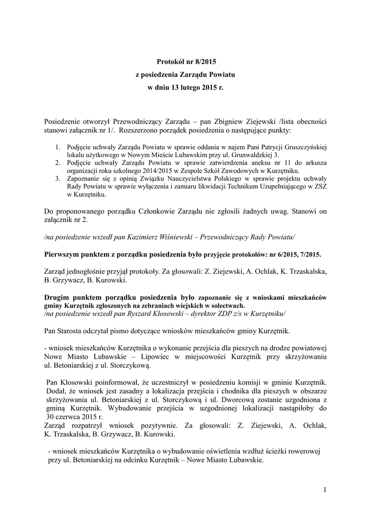 1 Protokół nr 8/2015 z posiedzenia Zarządu Powiatu w dniu 13