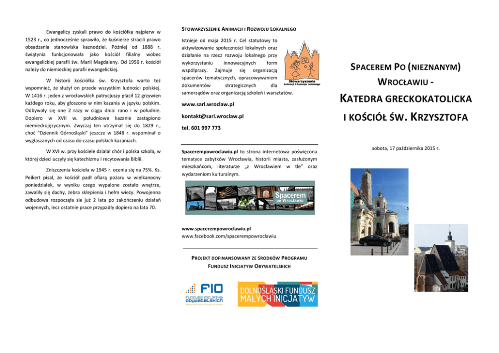 Ewangelicy zyskali prawo do kościółka najpierw w 1523 r., co jednocześnie sprawiło, że kuśnierze stracili prawo obsadzania stanowiska kaznodziei. Później od 1888 r. świątynia funkcjonowała jako kościół filialny wobec ewangelickiej parafii św. Marii Magdaleny. Od 1956 r. kościół należy do niemieckiej parafii ewangelickiej. W historii kościółka św. Krzysztofa warto też wspomnieć, że służył on przede wszystkim ludności polskiej. W 1416 r. jeden z wrocławskich patrycjuszy płacił 12 grzywien każdego roku, aby głoszono w nim kazania w języku polskim. Odbywały się one 2 razy w ciągu dnia: rano i w południe. Dopiero w XVII w. południowe kazanie zastąpiono niemieckojęzycznym. Zwyczaj ten utrzymał się do 1829 r., choć "Dziennik Górnośląski" jeszcze w 1848 r. wspominał o wygłaszanych od czasu do czasu polskich kazaniach. W XVI w. przy kościele działał chór i polska szkoła, w której dzieci uczyły się katechizmu i recytowania Biblii. Zniszczenia kościoła w 1945 r. ocenia się na 75%. Ks. Peikert pisał, że kościół padł ofiarą pożaru w wielkanocny poniedziałek, w wyniku czego wypalone zostało wnętrze, zawaliły się dachy, żebra sklepienia i hełm wieży. Powojenna odbudowa rozpoczęła sie już 2 lata po zakończeniu działań wojennych, lecz ostatnie prace przypadły dopiero na lata 70. STOWARZYSZENIE ANIMACJI I ROZWOJU LOKALNEGO Istnieje od maja 2015 r. Cel statutowy to aktywizowanie społeczności lokalnych oraz działanie na rzecz rozwoju lokalnego przy wykorzystaniu innowacyjnych form współpracy. Zajmuje się organizacją spacerów tematycznych, opracowywaniem dokumentów strategicznych dla samorządów oraz organizacją szkoleń i warsztatów. www.sarl.wroclaw.pl [email protected] SPACEREM PO (NIEZNANYM) WROCŁAWIU - KATEDRA GRECKOKATOLICKA I KOŚCIÓŁ ŚW. KRZYSZTOFA tel. 601 997 773 Spacerempowroclawiu.pl to strona internetowa poświęcona tematyce zabytków Wrocławia, historii miasta, zasłużonym mieszkańcom, literaturze „z Wrocławiem w tle” oraz wydarzeniom kulturalnym. www.spacerempowroclawiu.pl www.facebook.com/spacerempowroclawiu PROJEKT DOFINANSOWANY ZE ŚRODKÓW PROGRAMU FUNDUSZ INICJATYW OBYWATELSKICH sobota, 17 października 2015 r. Katedra greckokatolicka Kiedy do Wrocławia w 1226 r. przybyli franciszkanie, książę Henryk Pobożny ufundował dla nich kościół i klasztor pw. św. Jakuba właśnie przy pl. Nankiera 15. W 1241 r., gdy miasto najechali Tatarzy, budowa świątyni jeszcze trwała. Po śmierci księcia jego dzieło dokończyła więc księżna Anna, pozyskując na ten cel środki ze sprzedaży kosztowności po poległym mężu. W prezbiterium romańskiego kościoła początkowo spoczęły zwłoki Henryka, a w 1380 r. ustawiono tam jego sarkofag. W kolejnych latach w kościele św. Jakuba odprawiano msze za duszę księcia. Rozbudowa kościoła św. Jakuba do obecnego kształtu rozpoczęła się na początku XIV w. i trwała bardzo długo z powodu braku środków finansowych. Budowę nowego prezbiterium udało się dokończyć dzięki ofiarności mieszczanina Tylo i jego żony. Po śmierci został on nawet pochowany przed ufundowanym przez siebie ołtarzem. W 1529 r. franciszkanie zostali przeniesieni do opuszczonego klasztoru św. Doroty przy ul. Świdnickiej, a klasztor i kościół przy pl. Nankiera trafiły do premonstratensów z opactwa św. Wincentego w Ołbinie. Nowi właściciele zmienili wezwanie kościoła na św. Wincentego. Ze względu na trudną sytuacją finansową, nie remontowali swojej świątyni. Poprawa nastąpiła dopiero w 2. poł. XVII w., kiedy to odnowiono sarkofag księcia, zainstalowano nowe organy, zamontowano rzeźbione stalle, tabernakulum czy ambona. Kościół ozdabiały obrazy Michaela Willmanna. W latach 1723-1727 w miejscu zburzonej starej kaplicy (po południowej stronie kościoła) powstała kaplica Matki Boskiej Bolesnej. Fundatorem był ówczesny opat klasztoru, Ferdinand von Hochberg. Kaplica otrzymała bogaty wystrój, m.in. freski pod kopułą ze scenami z życia Matki Boskiej, piękną kratę, "Pietę" w ołtarzu oraz figury św. Barbary czy św. Jana Nepomucena. Po sekularyzacji w 1810 r. klasztor przekazano na siedzibę Wyższego Sądu Krajowego, a kościół stał się świątynią parafialną. Obecnie w klasztorze mieści się Wydział Filologiczny Uniwersytetu Wrocławskiego. Zniszczenia kościoła i klasztoru w wyniku działań wojennych oceniano na 75%. Wieżę trafił pocisk, a spadający gruz uszkodził ścianę chóru. Pożar strawił dachy, ponadto w jego efekcie runęły sklepienia. Został jednak odbudowany, zachowując swój zasadniczy kształt. W 1997 r. podczas Kongresu Eucharystycznego papież Jan Paweł II przekazał kościół Eparchii WrocławskoGdańskiej Ukraińskiego Kościoła Greckokatolickiego, która uczyniła z niego swoją katedrę. Wówczas zmieniono także wezwanie kościoła - na Podwyższenia Krzyża Pańskiego. Kościół pw. św. Krzysztofa Zanim na pl. św. Krzysztofa stanął obecny kościół, znajdowała się tu kaplica pw. św. Marii Egipcjanki, pełniąca rolę kaplicy pogrzebowej kościoła parafialnego św. Marii Magdaleny. Świątynia była silnie powiązana z zamożnym i znaczącym cechem kuśnierzy, którego członkowie zamieszkiwali okolice dzisiejszej ul. Oławskiej. Przekazywali oni spore środki na wyposażenie kościoła, m.in. ołtarz. Z 1405 r. pochodzi umowa z mistrzem Henrykiem z Ząbkowic na wykonanie sklepienia sieciowego (forma nieznana raczej we wrocławskich świątyniach). Dzięki rozbudowie kościół uzyskał dzisiejszą formę, a następnie zmienił wezwanie na św. Krzysztofa. W 1461 r. po stronie zachodniej kościoła została zbudowana wieża. Wzniesiono ją na planie kwadratu i zwieńczono ostrosłupowym hełmem o drewnianej konstrukcji, lecz pokrytym ołowianą blachą. W sześciopiętrowej konstrukcji kolejne kondygnacje oznaczono gzymsami. W 1539 r. kościół otrzymał zegar
