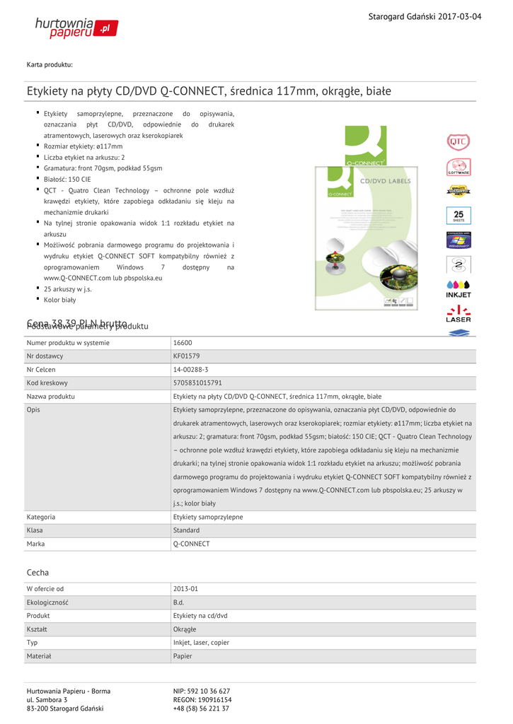 Starogard Gdański 2017-03-04 Karta produktu: Etykiety na płyty CD/DVD Q-CONNECT, średnica 117mm, okrągłe, białe Etykiety oznaczania samoprzylepne, płyt przeznaczone CD/DVD, do odpowiednie opisywania, do drukarek atramentowych, laserowych oraz kserokopiarek Rozmiar etykiety: ø117mm Liczba etykiet na arkuszu: 2 Gramatura: front 70gsm, podkład 55gsm Białość: 150 CIE QCT - Quatro Clean Technology – ochronne pole wzdłuż krawędzi etykiety, które zapobiega odkładaniu się kleju na mechanizmie drukarki Na tylnej stronie opakowania widok 1:1 rozkładu etykiet na arkuszu Możliwość pobrania darmowego programu do projektowania i wydruku etykiet Q-CONNECT SOFT kompatybilny również z oprogramowaniem Windows 7 dostępny na www.Q-CONNECT.com lub pbspolska.eu 25 arkuszy w j.s. Kolor biały Cena 38,39parametry PLN brutto Podstawowe produktu Numer produktu w systemie 16600 Nr dostawcy KF01579 Nr Celcen 14-00288-3 Kod kreskowy 5705831015791 Nazwa produktu Etykiety na płyty CD/DVD Q-CONNECT, średnica 117mm, okrągłe, białe Opis Etykiety samoprzylepne, przeznaczone do opisywania, oznaczania płyt CD/DVD, odpowiednie do drukarek atramentowych, laserowych oraz kserokopiarek; rozmiar etykiety: ø117mm; liczba etykiet na arkuszu: 2; gramatura: front 70gsm, podkład 55gsm; białość: 150 CIE; QCT - Quatro Clean Technology – ochronne pole wzdłuż krawędzi etykiety, które zapobiega odkładaniu się kleju na mechanizmie drukarki; na tylnej stronie opakowania widok 1:1 rozkładu etykiet na arkuszu; możliwość pobrania darmowego programu do projektowania i wydruku etykiet Q-CONNECT SOFT kompatybilny również z oprogramowaniem Windows 7 dostępny na www.Q-CONNECT.com lub pbspolska.eu; 25 arkuszy w j.s.; kolor biały Kategoria Etykiety samoprzylepne Klasa Standard Marka Q-CONNECT Cecha W ofercie od 2013-01 Ekologiczność B.d. Produkt Etykiety na cd/dvd Kształt Okrągłe Typ Inkjet, laser, copier Materiał Papier Hurtowania Papieru - Borma ul. Sambora 3 83-200 Starogard Gdański NIP: 592 10 36 627 REGON: 190916154 +48 (58) 56 221 37 Starogard Gdański 2017-03-04 Karta katalogowa produktu cd. Etykiety na płyty CD/DVD Q-CONNECT, średnica 117mm, okrągłe, białe Wymiary Wymiary (mm) Średnica: 117 Gramatura (g/m2) 70/55 Wspólny słownik zamówień CPV 30192800-9 Etykiety samoprzylepne Certyfikaty Nowy produkt w ofercie Standard Hit Standard Ilość Ilość arkuszy 25 Ilość etykiet na arkuszu 2 Kolor Kolor Biały Serdecznie zapraszamy do współpracy Hurtowania Papieru - Borma zespół. Hurtowania Papieru - Borma ul. Sambora 3 83-200 Starogard Gdański NIP: 592 10 36 627 REGON: 190916154 +48 (58) 56 221 37