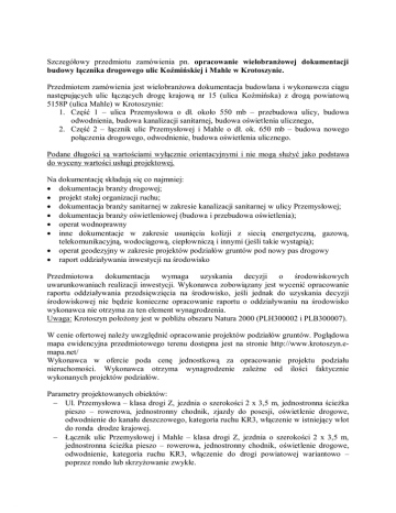 Szczegółowy przedmiotu zamówienia pn. opracowanie wielobranżowej dokumentacji budowy łącznika drogowego ulic Koźmińskiej i Mahle w Krotoszynie. Przedmiotem zamówienia jest wielobranżowa dokumentacja budowlana i wykonawcza ciągu następujących ulic łączących drogę krajową nr 15 (ulica Koźmińska) z drogą powiatową 5158P (ulica Mahle) w Krotoszynie: 1. Część 1 – ulica Przemysłowa o dł. około 550 mb – przebudowa ulicy, budowa odwodnienia, budowa kanalizacji sanitarnej, budowa oświetlenia ulicznego, 2. Część 2 – łącznik ulic Przemysłowej i Mahle o dł. ok. 650 mb – budowa nowego połączenia drogowego, odwodnienie, budowa oświetlenia ulicznego. Podane długości są wartościami wyłącznie orientacyjnymi i nie mogą służyć jako podstawa do wyceny wartości usługi projektowej. Na dokumentację składają się co najmniej: • dokumentacja branży drogowej; • projekt stałej organizacji ruchu; • dokumentacja branży sanitarnej w zakresie kanalizacji sanitarnej w ulicy Przemysłowej; • dokumentacja branży oświetleniowej (budowa i przebudowa oświetlenia); • operat wodnoprawny • inne dokumentacje w zakresie usunięcia kolizji z siecią energetyczną, gazową, telekomunikacyjną, wodociągową, ciepłowniczą i innymi (jeśli takie wystąpią); • operat geodezyjny w zakresie projektów podziałów gruntów pod nowy pas drogowy • raport oddziaływania inwestycji na środowisko Przedmiotowa dokumentacja wymaga uzyskania decyzji o środowiskowych uwarunkowaniach realizacji inwestycji. Wykonawca zobowiązany jest wycenić opracowanie raportu oddziaływania przedsięwzięcia na środowisko, jeśli jednak do uzyskania decyzji środowiskowej nie będzie konieczne opracowanie raportu o oddziaływaniu na środowisko wykonawca nie otrzyma za ten element wynagrodzenia. Uwaga: Krotoszyn położony jest w pobliżu obszaru Natura 2000 (PLH300002 i PLB300007). W cenie ofertowej należy uwzględnić opracowanie projektów podziałów gruntów. Poglądowa mapa ewidencyjna przedmiotowego terenu dostępna jest na stronie http://www.krotoszyn.emapa.net/ Wykonawca w ofercie poda cenę jednostkową za opracowanie projektu podziału nieruchomości. Wykonawca otrzyma wynagrodzenie zależne od ilości faktycznie wykonanych projektów podziałów. Parametry projektowanych obiektów: − Ul. Przemysłowa – klasa drogi Z, jezdnia o szerokości 2 x 3,5 m, jednostronna ścieżka pieszo – rowerowa, jednostronny chodnik, zjazdy do posesji, oświetlenie drogowe, odwodnienie do kanału deszczowego, kategoria ruchu KR3, włączenie w istniejący wlot do ronda drodze krajowej. − Łącznik ulic Przemysłowej i Mahle – klasa drogi Z, jezdnia o szerokości 2 x 3,5 m, jednostronna ścieżka pieszo – rowerowa, jednostronny chodnik, oświetlenie drogowe, odwodnienie, kategoria ruchu KR3, włączenie do drogi powiatowej wariantowo – poprzez rondo lub skrzyżowanie zwykłe. − Kanalizacja sanitarna – zgodnie z pismem PGKiM w Krotoszynie znak 4409/12/2015 z 2.12.2015r. Przedmiotowy teren nie jest objęty Miejscowym Planem Zagospodarowania Przestrzennego. Wykonawca zobowiązany jest uzyskać wszelkie niezbędne uzgodnienia i opinie oraz zezwolenie na realizację inwestycji drogowej – dotyczy zakresu drogowego z odwodnieniem, oświetlenia drogowego oraz usunięcia kolizji. Wykonawca zobowiązany jest uzyskać pozwolenie na budowę – dotyczy sieci kanalizacyjnej w ul. Przemysłowej. Zamawiającemu należy dostarczyć: • Projekty wykonawcze branżowe – 6 egz. projektu każdej branży • Projekty budowlane – 2 egz. projektu każdej branży • Przedmiary robót – 2 egz. każdej branży • Kosztorysy inwestorskie i ofertowe - 2 egz. każdej branży • Szczegółową Specyfikację Techniczną Wykonania i Odbioru Robót - 2 egz. każdej branży • Operat geodezyjny w zakresie projektów podziałów gruntów • Raport oddziaływania na środowisko (jeśli będzie wymagany) – 2 egz. • Operat wodnoprawny – 2 egz. Wykonawca ponadto dostarczy w/w opracowania w wersji elektronicznej w formacie pdf i formacie edytowalnym (dotyczy przedmiarów robót i kosztorysów ofertowych) Wykonawca zobowiązany jest do comiesięcznego przedstawiania w siedzibie zamawiającego szczegółowego raportu z postępu prac Załączniki: 1. Mapa poglądowa projektowanego ciągu. Opracował: Wydz. Inwestycji i Rozwoju UM Powiatowy Zarząd Dróg Zatwierdził: Burmistrz Krotoszyna Starosta Krotoszyński …………………… …………………… …………………... ……………………
