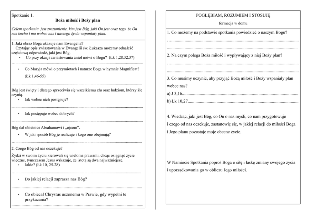 Spotkanie 1. POGŁĘBIAM, ROZUMIEM I STOSUJĘ Boża miłość i Boży plan Celem spotkania jest zrozumienie, kim jest Bóg, jaki On jest oraz tego, że On nas kocha i ma wobec nas i naszego życia wspaniały plan. 1. Jaki obraz Boga ukazuje nam Ewangelia? Czytając opis zwiastowania w Ewangelii św. Łukasza możemy odnaleźć częściową odpowiedź, jaki jest Bóg. • Co przy okazji zwiastowania anioł mówi o Bogu? (Łk 1,28.32.37) ….............................................................................................................................. • formacja w domu 1. Co możemy na podstawie spotkania powiedzieć o naszym Bogu? …................................................................................................................... ...................................................................................................................... 2. Na czym polega Boża miłość i wypływający z niej Boży plan? …................................................................................................................... Co Maryja mówi o przymiotach i naturze Boga w hymnie Magnificat? ....................................................................................................................... (Łk 1,46-55) 3. Co musimy uczynić, aby przyjąć Bożą miłość i Boży wspaniały plan ................................................................................................................................ Bóg jest święty i dlatego sprzeciwia się wszelkiemu złu oraz ludziom, którzy źle czynią. • Jak wobec nich postępuje? wobec nas? a) J 3,16......................................................................................................... b) Łk 10,27.................................................................................................... .................................................................................................................................. • Jak postępuje wobec dobrych? .................................................................................................................................. Bóg dał obietnice Abrahamowi i „ojcom”. • W jaki sposób Bóg je realizuje i kogo one obejmują? 4. Wiedząc, jaki jest Bóg, co On o nas myśli, co nam przygotowuje i czego od nas oczekuje, zastanowię się, w jakiej relacji do miłości Boga i Jego planu pozostaje moje obecne życie. …............................................................................................................................. 2. Czego Bóg od nas oczekuje? Żydzi w swoim życiu kierowali się wieloma prawami, chcąc osiągnąć życie wieczne, tymczasem Jezus wskazuje, że istotą są dwa najważniejsze. • Jakie? (Łk 10, 25-28) …............................................................................................................................ • Do jakiej relacji zaprasza nas Bóg? ...................................................................................................................... Co obiecał Chrystus uczonemu w Prawie, gdy wypełni te przykazania? ....................................................................................................................... • W Namiocie Spotkania poproś Boga o siłę i łaskę zmiany swojego życia i uporządkowania go w obliczu Jego miłości.