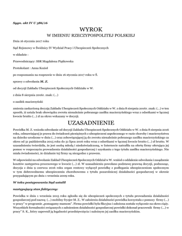 Sygn. akt IV U 386/16 WYROK W IMIENIU RZECZYPOSPOLITEJ POLSKIEJ Dnia 16 stycznia 2017 roku Sąd Rejonowy w Świdnicy IV Wydział Pracy i Ubezpieczeń Społecznych w składzie : Przewodniczący: SSR Magdalena Piątkowska Protokolant : Anna Kozioł po rozpoznaniu na rozprawie w dniu 16 stycznia 2017 roku w Ś. sprawy z odwołania M. Z. od decyzji Zakładu Ubezpieczeń Społecznych Oddziału w W. z dnia 8 sierpnia 2016r. znak: (...) o zasiłek macierzyński zmienia zaskarżoną decyzję Zakładu Ubezpieczeń Społecznych Oddziału w W. z dnia 8 sierpnia 2016r. znak: (...) w ten sposób, iż ustala brak obowiązku zwrotu nienależnie pobranego zasiłku macierzyńskiego wraz z odsetkami w łącznej kwocie brutto (...) zł za okres wskazany w decyzji. UZASADNIENIE Powódka M. Z. wniosła odwołanie od decyzji Zakładu Ubezpieczeń Społecznych Oddziału w W. z dnia 8 sierpnia 2016 roku, odmawiającej je prawa do świadczeń pieniężnych z ubezpieczeni aspołecznego w razie choroby i macierzyństwa na dziecko urodzone w dniu (...) oraz zobowiązującej ją do zwrotu nienależnie pobranego zasiłku macierzyńskiego za okres od 31 października 2015 roku do 31 lipca 2016 roku wraz z odsetkami w łącznej kwocie brutto (...) zł brutto. W uzasadnieniu twierdziła, że jest osobą młodą i niedoświadczoną, w Internecie natrafiła na ofertę firmy oferująca jej pomoc w rozpoczęciu prowadzenia działalności gospodarczej i uzyskaniu z tego tytułu zasiłku macierzyńskiego. Nie miała świadomości, że działanie tej firmy są niezgodne z prawem. W odpowiedzi na odwołanie Zakład Ubezpieczeń Społecznych Oddział w W. wniósł o oddalenie odwołania i zasądzenie kosztów zastępstwa procesowego w kwocie (...) zł. W uzasadnieniu powołano podstawę prawną decyzji, podnosząc, decyzja z dnia 9 czerwca 2016 roku organ rentowy wyłączył powódkę z podlegania ubezpieczeniom społecznym w tym dobrowolnemu ubezpieczeniu chorobowemu z tytułu pozarolniczej działalności gospodarczej w okresie przypadającym po dniu 1 września 2009 roku. W toku postępowania Sąd ustalił następujący stan faktyczny: Powódka w dniu 1 września 2015 roku zgłosiła się do ubezpieczeń społecznych z tytułu prowadzenia działalności gospodarczej pod nazwą (...) mobilny fryzjer M. Z.. W założeniu działalności powódka korzystała z pomocy firmy (...) w pracy” w programie „pomagamy mamom”. Firma powódki była fikcyjna i założona została wyłącznie na okres ciąży. Wszystkich formalności związanych z założeniem działalności gospodarczej powódki dokonał pracownik firmy (...) w pracy” S. K., który zapewnił ją legalności przedsięwzięcia i należnym jej zasiłku macierzyńskim. W trakcie prowadzonego postępowania wyjaśniającego organ rentowy ustalił, że zgłoszenie się powódki do ubezpieczeń społecznych z tytułu rozpoczęcia prowadzenia pozarolniczej działalności i w krótkim czasie wystąpienie z roszczeniem o wypłatę zasiłku chorobowego oraz zdeklarowanie podstawy wymiaru składek na ubezpieczenia emerytalne, rentowe, chorobowe i wypadkowe za wrzesień 2015 rok w wysokości (...) zł zmierzało do uzyskania zawyżonych świadczeń z ubezpieczenia chorobowego. Decyzją z dnia 9 czerwca 2016 roku Zakład Ubezpieczeń Społecznych Oddział w W. Inspektorat w K. stwierdził, że M. Z. jako osoba prowadząca pozarolniczą działalność gospodarczą nie podlega obowiązkowo ubezpieczeniom emerytalnemu, rentowym, wypadkowemu i dobrowolnie ubezpieczeniu chorobowemu od dnia 1 września 2015 roku. W dniu (...) roku powódka urodziła dziecko. Decyzją z dnia 8 sierpnia 2016 roku znak (...) Zakład Ubezpieczeń Społecznych Oddział w W. odmówił powódce prawa do świadczeń pieniężnych z ubezpieczenia społecznego w razie choroby i macierzyństwa na dziecko urodzone w dniu (...) i zobowiązał ją do zwrotu nienależnie pobranego zasiłku macierzyńskiego za okres od 31 października 2015 roku do 31 lipca 2016 roku wraz z odsetkami w łącznej kwocie brutto (...) zł. Dowód: - akta ZUS – w załączeniu; - zeznania powódki M. Z. – e protokół z dnia 16.01.2017 r . k. 31. W tak ustalonym stanie faktycznym sąd zważył: Odwołanie podlegało uwzględnieniu. Zgodnie z art. 84 ustawy z dnia 13 października 1998 roku o systemie ubezpieczeń społecznych (Dz. U. z 2015 roku , poz. 121 ze zmianami) osoba, która pobrała nienależne świadczenie z ubezpieczeń społecznych, jest obowiązana do jego zwrotu, wraz z odsetkami, w wysokości i na zasadach określonych przepisami prawa cywilnego, z uwzględnieniem ust. 11. Zgodnie zaś z art. 84 ust 2 powyżej cytowanej ustawy za kwoty nienależnie pobranych świadczeń uważane są: 1) świadczenia, które zostały wypłacone pomimo zaistnienia okoliczności powodujących: a) ustanie prawa do świadczeń, b) wstrzymanie wypłaty świadczeń w całości lub w części, jeżeli osoba pobierająca świadczenie była pouczona o braku prawa do ich pobierania; 2) świadczenia przyznane lub wypłacone na podstawie nieprawdziwych zeznań lub fałszywych dokumentów albo w innych przypadkach świadomego wprowadzenia w błąd organu wypłacającego świadczenia przez osobę pobierającą świadczenia. Przepis ten, ustanawiając obowiązek zwrotu świadczenia przez osobę, która pobrała nienależne świadczenie, wskazuje istotną cechę nienależnie pobranego świadczenia w ujęciu u.s.u.s, tj. świadomość (złą wiarę) osoby pobierającej świadczenie co do nieprzysługiwania tego świadczenia w całości lub w części od początku albo w następstwie później zaszłych zdarzeń. Obowiązek zwrotu świadczenia obciąża więc tylko tego, kto przyjął świadczenie w złej wierze, mając świadomość jego nienależności. Dotyczy to zarówno osoby, która została pouczona o okolicznościach dotyczących braku prawa do pobierania świadczenia (art. 84 ust. 2 pkt 1 u.s.u.s.), jak i osoby, która uzyskała świadczenie na podst